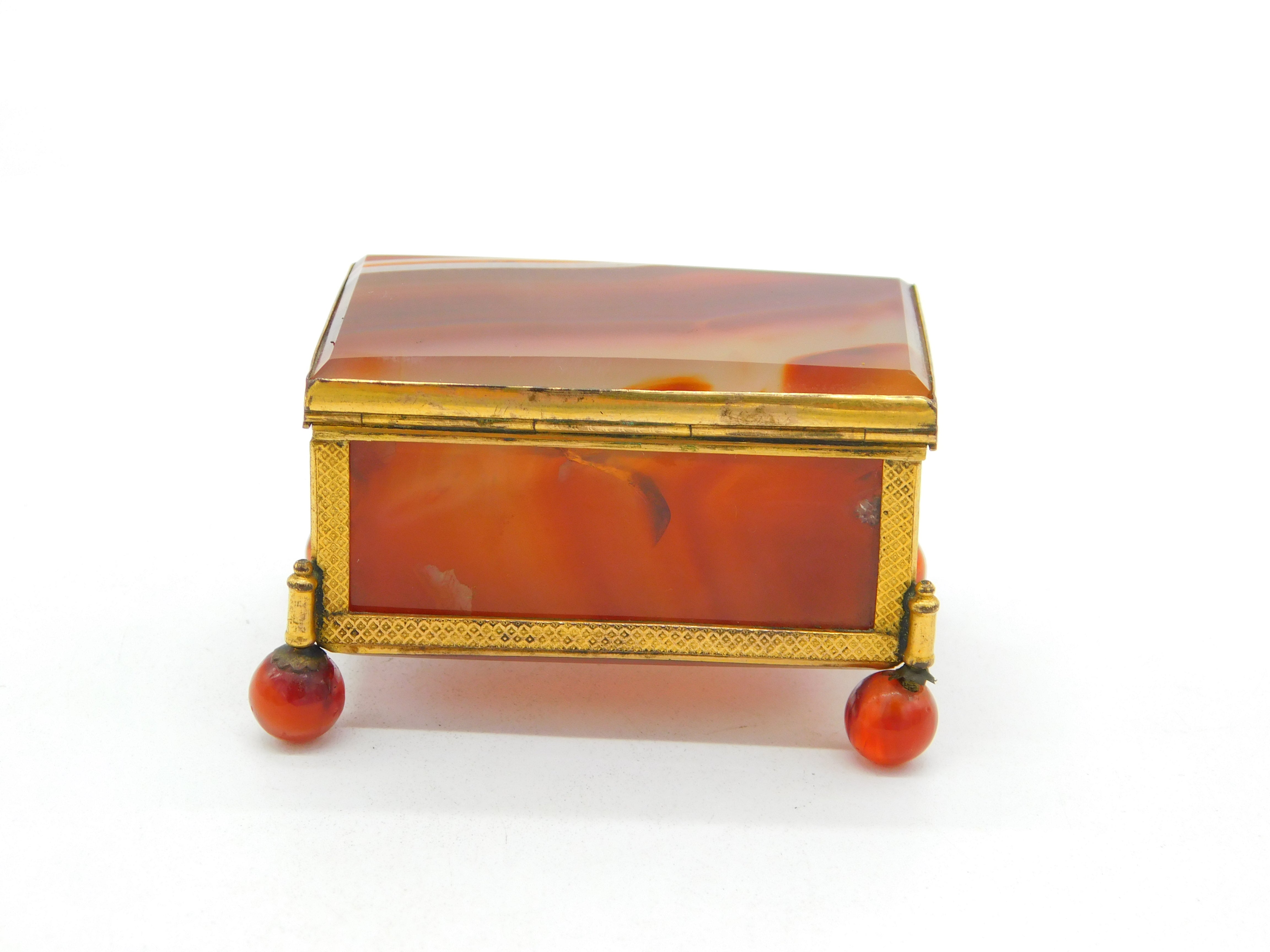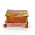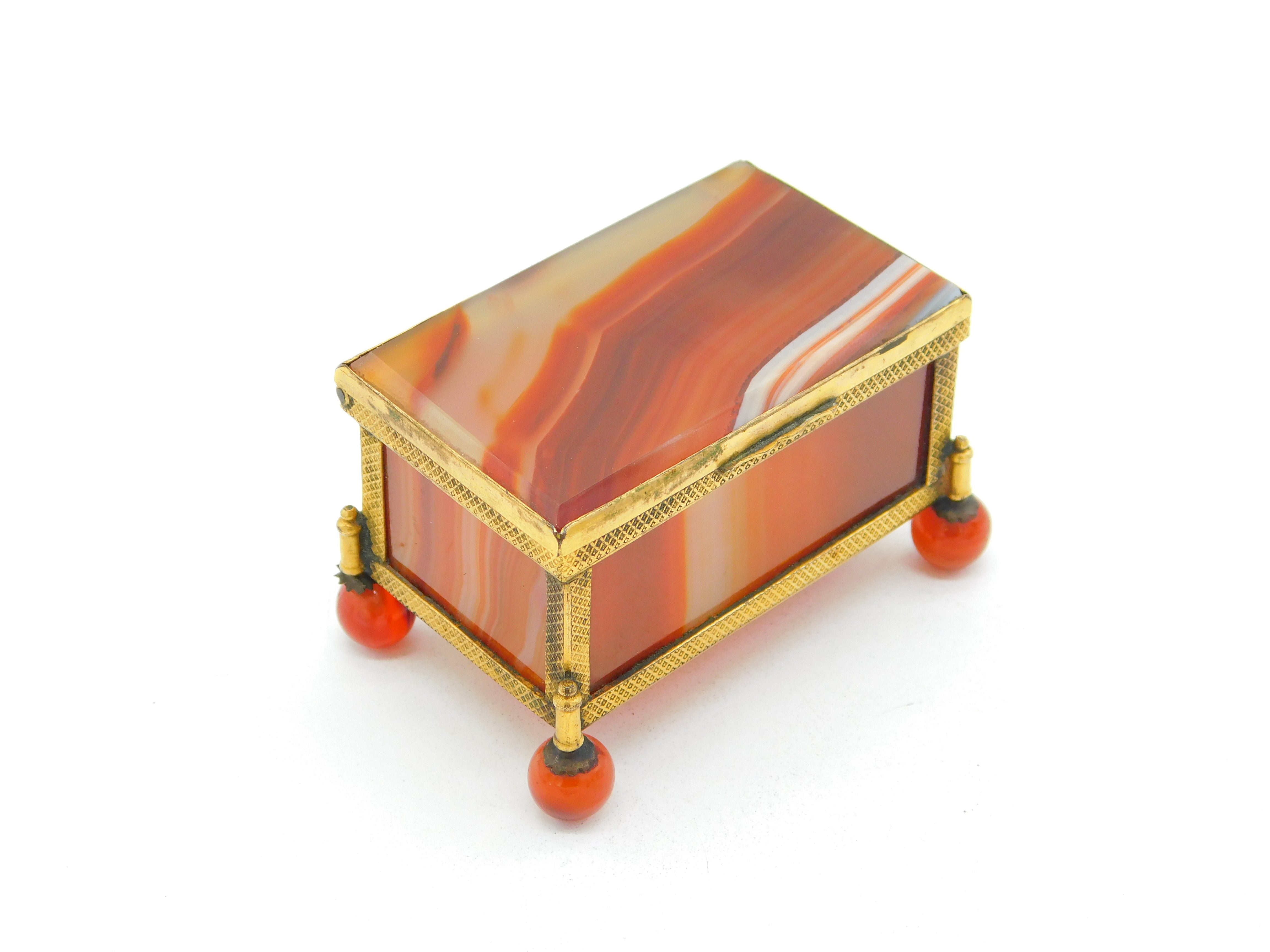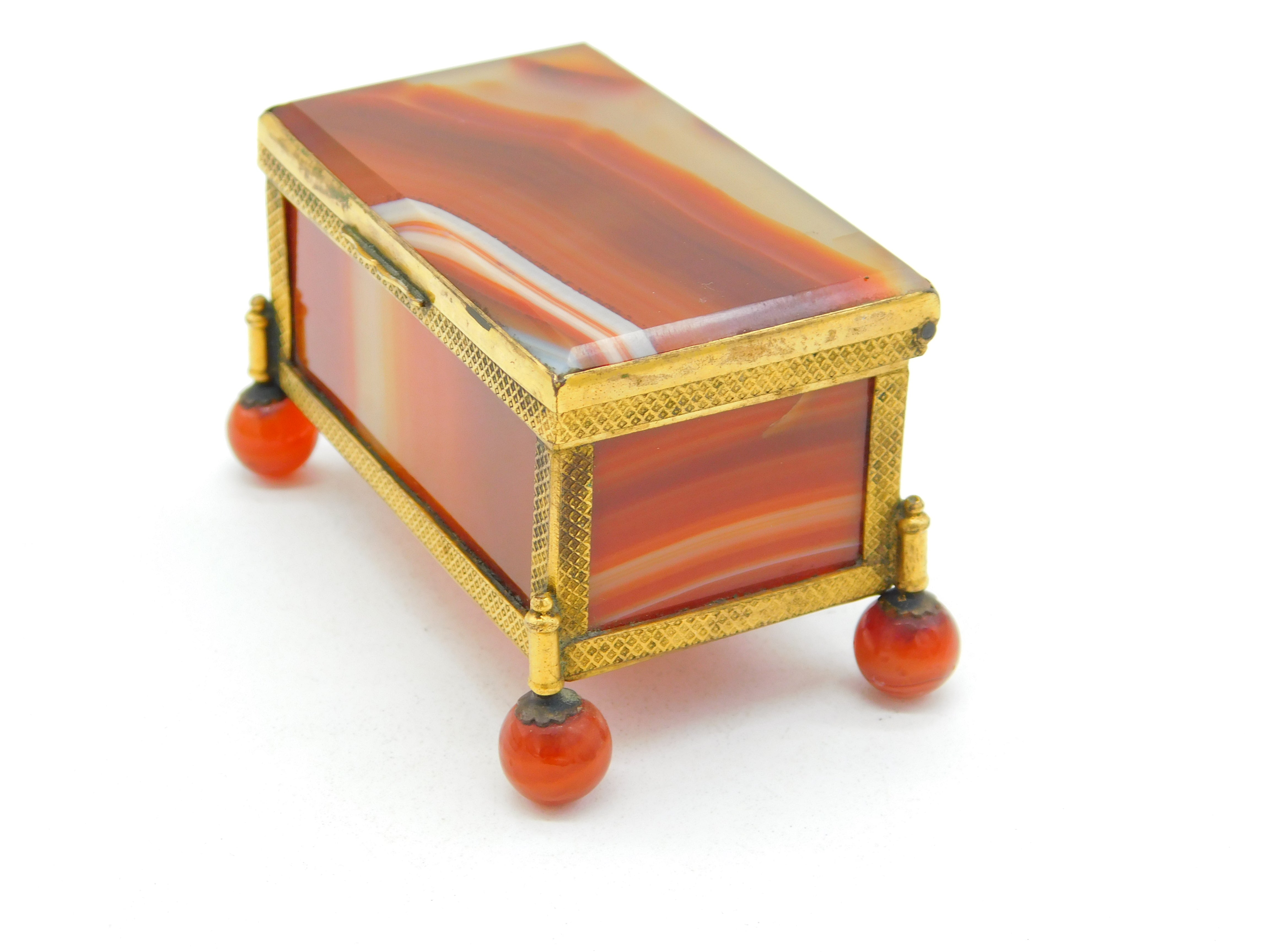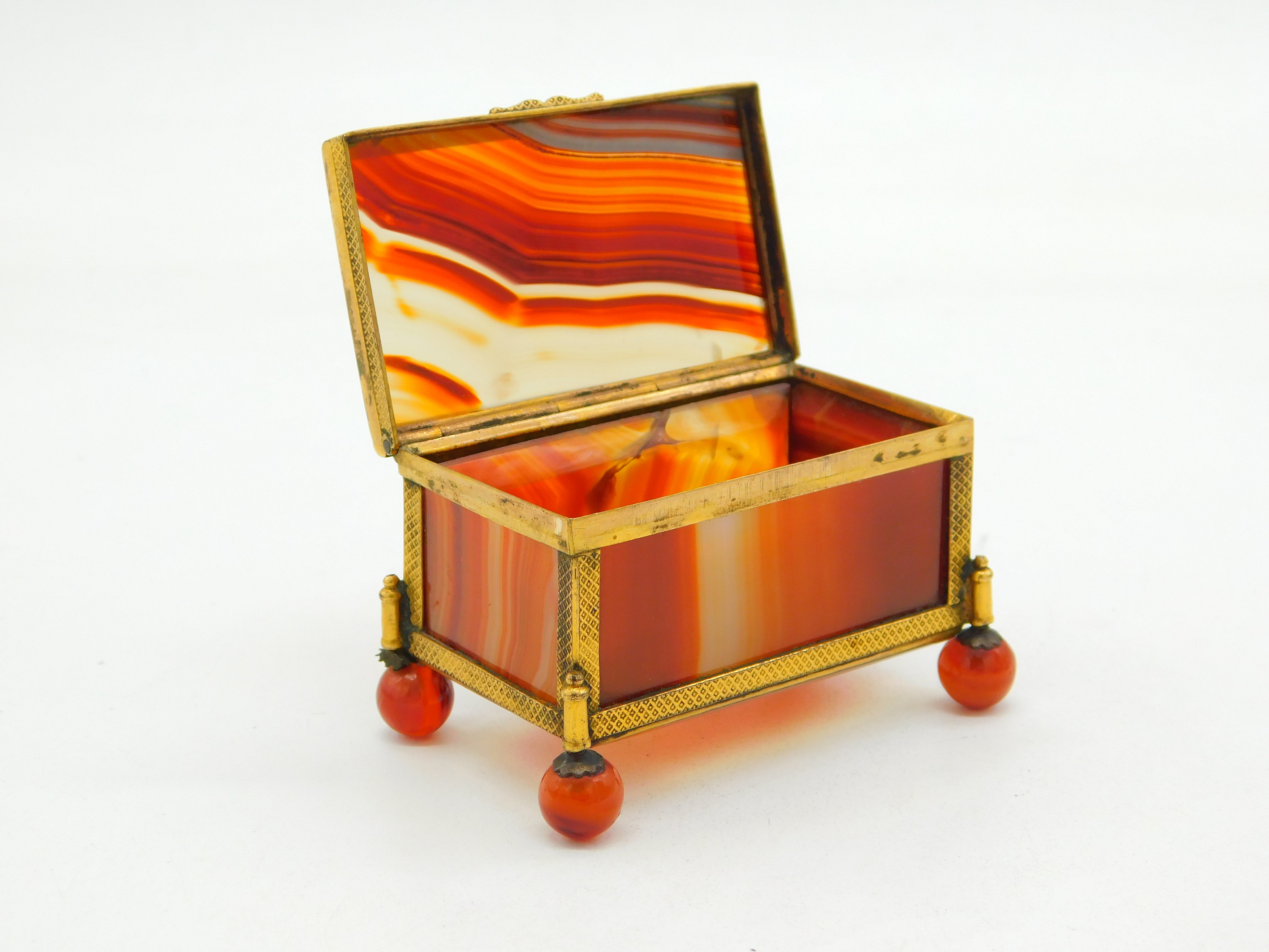 Details: A fantastic and wonderfully designed antique georgian regency period gilt metal mounted red banded agate jewellery box on charming balled agate feet c1830, finished with superior quality and detail, no obvious cracks or damage. This is a wonderful item that would make a perfect gift or addition to any collection. We are more than happy to provide XRF reports for items upon request.