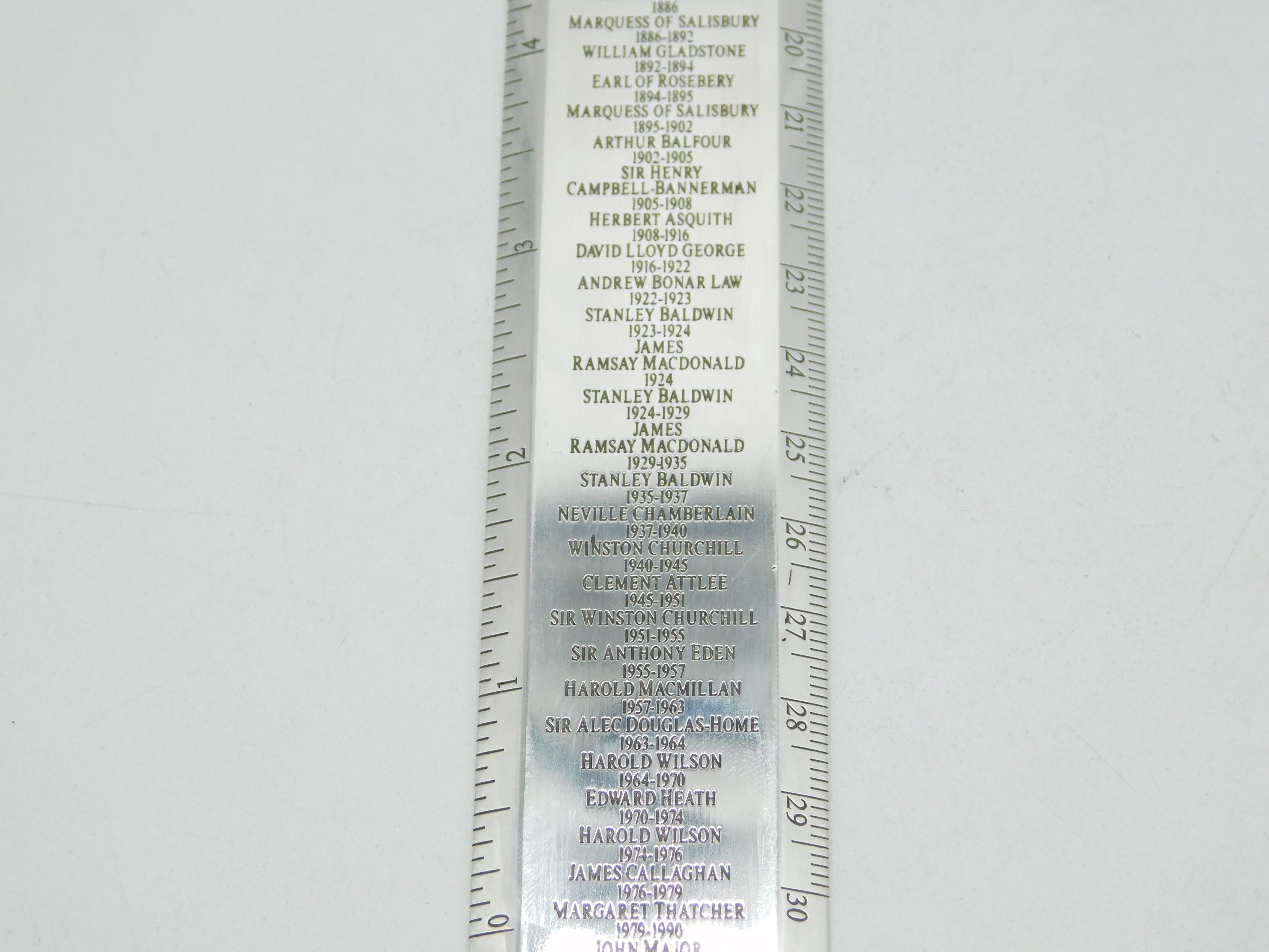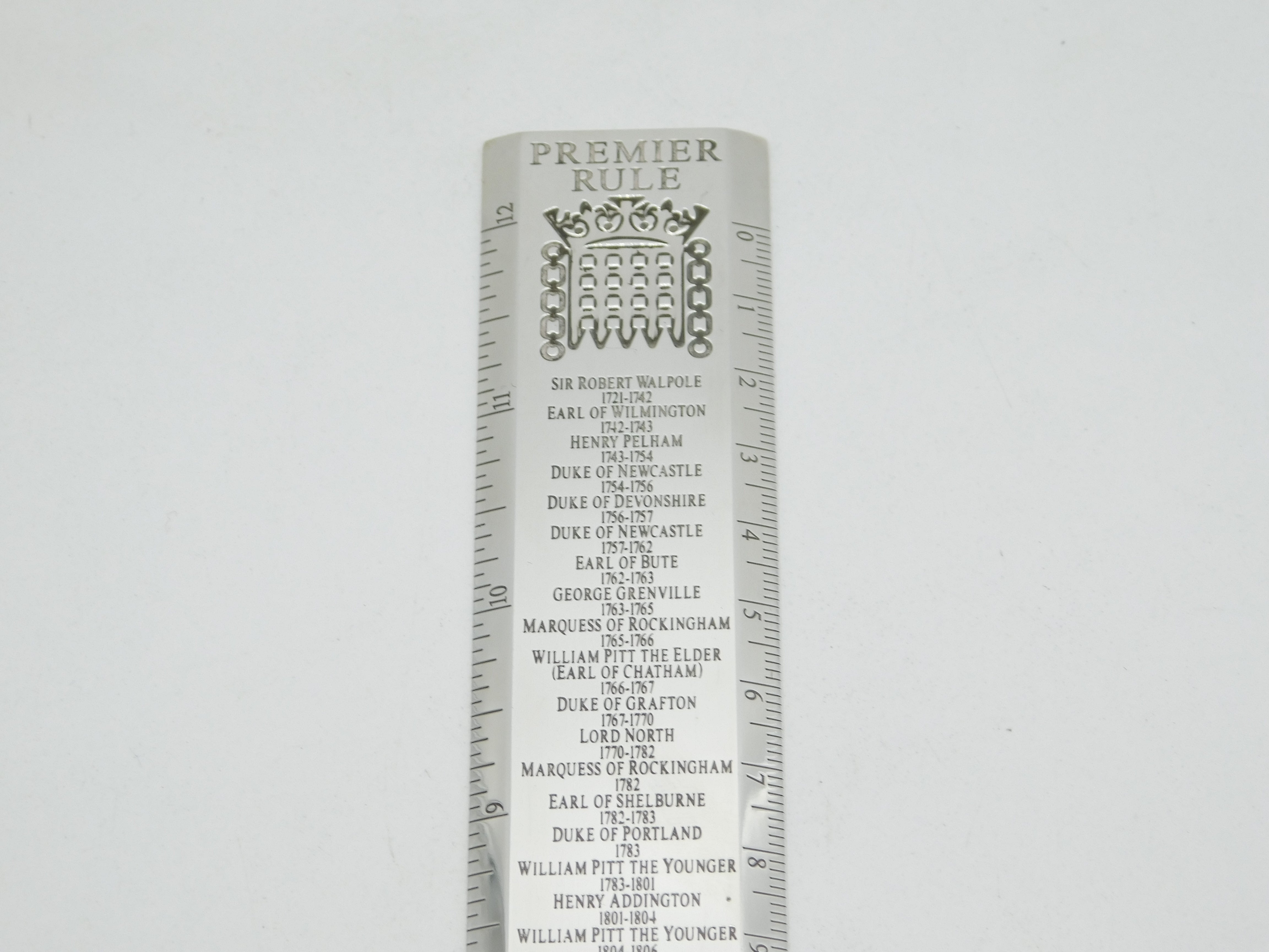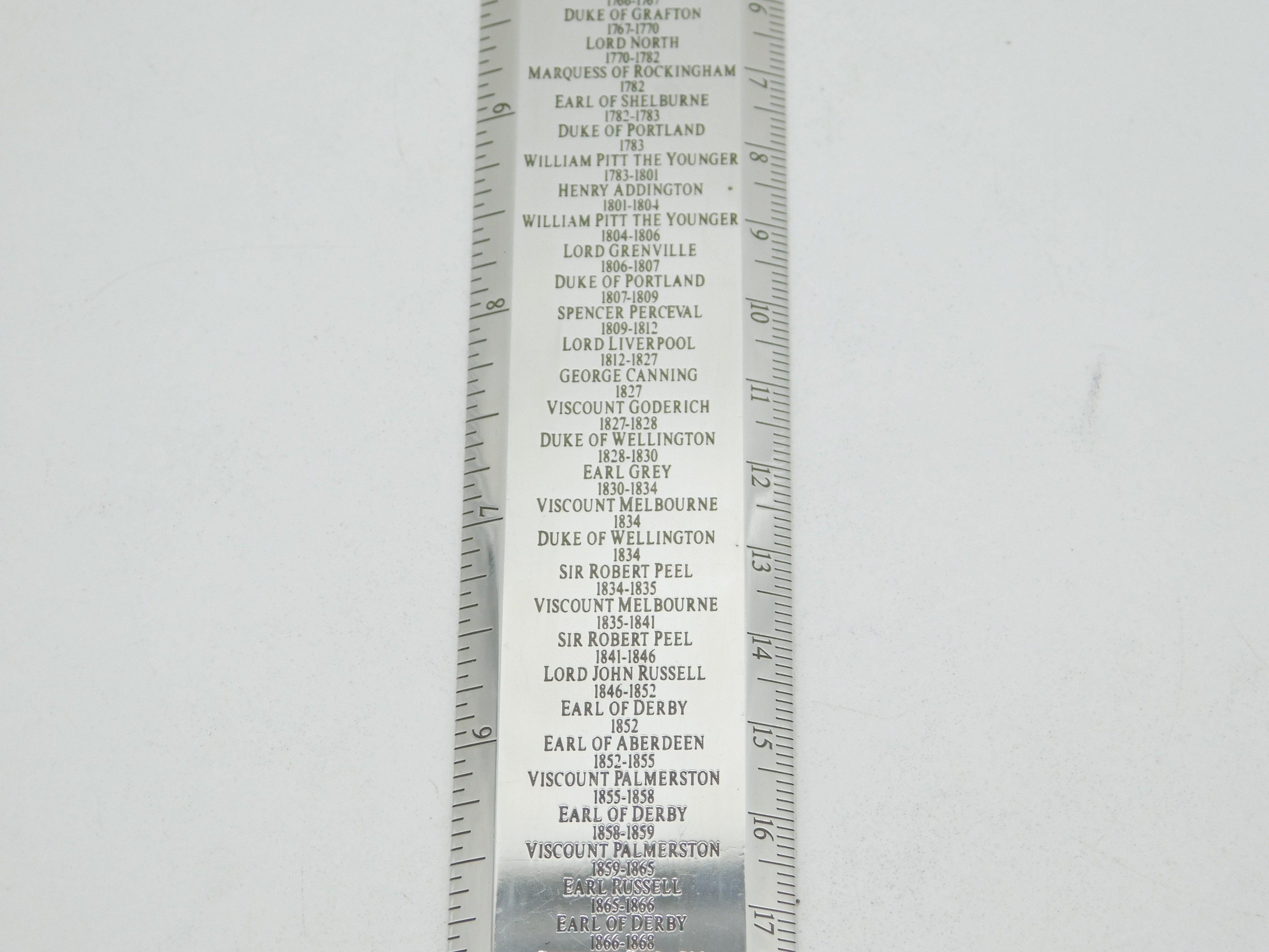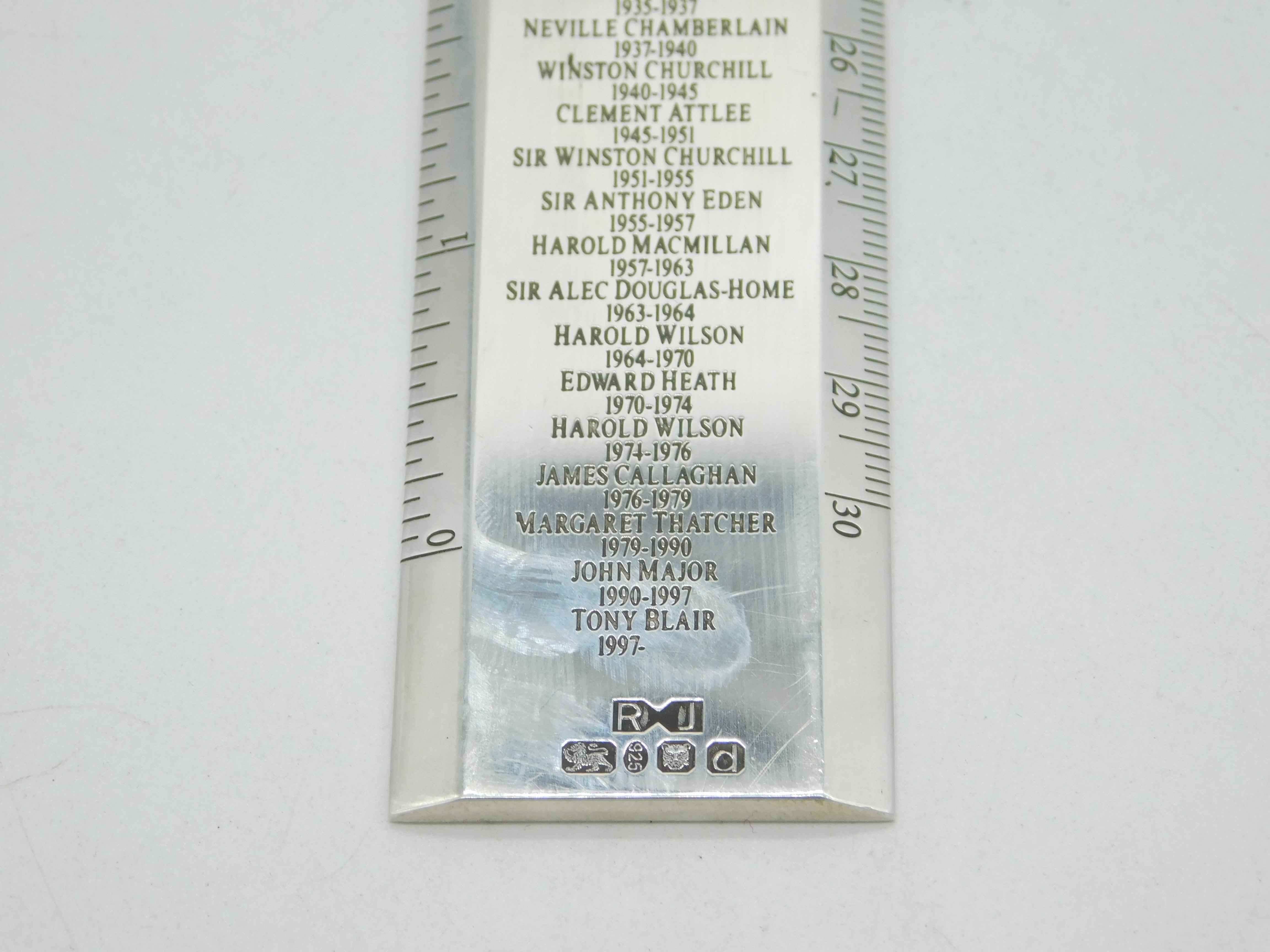 Details: A fantastic and wonderfully designed vintage sterling silver ruler with a detailed list of the UK's Prime Ministers from 1721 until 1997, named 'Premier Rule' to the top, the ruler is crafted with superior quality with excellent heavy guage, hallmarked London 2003 by Richard Jarvis of Pall Mall. These rulers are still available for sale and currently retail from £1,500. This is a wonderful item that would make a perfect gift or addition to any collection. We are more than happy to provide XRF reports for items upon request.