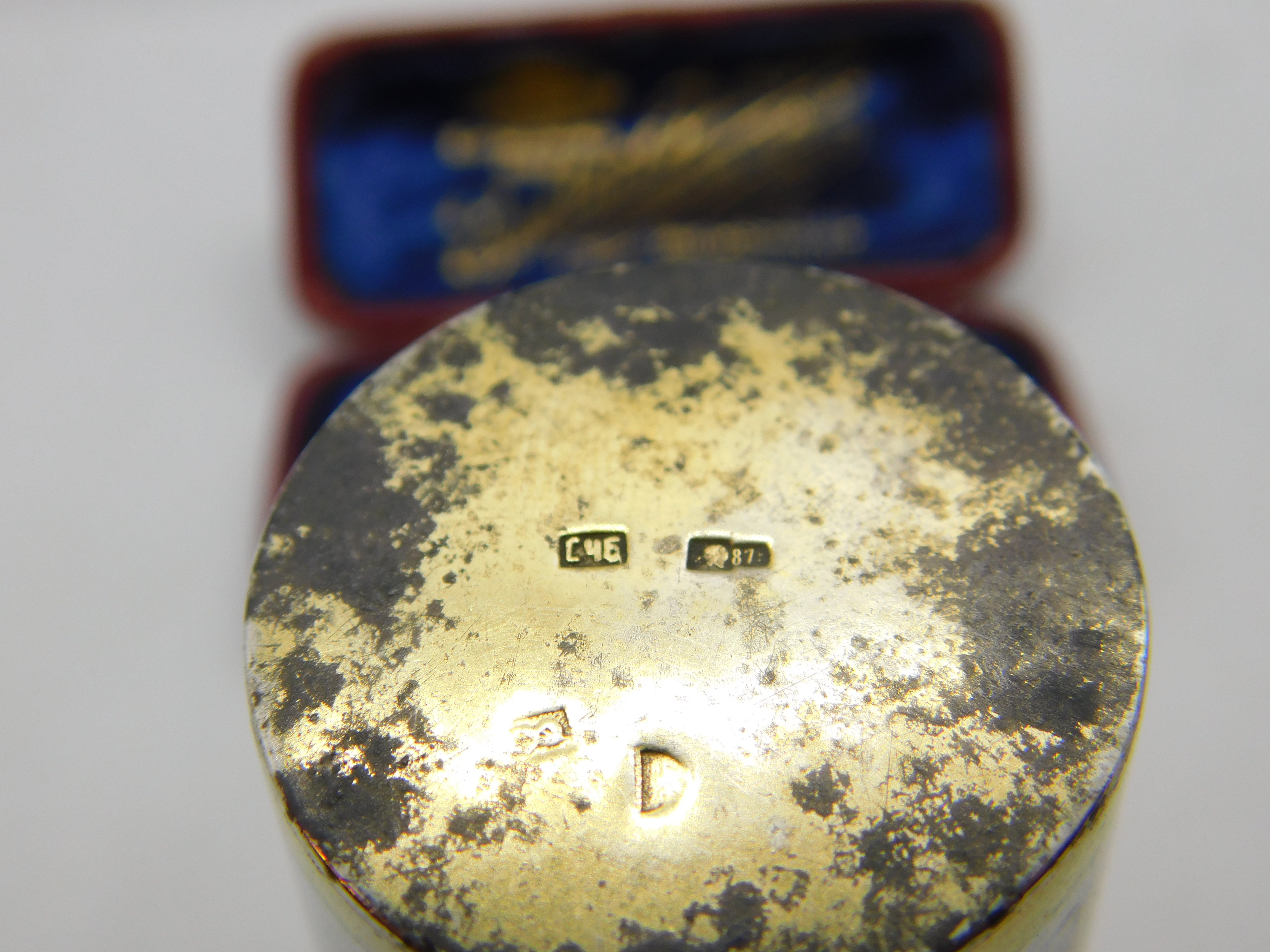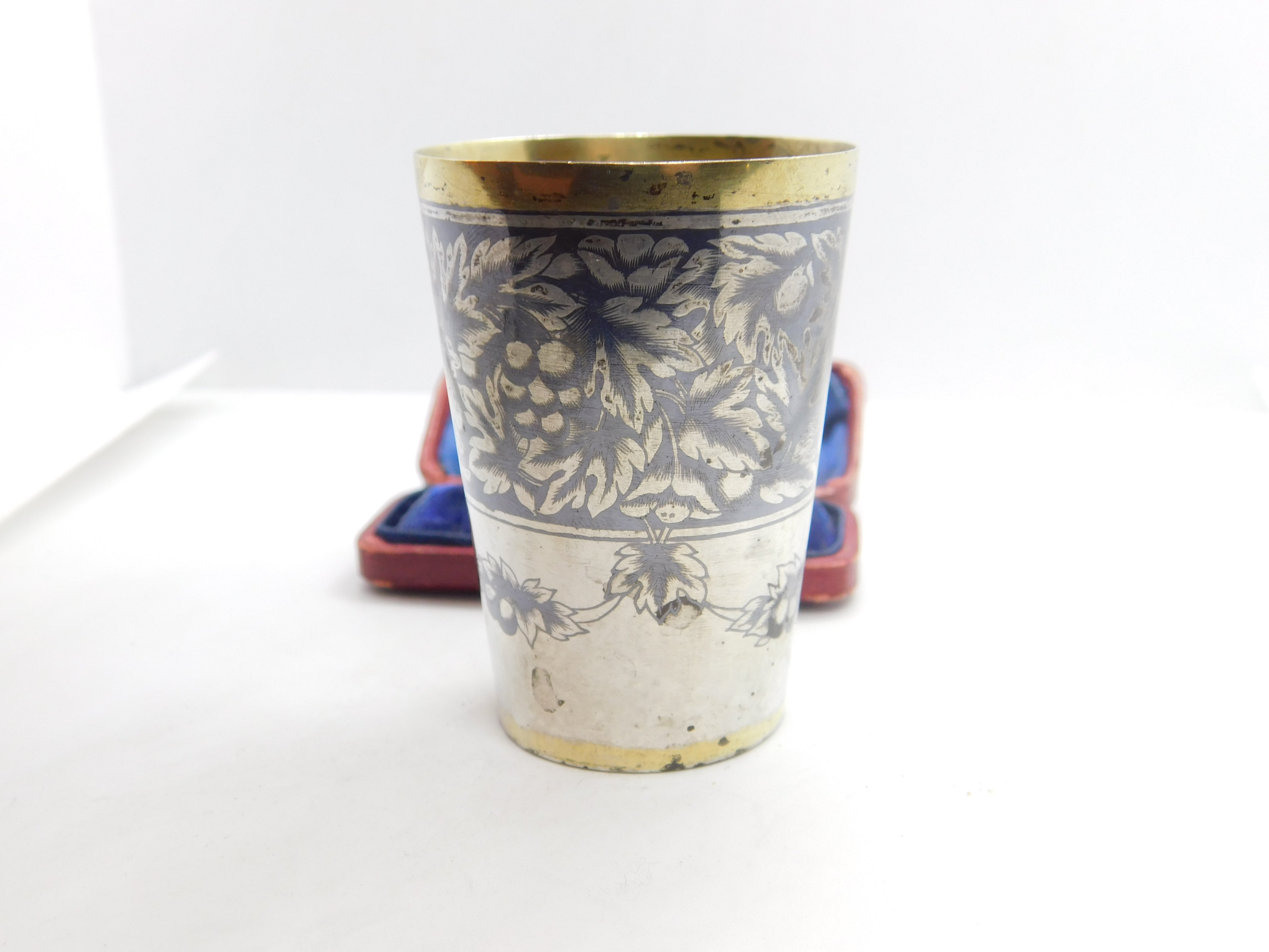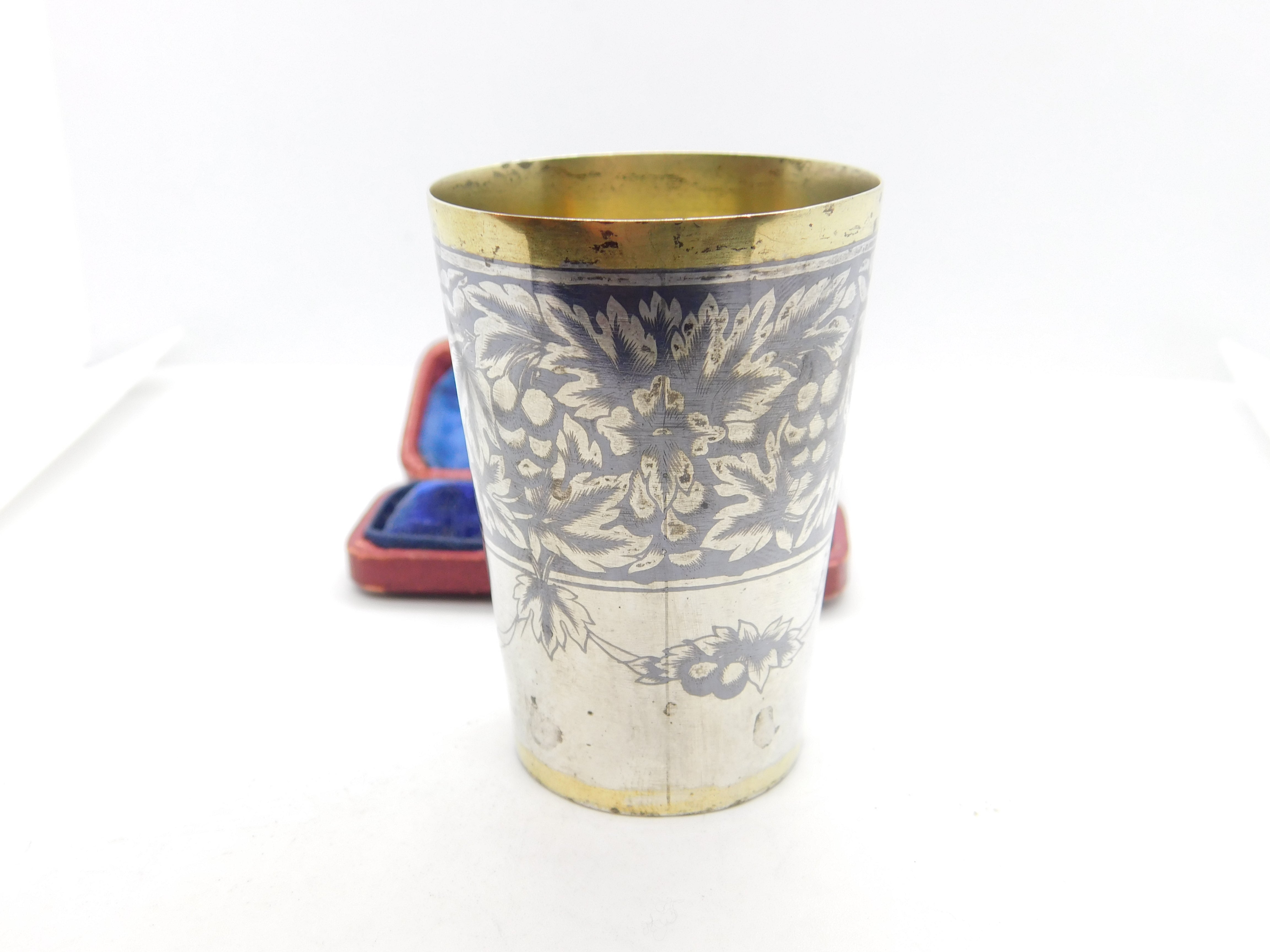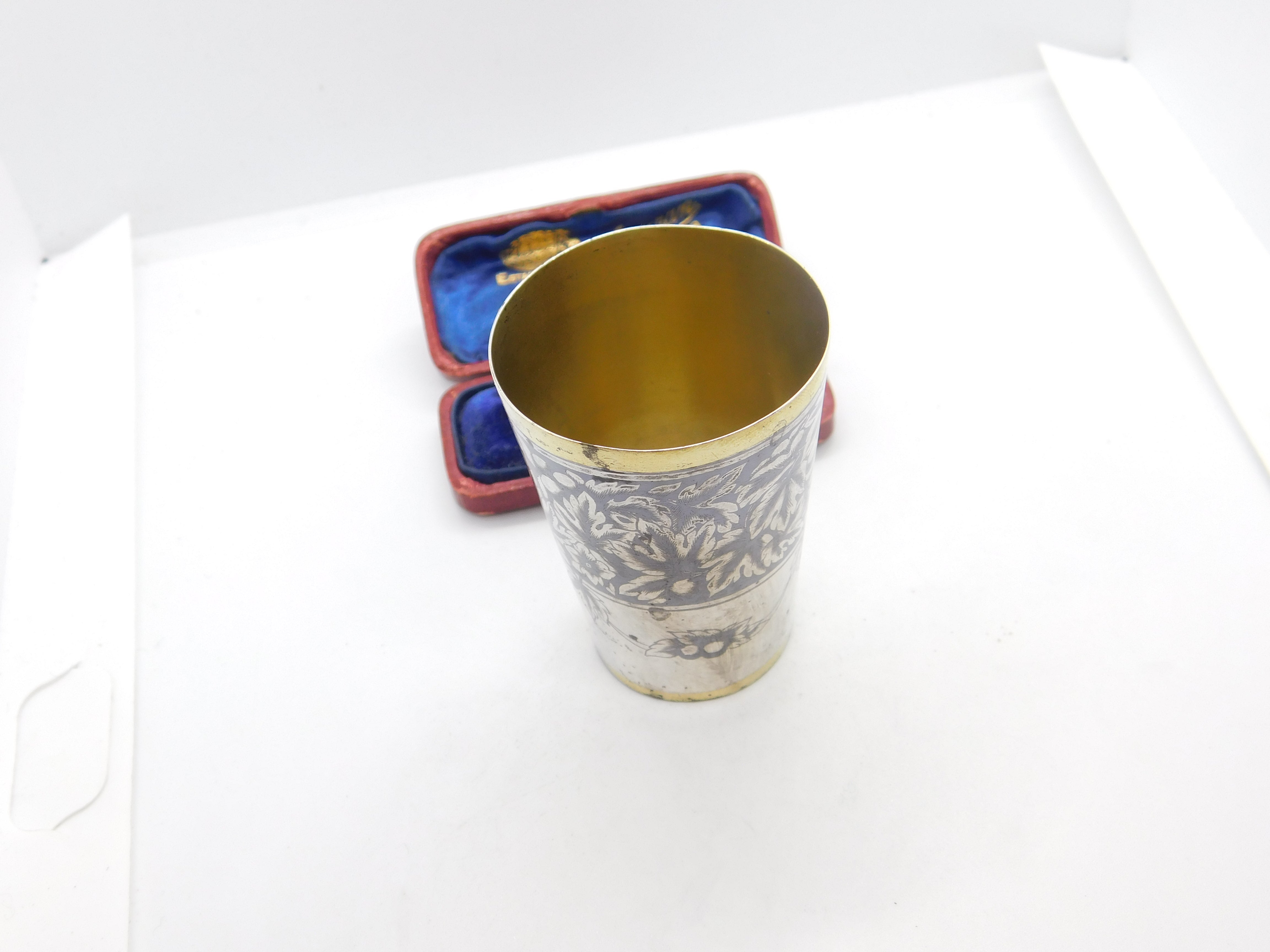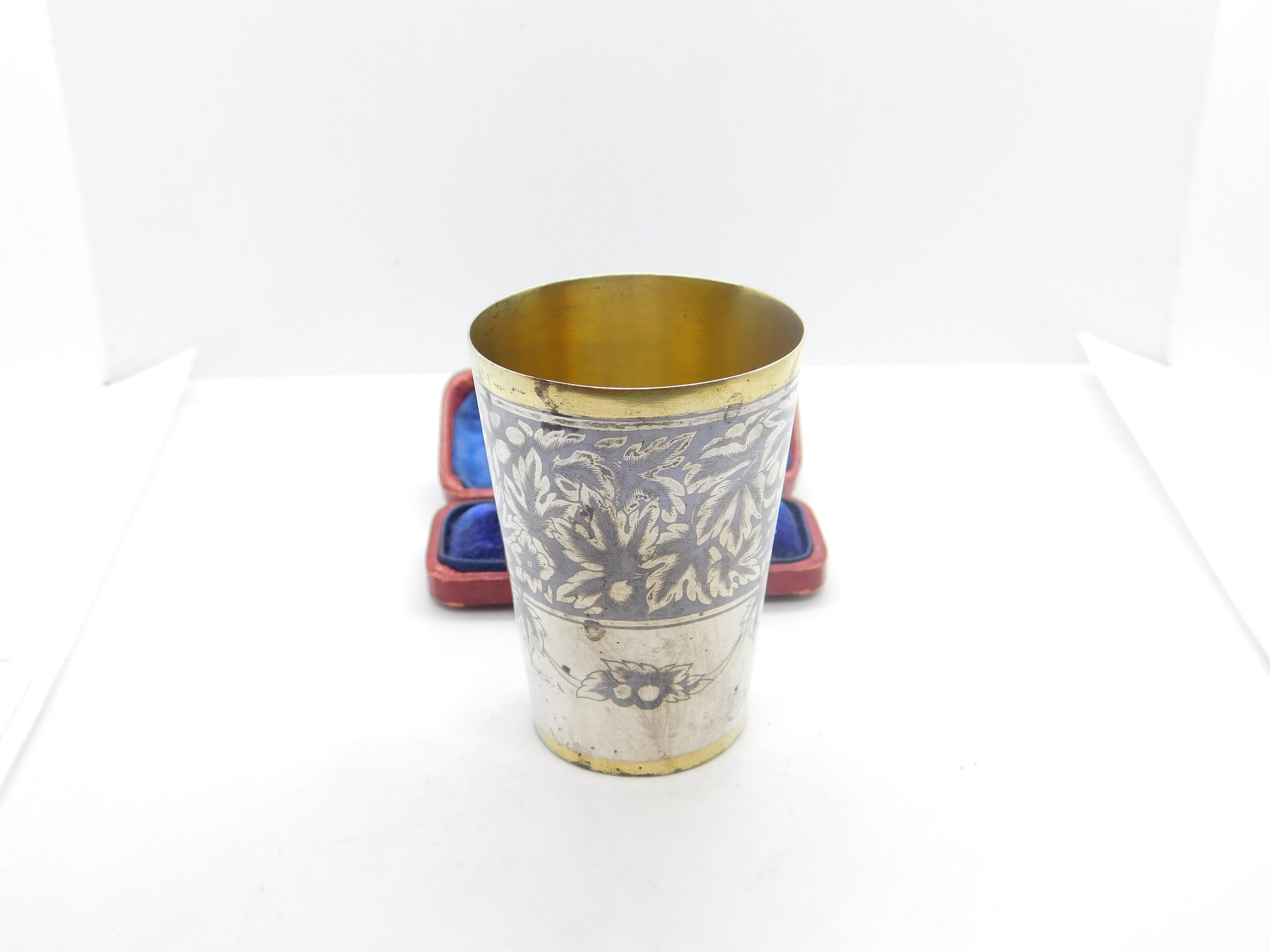 Details: A fantastic and wonderfully designed antique Victorian Russian 875 grade silver gilt and floral niello enamel vodka shot or tot cup with lovely detailing hallmarked to the base c1880. Needs a good polish but a beautiful example. This is a wonderful item that would make a perfect gift or addition to any collection. The BOX pictured is for PRESENTATION ONLY and is NOT included in the listings but used to frame the pictures unless specifically stated otherwise.