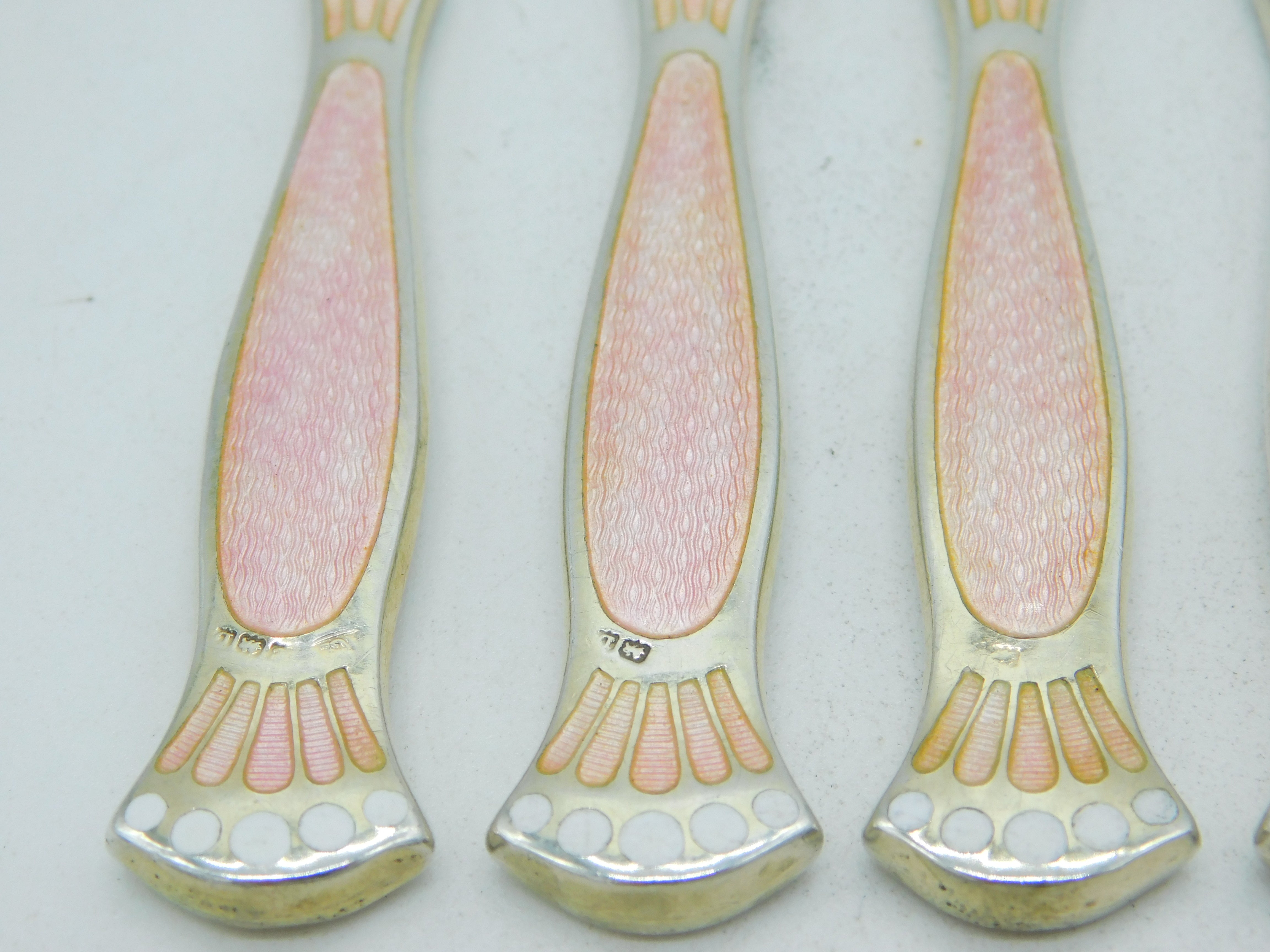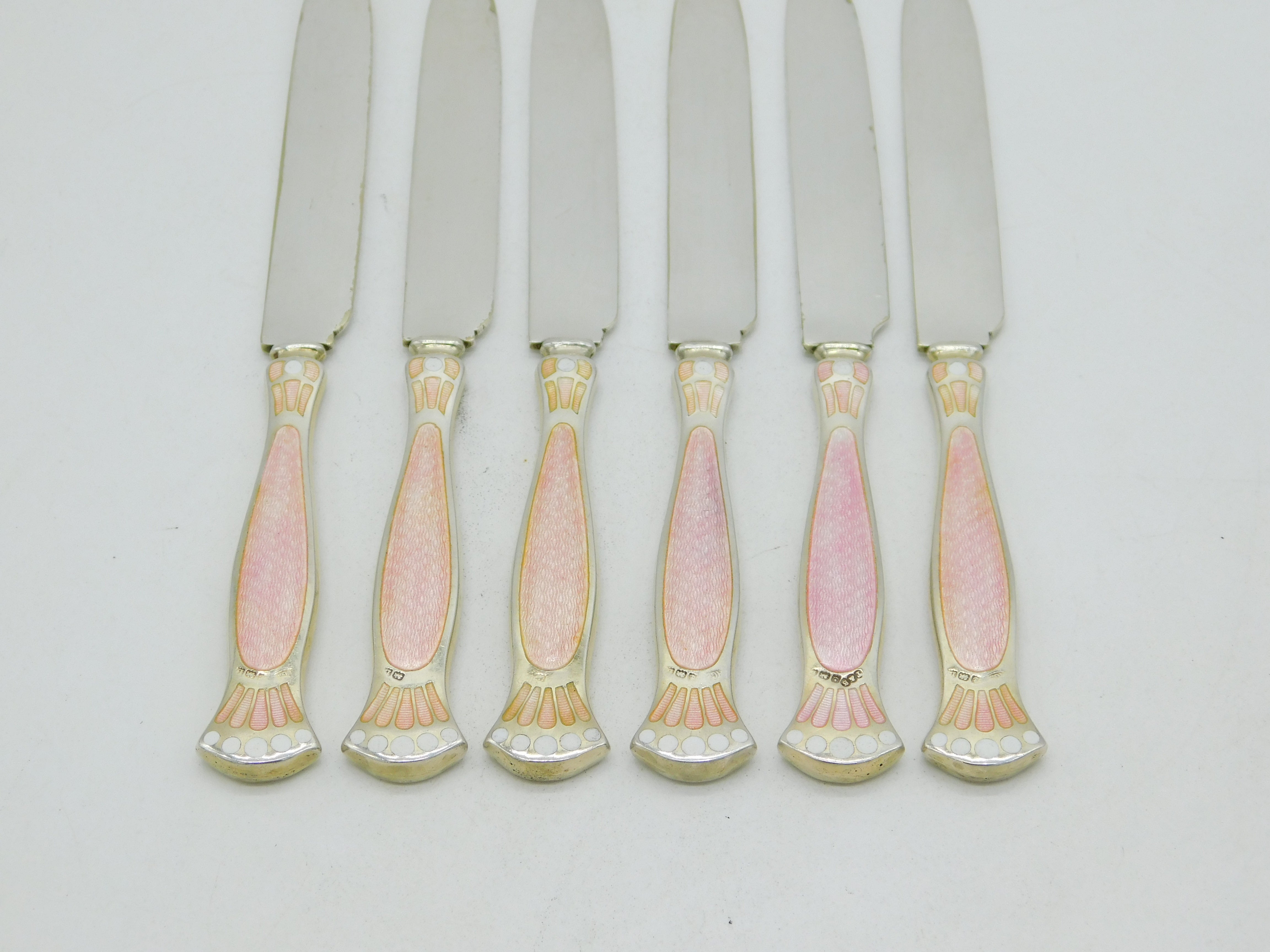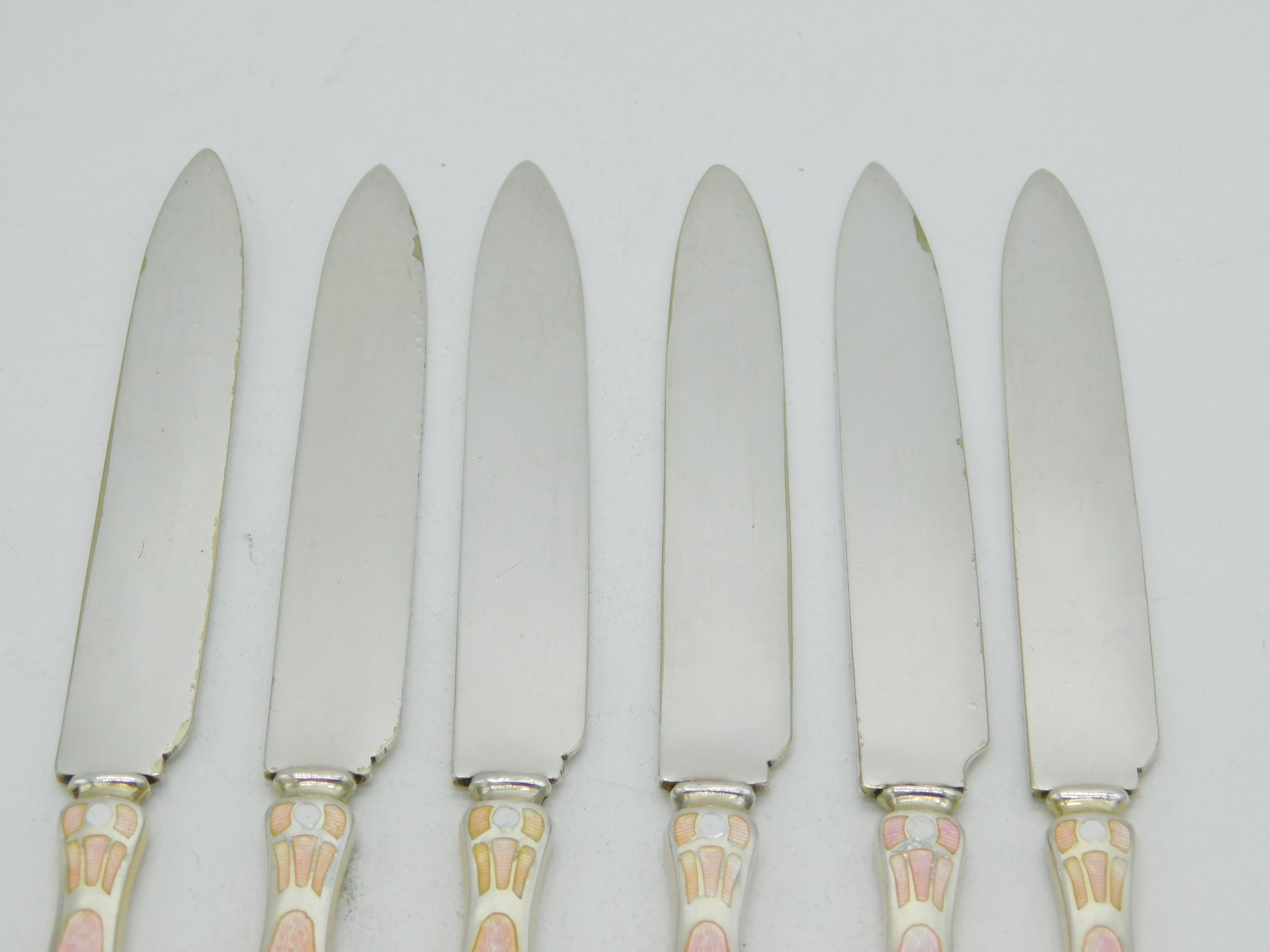 Details: A fantastic and wonderfully designed antique art deco set of six sterling silver & pink-white guilloche enamel ladies cake knives with charming detailing hallmarked Birmingham 1935 by Turner & Simpson. This is a wonderful item that would make a perfect gift or addition to any collection. We are more than happy to provide XRF reports for items upon request.