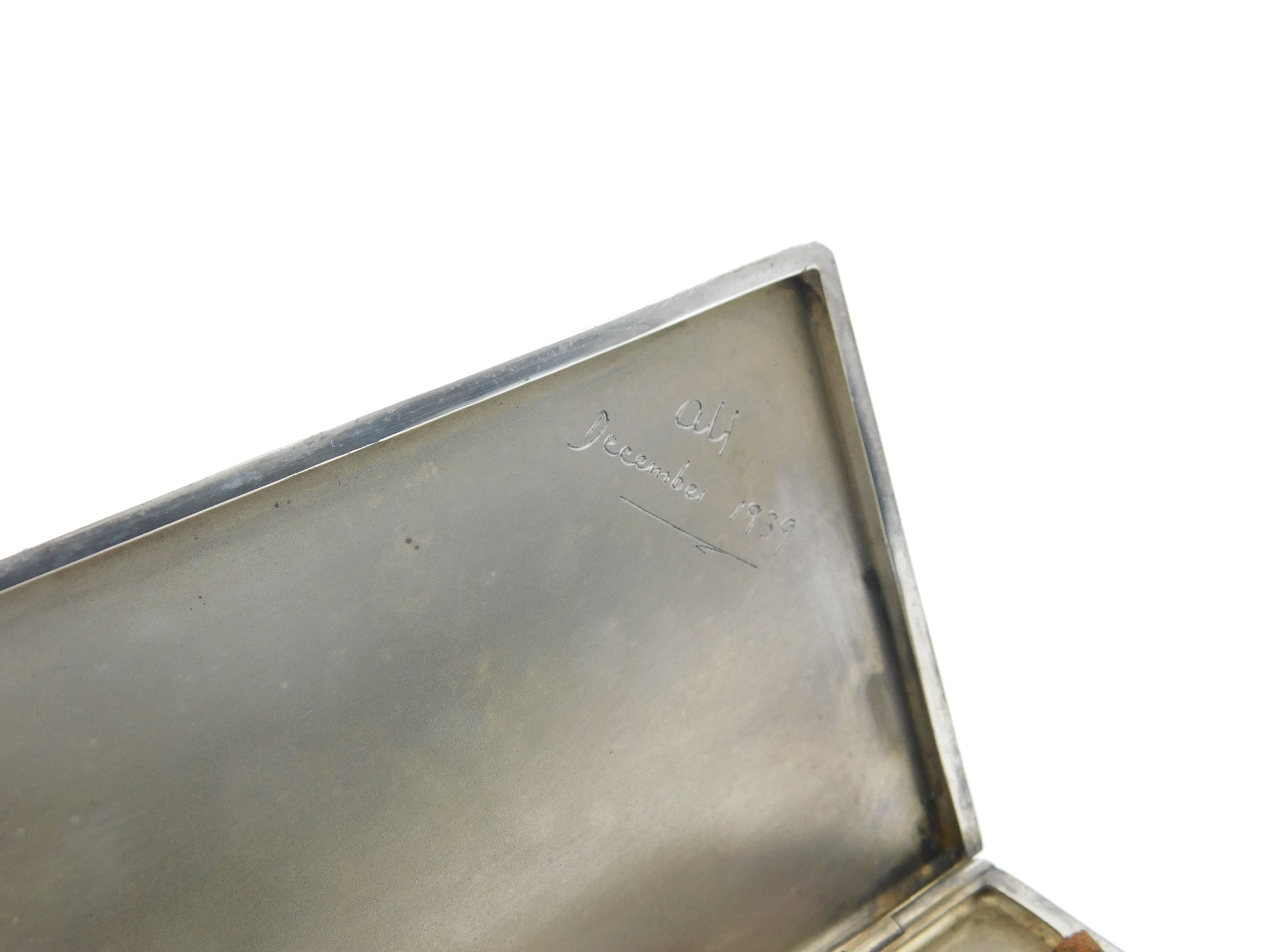 Details: A fantastic and wonderfully designed antique art deco large sterling silver cigarette case with charming flying mallard duck aesthetic scene to the front hallmarked Birmingham, 1938 by Andrew Wilkie. Date engraved to the interior, a lovely example. This is a wonderful item that would make a perfect gift or addition to any collection. The BOX pictured is for PRESENTATION ONLY and is NOT included in the listings but used to frame the pictures unless specifically stated otherwise.