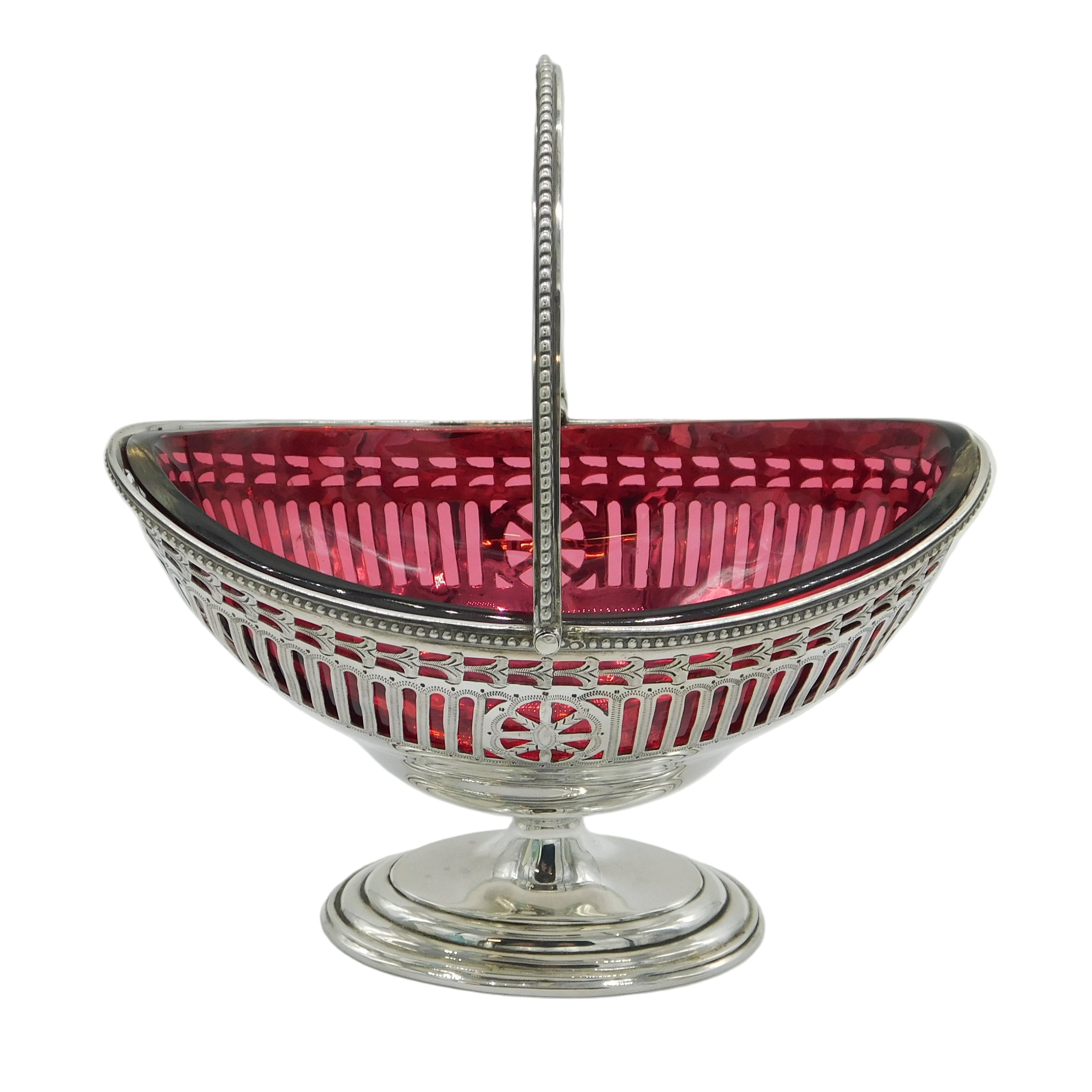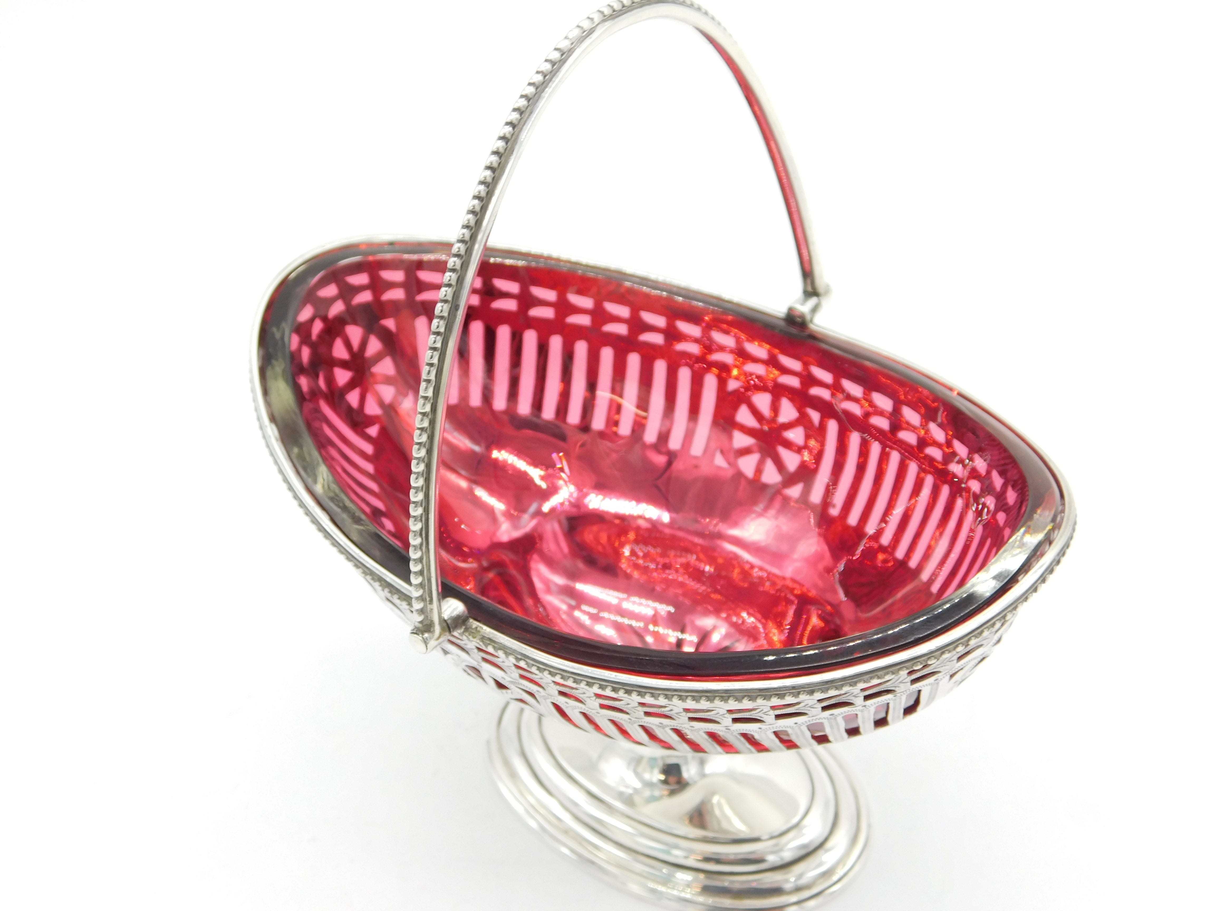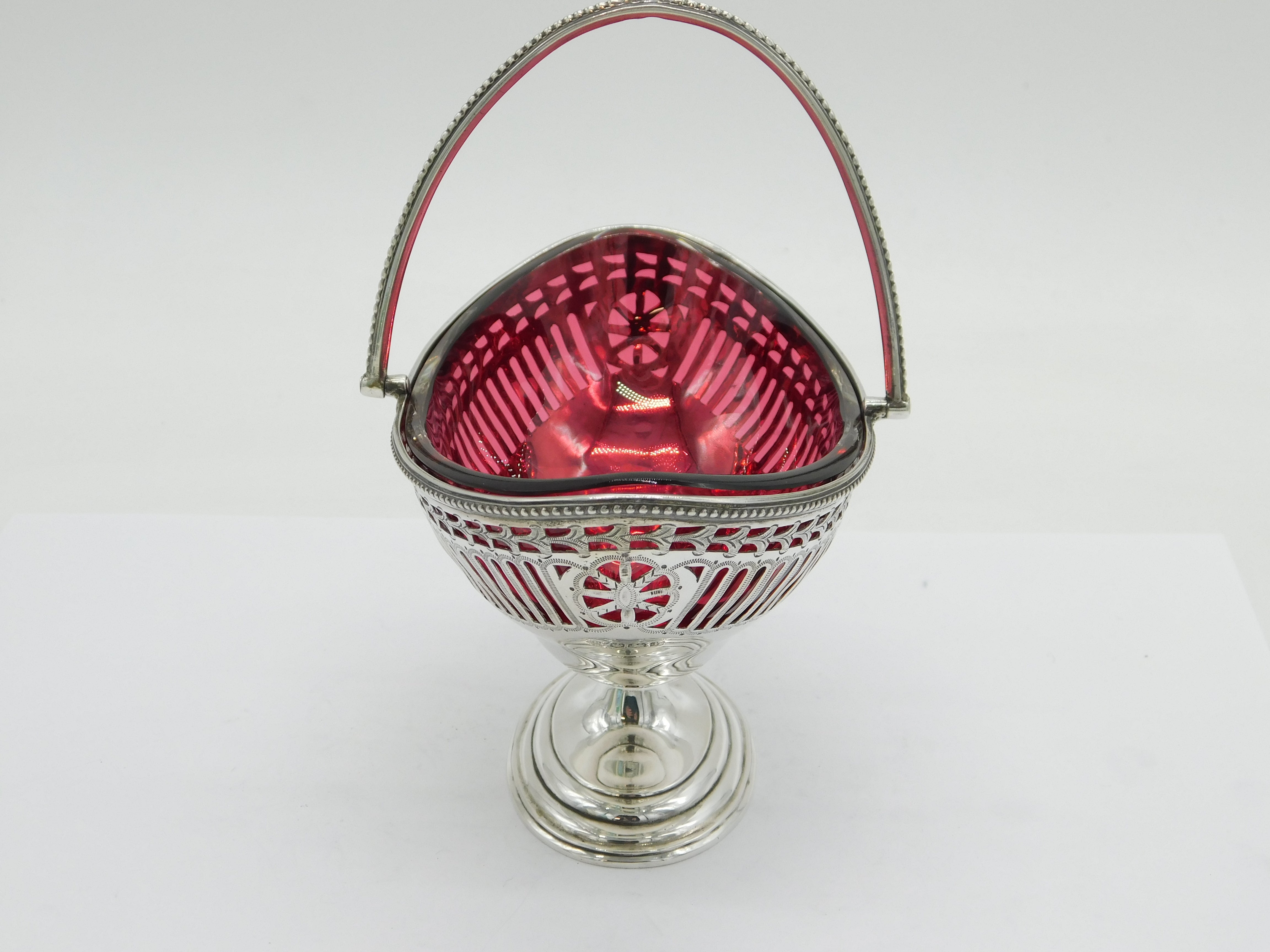 Details: A fantastic and wonderfully designed antique art deco pierced sterling silver pedestal sweet treat dish with cranberry glass liner hallmarked Sheffield 1919 by Thomas Bradbury. Cranberry liner in excellent condition. This is a wonderful item that would make a perfect gift or addition to any collection. We are more than happy to provide XRF reports for items upon request.