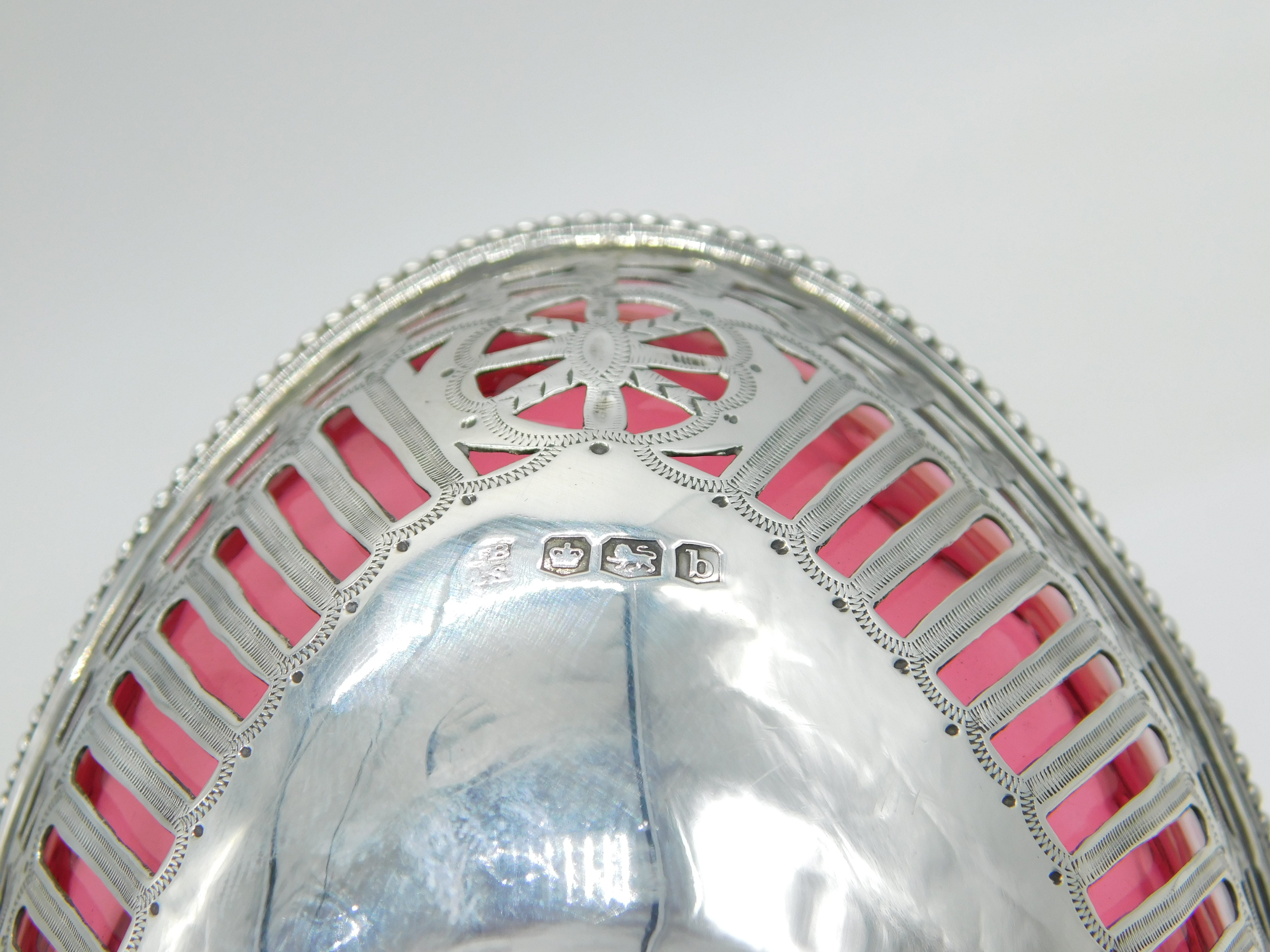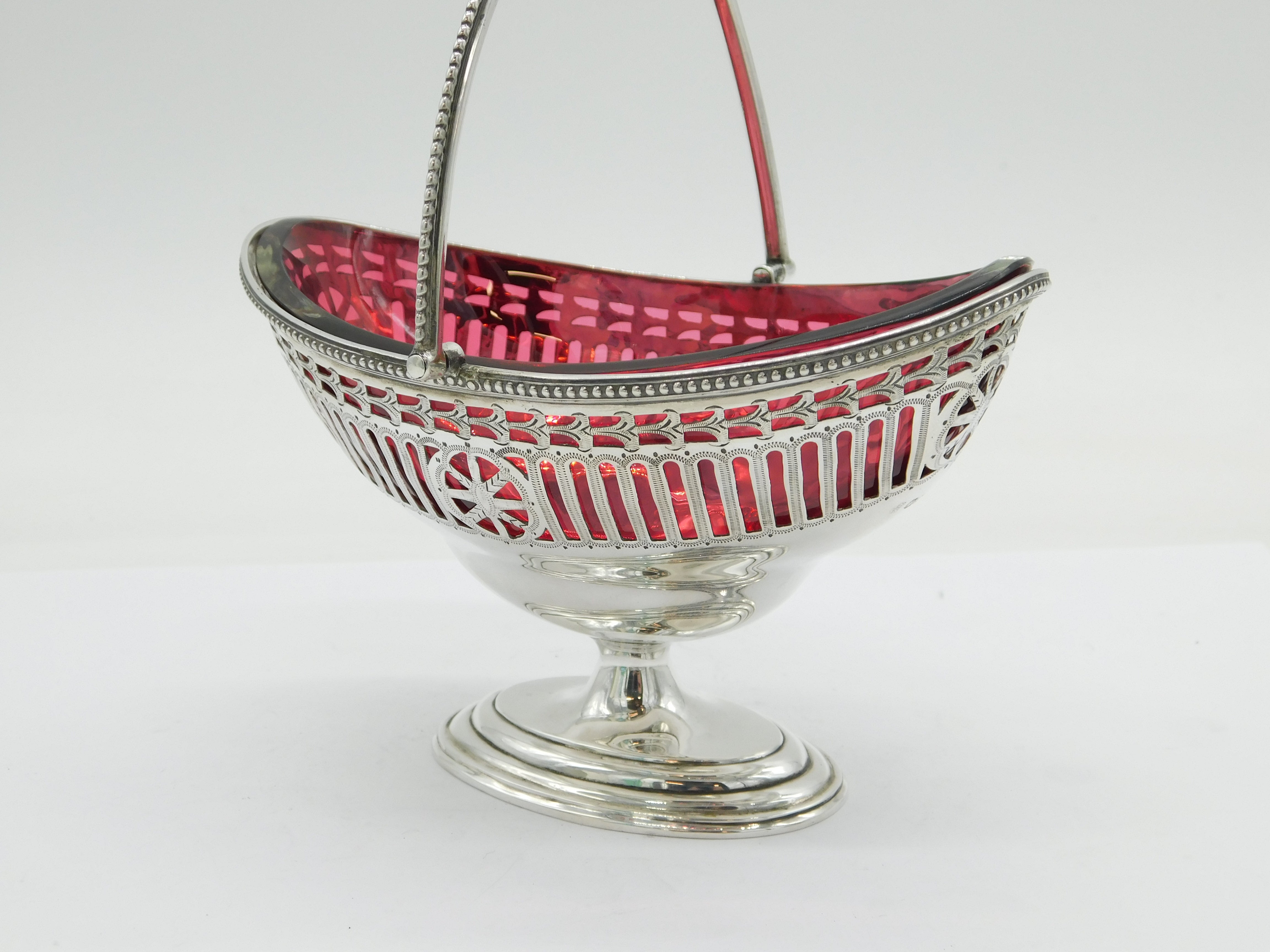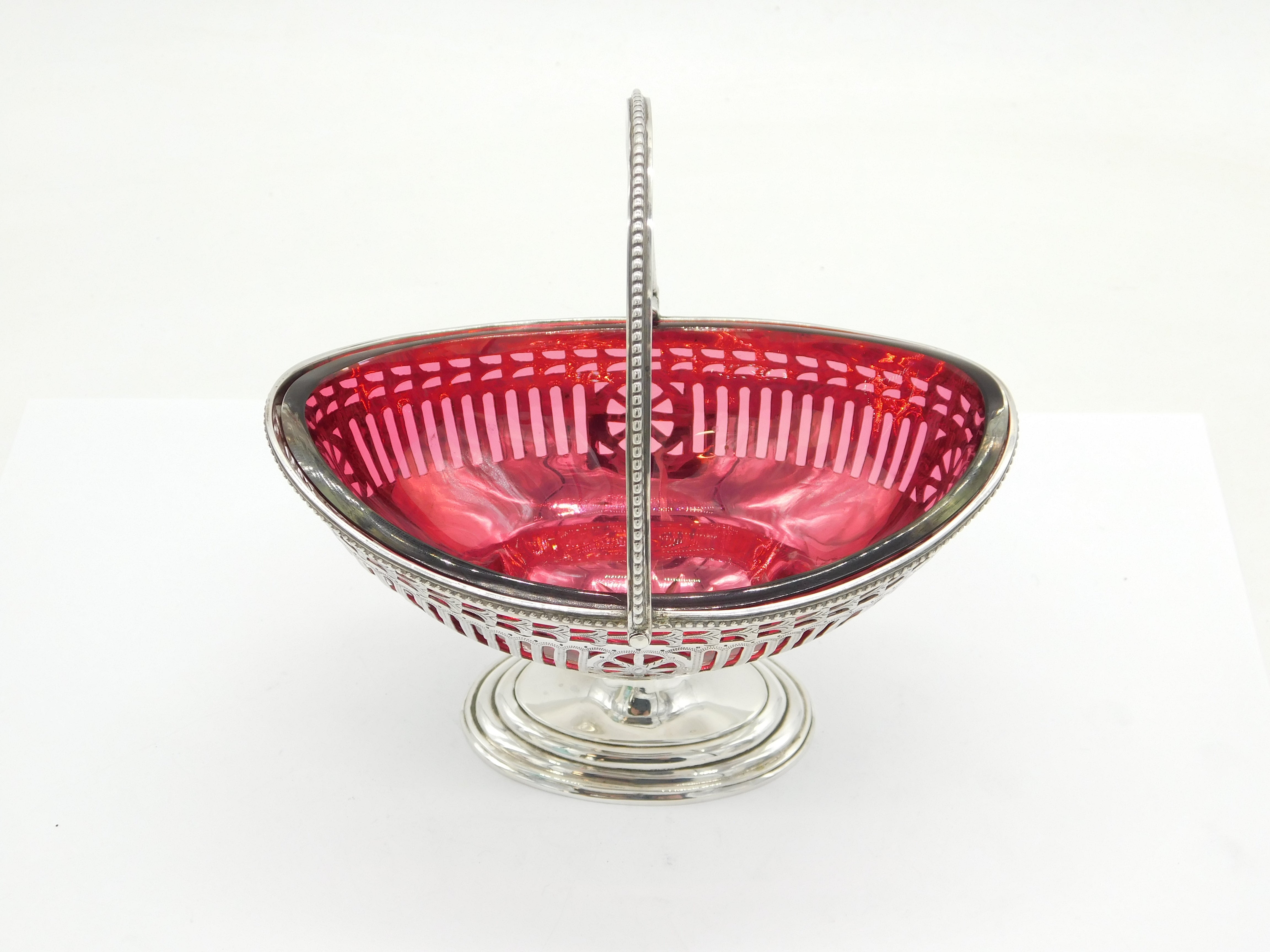 Details: A fantastic and wonderfully designed antique art deco pierced sterling silver pedestal sweet treat dish with cranberry glass liner hallmarked Sheffield 1919 by Thomas Bradbury. Cranberry liner in excellent condition. This is a wonderful item that would make a perfect gift or addition to any collection. We are more than happy to provide XRF reports for items upon request.