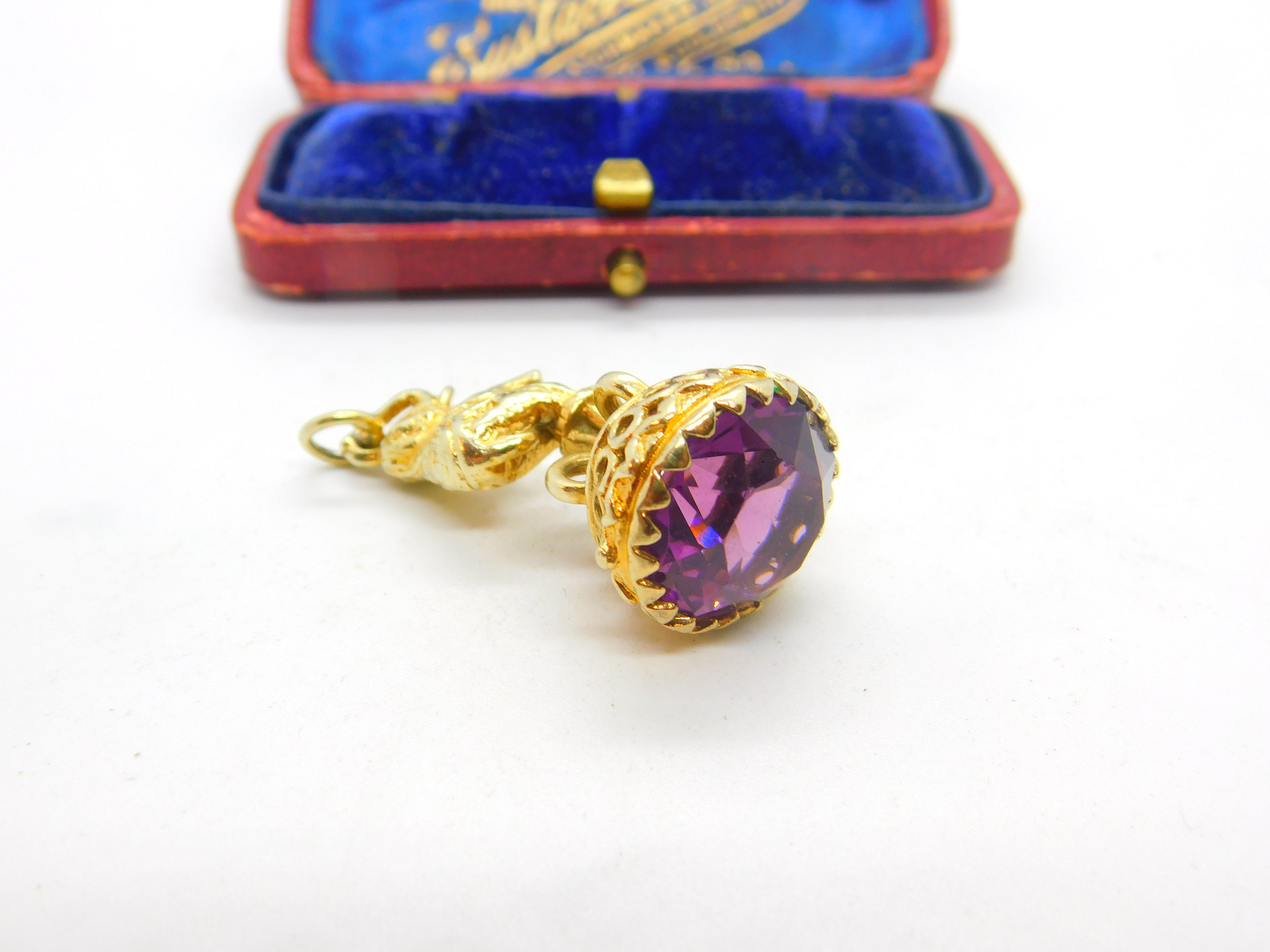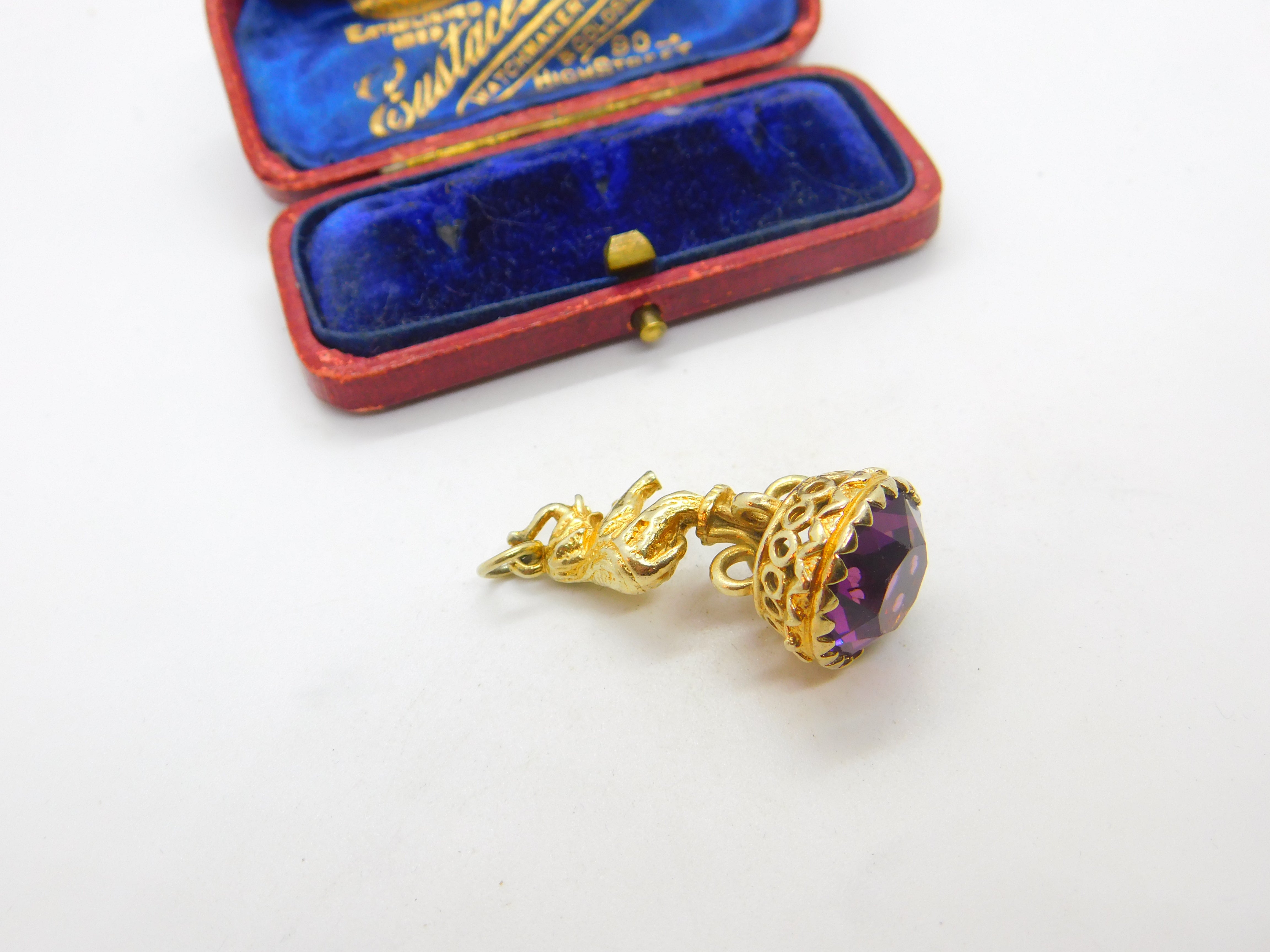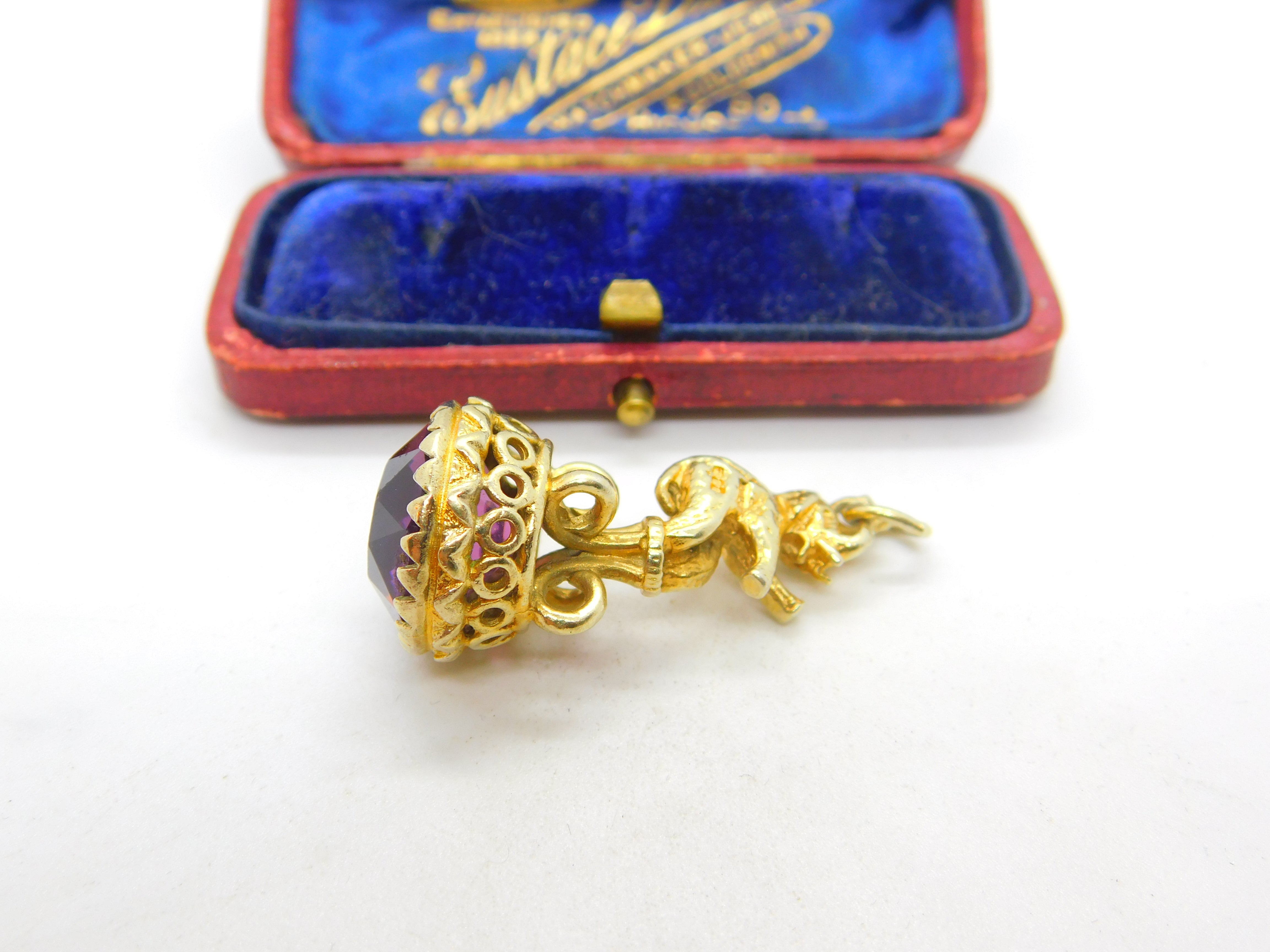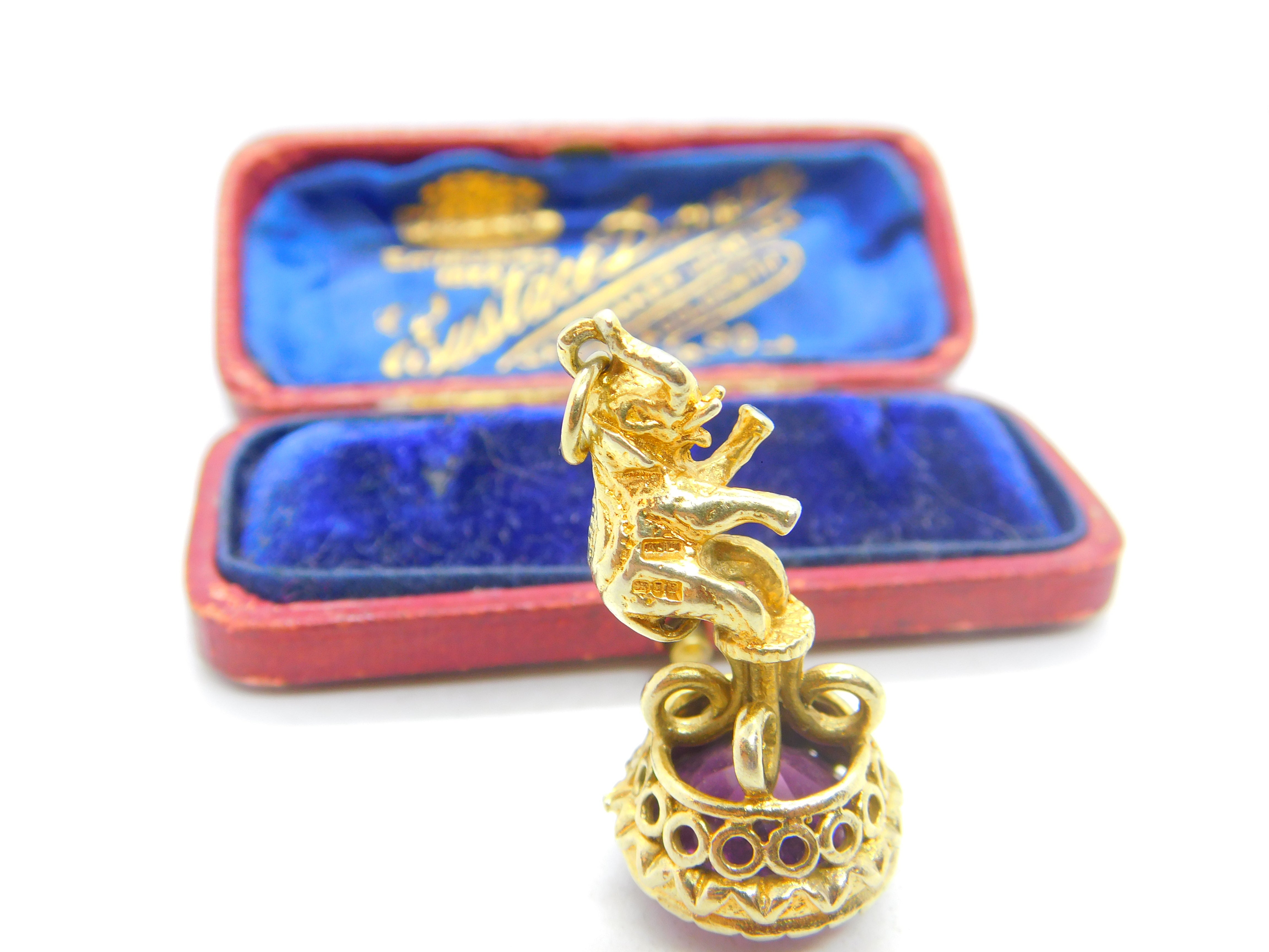 Details: A fantastic and wonderfully designed vintage sterling silver gilt victorian revival circus dancing elephant fob seal pendant set with faceted amethyst hallmarked London 1991 to the edge. This is a wonderful item that would make a perfect gift or addition to any collection. The BOX pictured is for PRESENTATION ONLY and is NOT included in the listings but used to frame the pictures unless specifically stated otherwise.