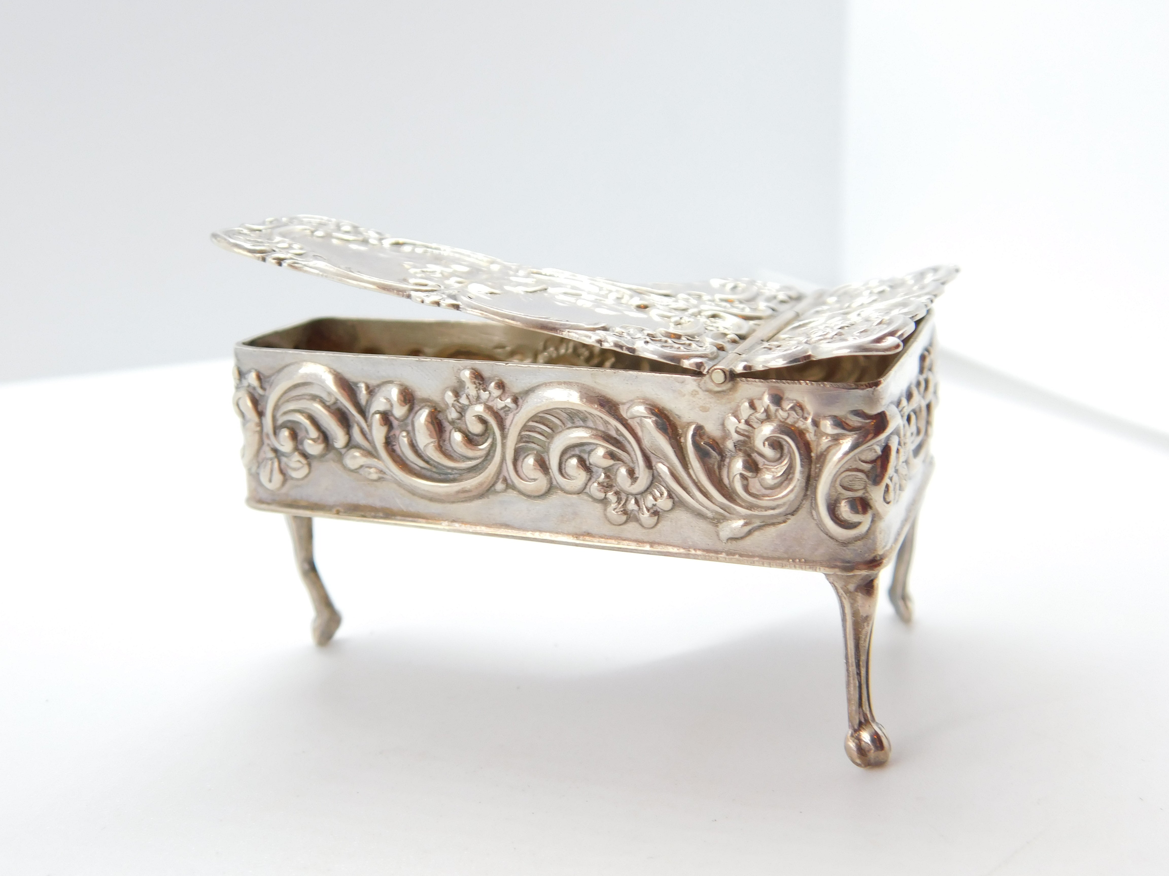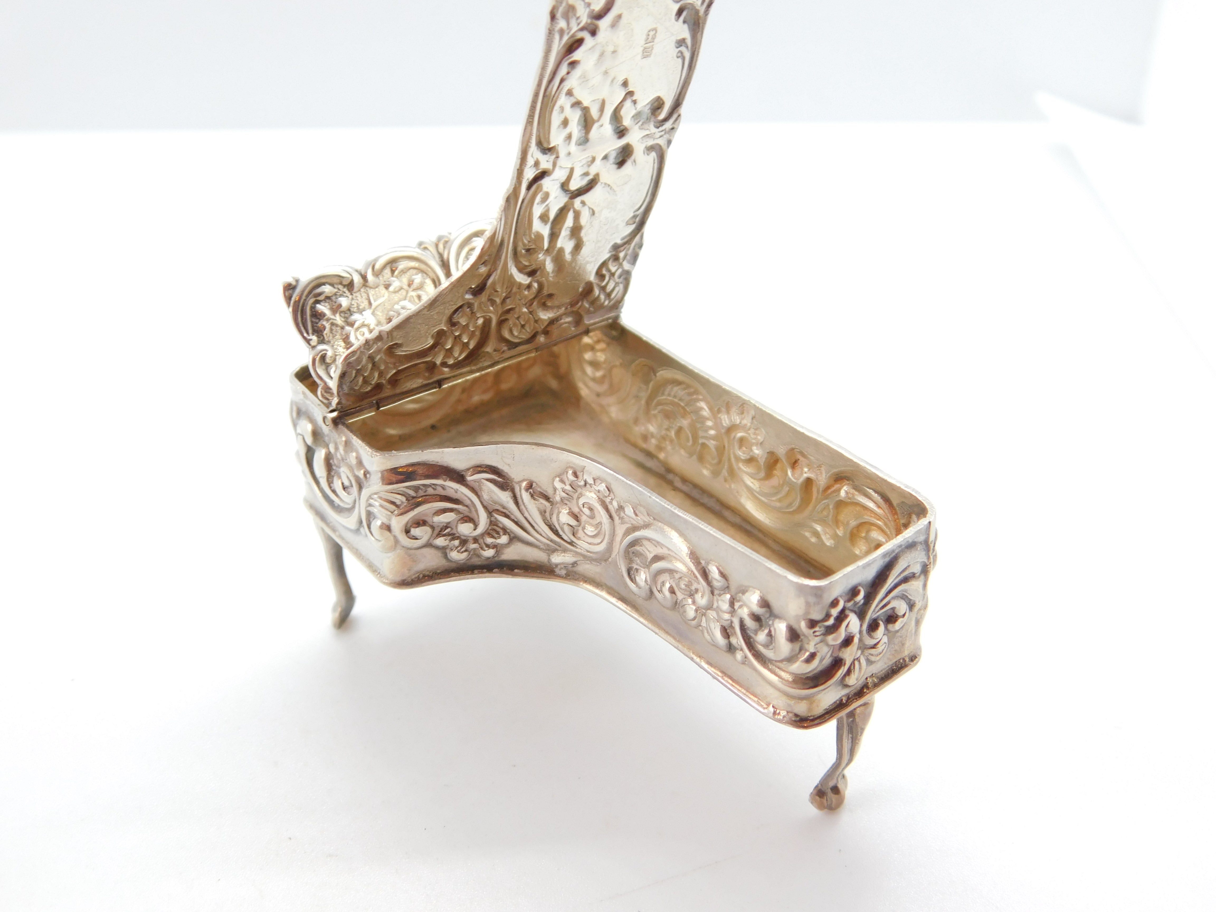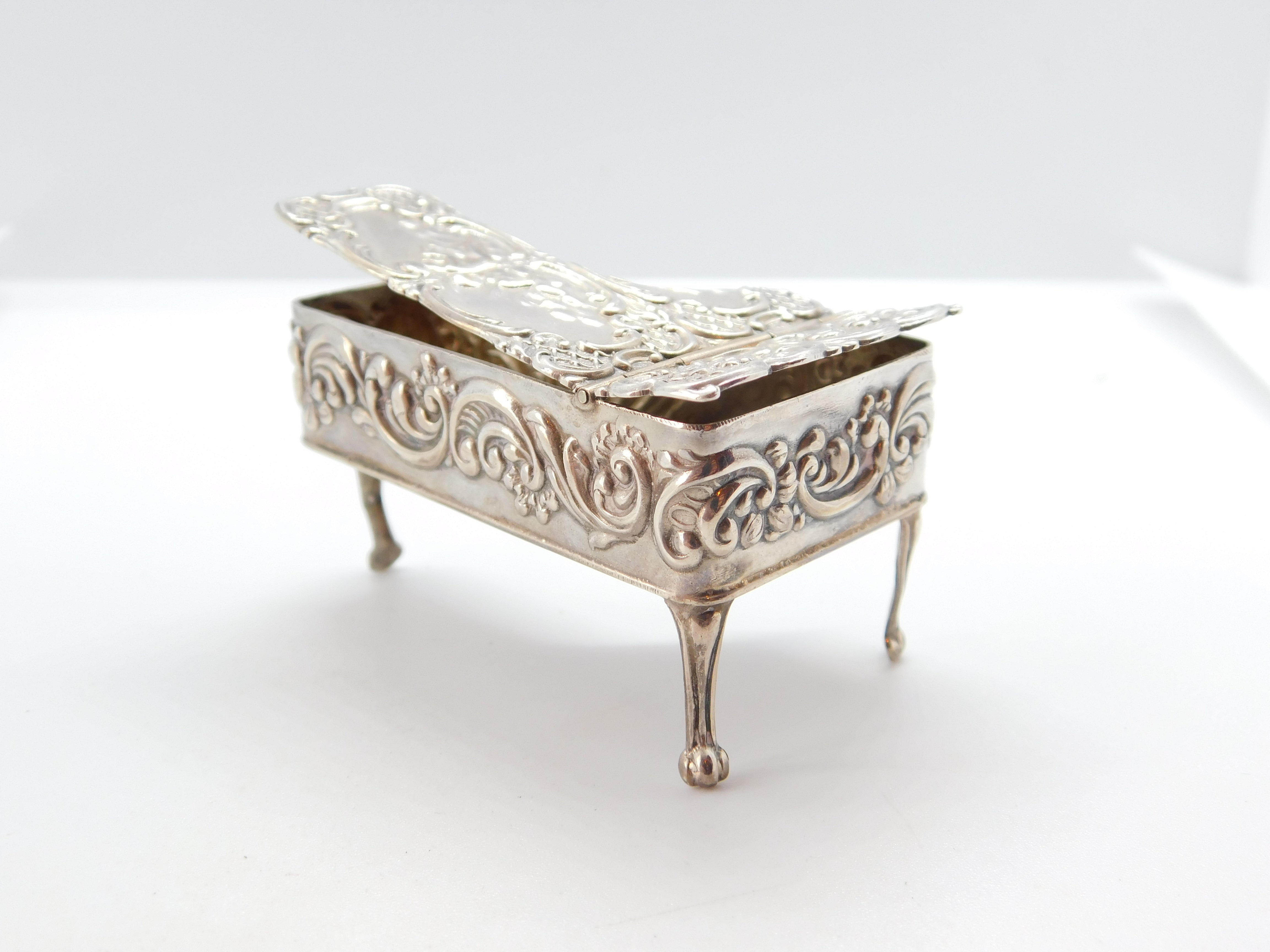 Details: A fantastic and wonderfully designed vintage victorian style sterling silver miniature dolls house grand piano ornament with charing cherub patterns throughout hallmarked Birmingham 1968 to the base and to the interior. This is a wonderful item that would make a perfect gift or addition to any collection. The BOX pictured is for PRESENTATION ONLY and is NOT included in the listings but used to frame the pictures unless specifically stated otherwise.
