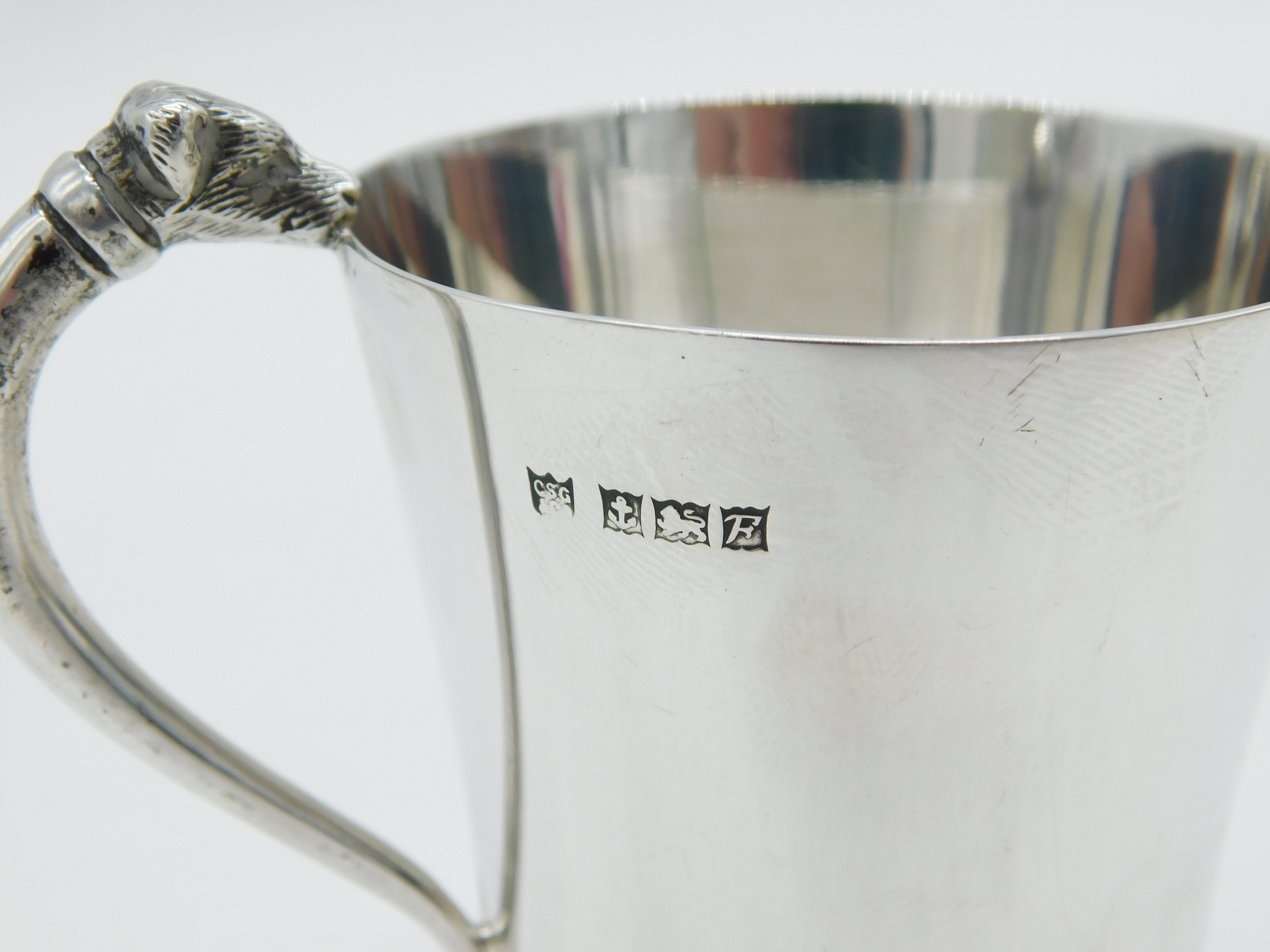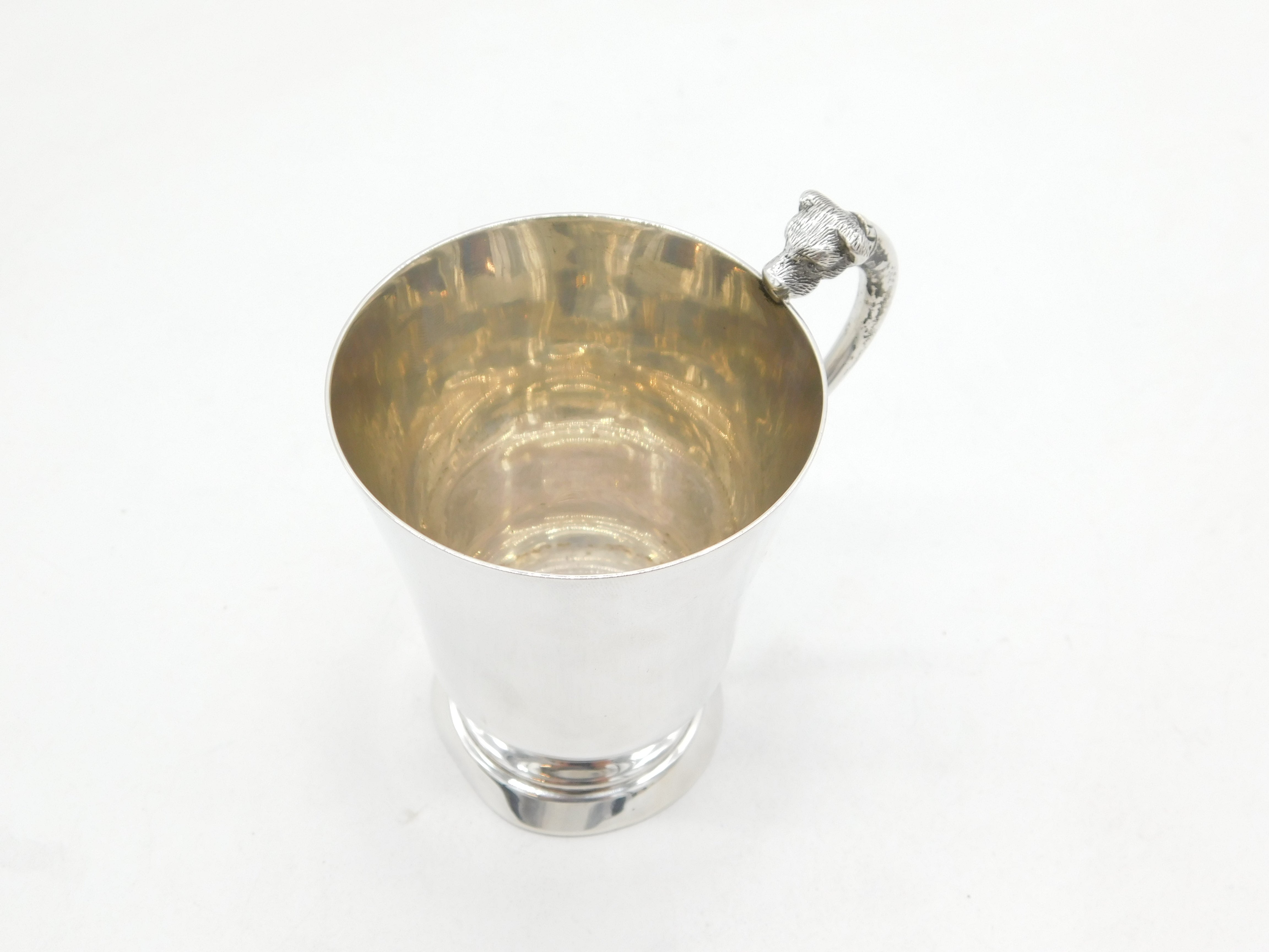 Details: A fantastic and wonderfully designed vintage sterling silver christening mug with lovely cast terrier dog handle hallmarked Birmingham 1966 by Charles S Green. This is a wonderful item that would make a perfect gift or addition to any collection.