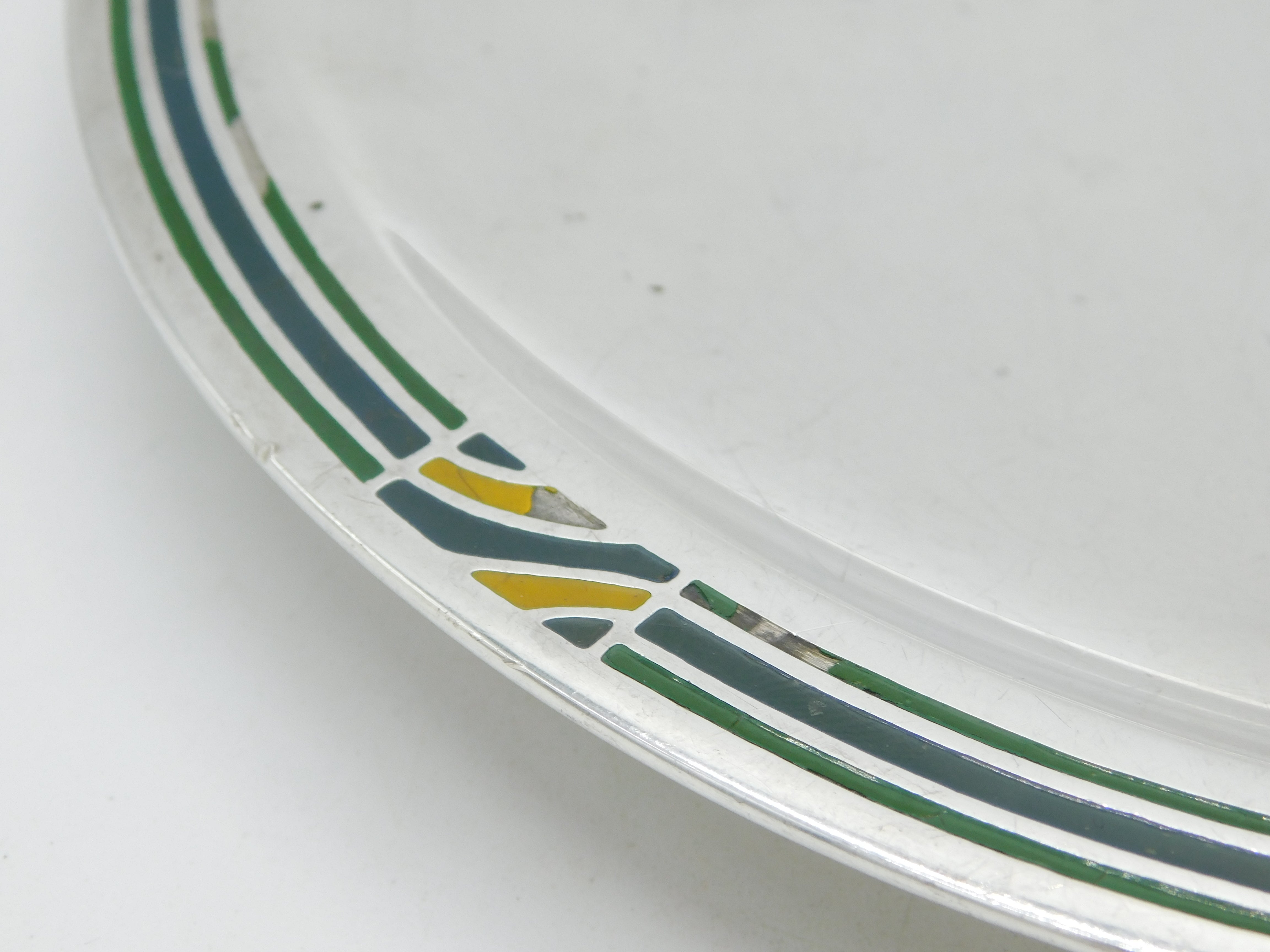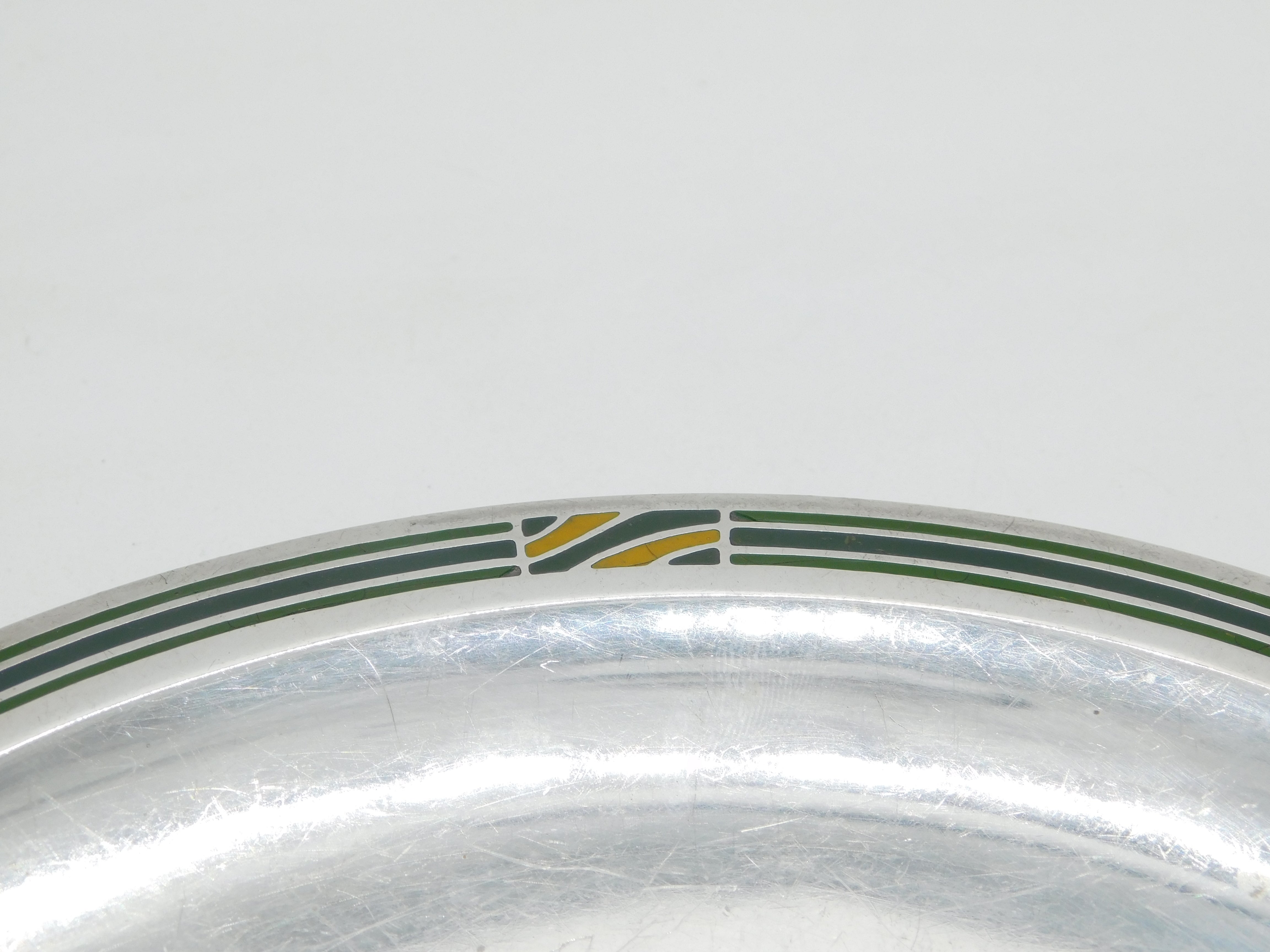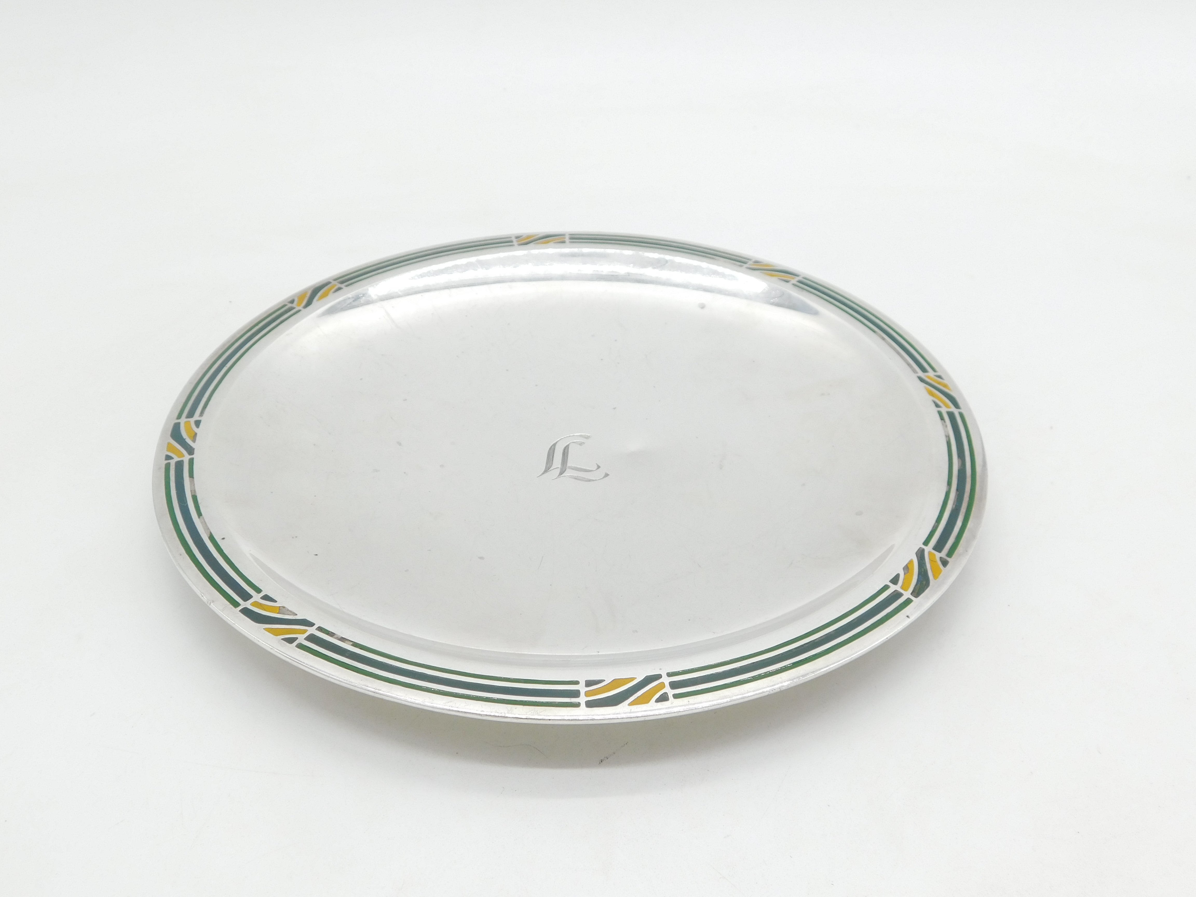 Details: A fantastic and wonderfully designed antique art deco Tiffany & Co. sterling silver & yellow-green enamel dinner plate with charming monogram initials to the centre, stamped with complete Tiffany hallmarks to the reverse - Pattern 6971 during the tenure of John C. Moore II c1920s. Minor wearing to the enamel in areas and dent next to the central initials please note. The item does not appear in the Tiffany public records and may be a commision example. This is a wonderful item that would make a perfect gift or addition to any collection.
