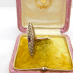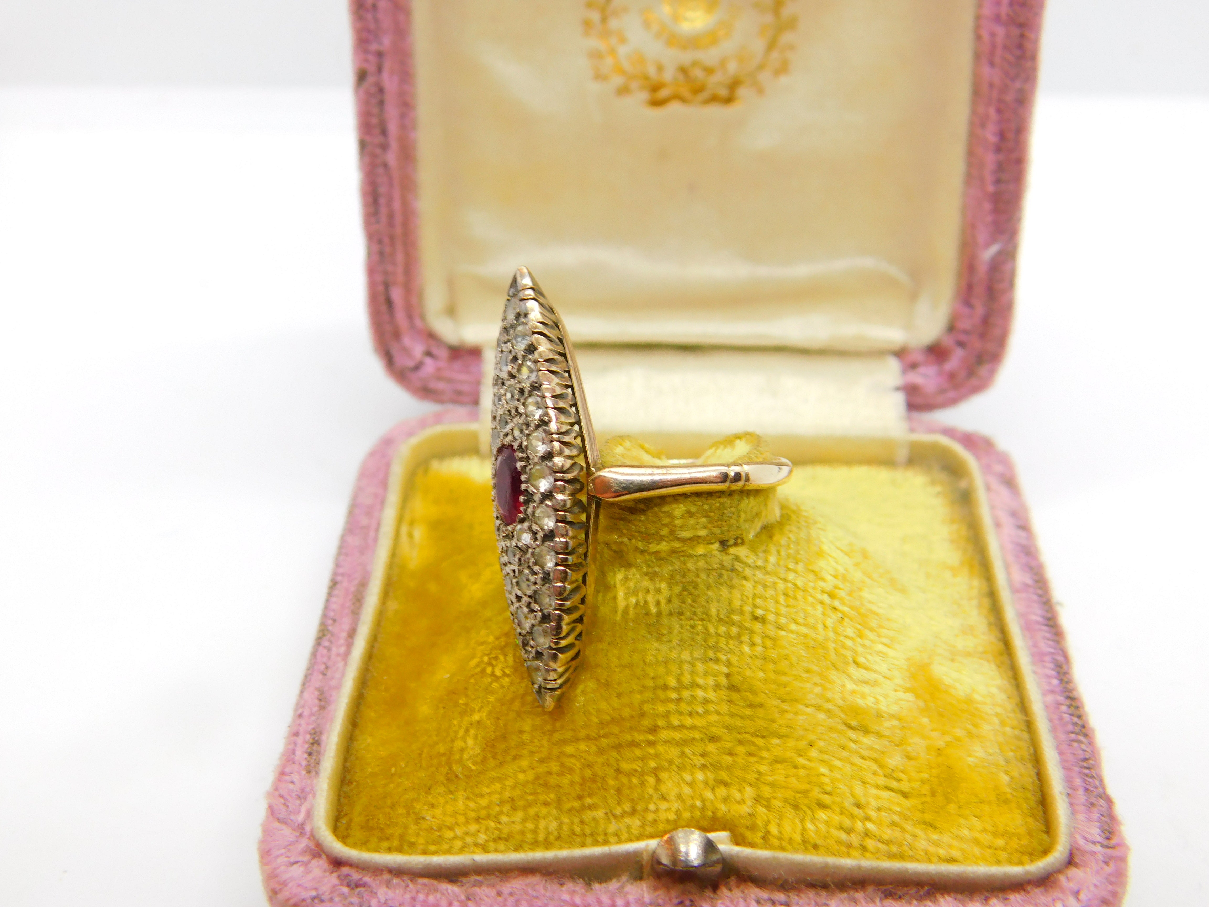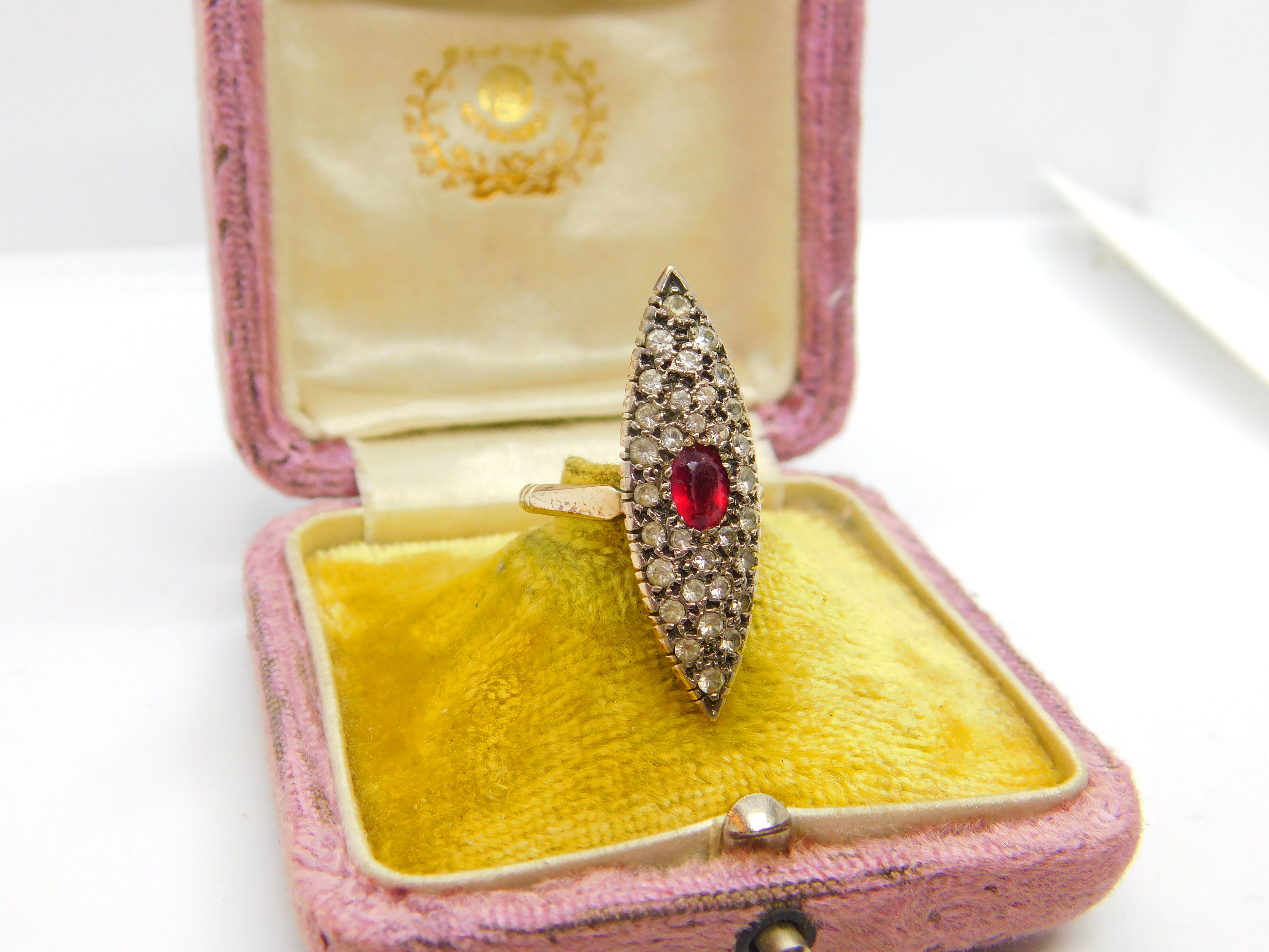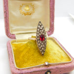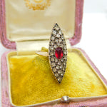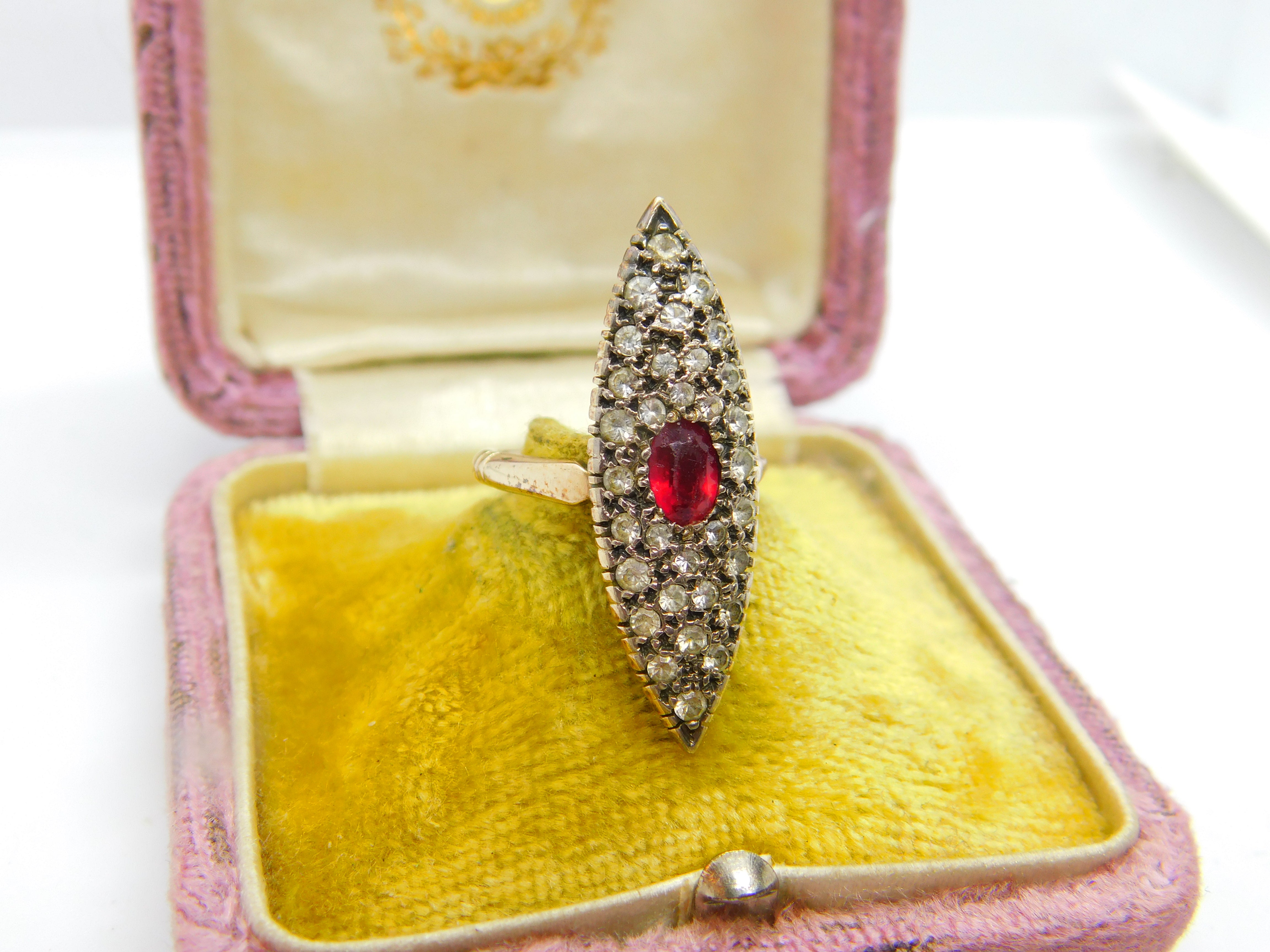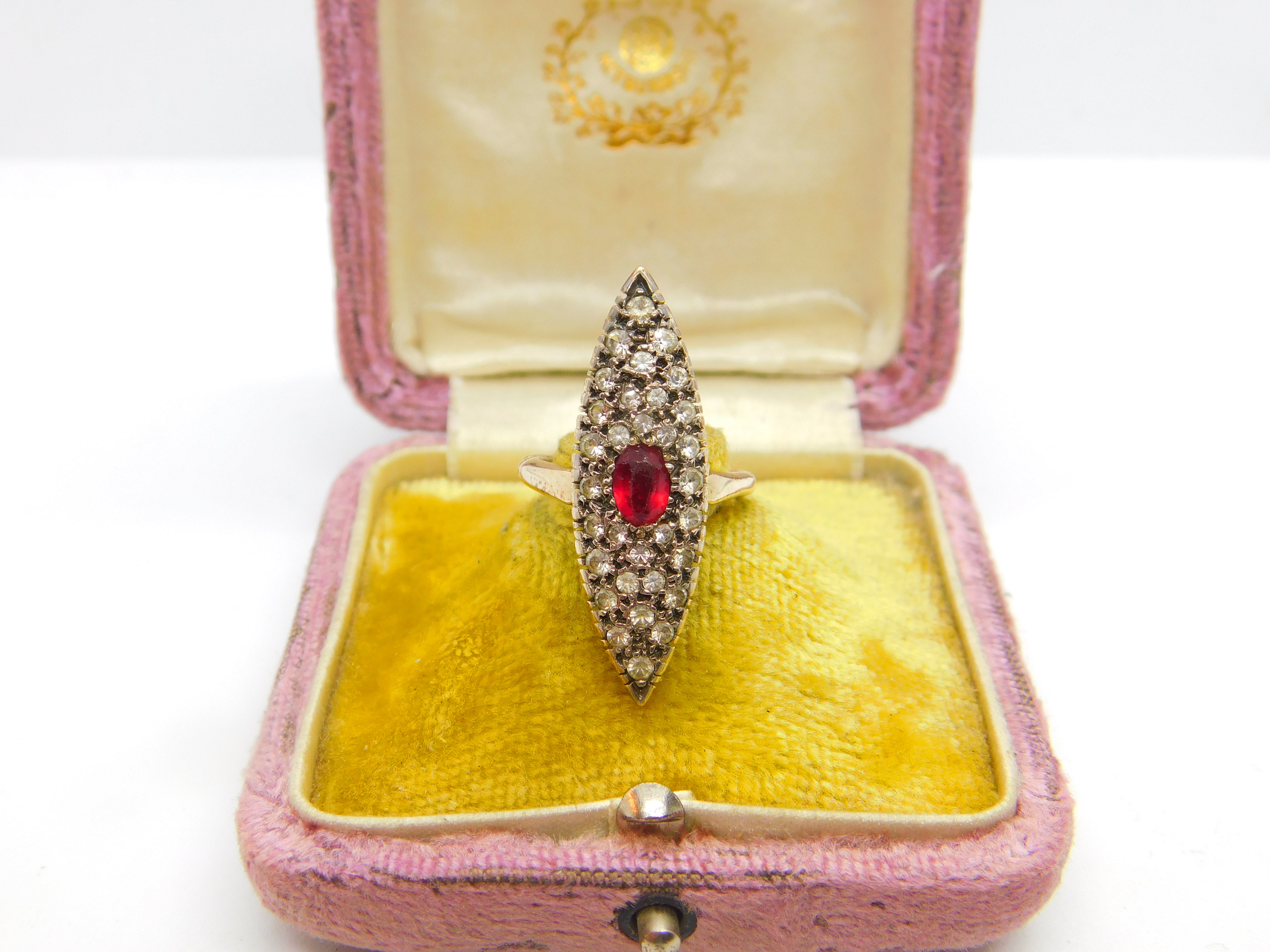 True Deco 9ct Rose Gold, Red-White Paste Stone Marquise Form Shield Ring c1930