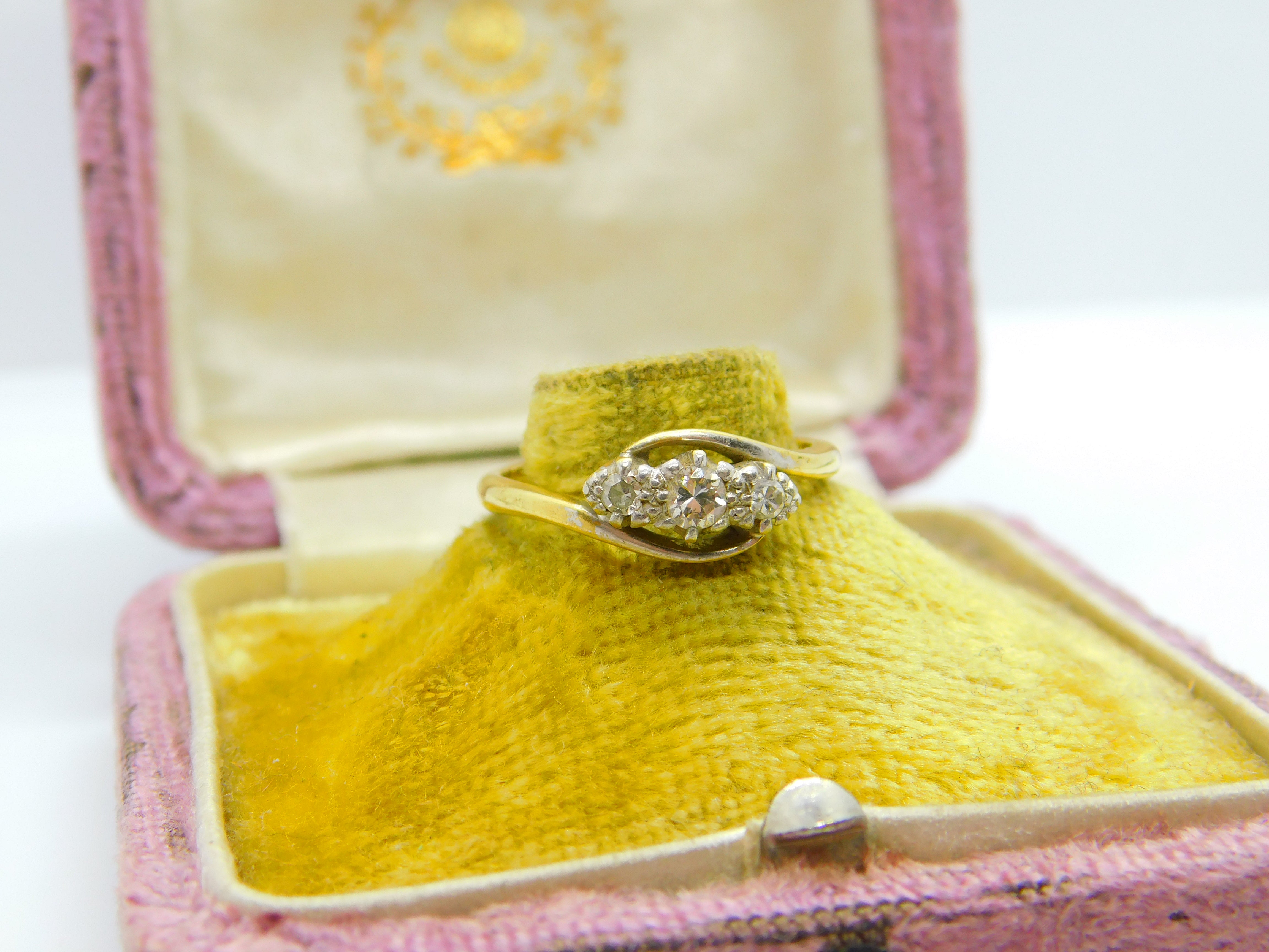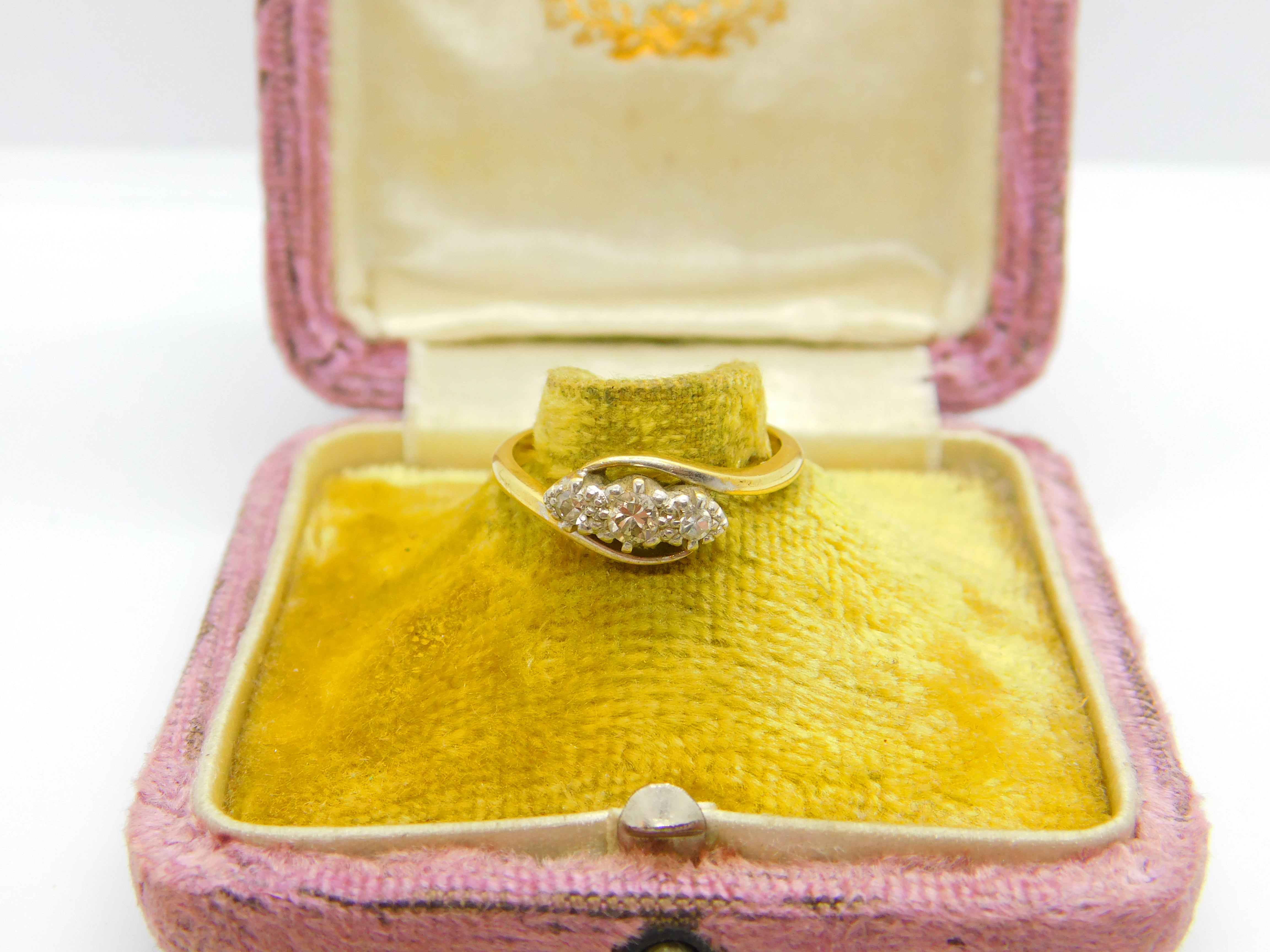 Details: A fantastic and wonderfully designed antique Victorian 18ct yellow gold crossover ring with platinum set diamonds to the centre (the central stone approx. 0.1ct flanked by two 0.05ct diamonds) clearly hallmarked to the interior band c1890. The diamonds have been tested. This is a wonderful item that would make a perfect gift or addition to any collection. The BOX pictured is for PRESENTATION ONLY and is NOT included in the listings but used to frame the pictures unless specifically stated otherwise.