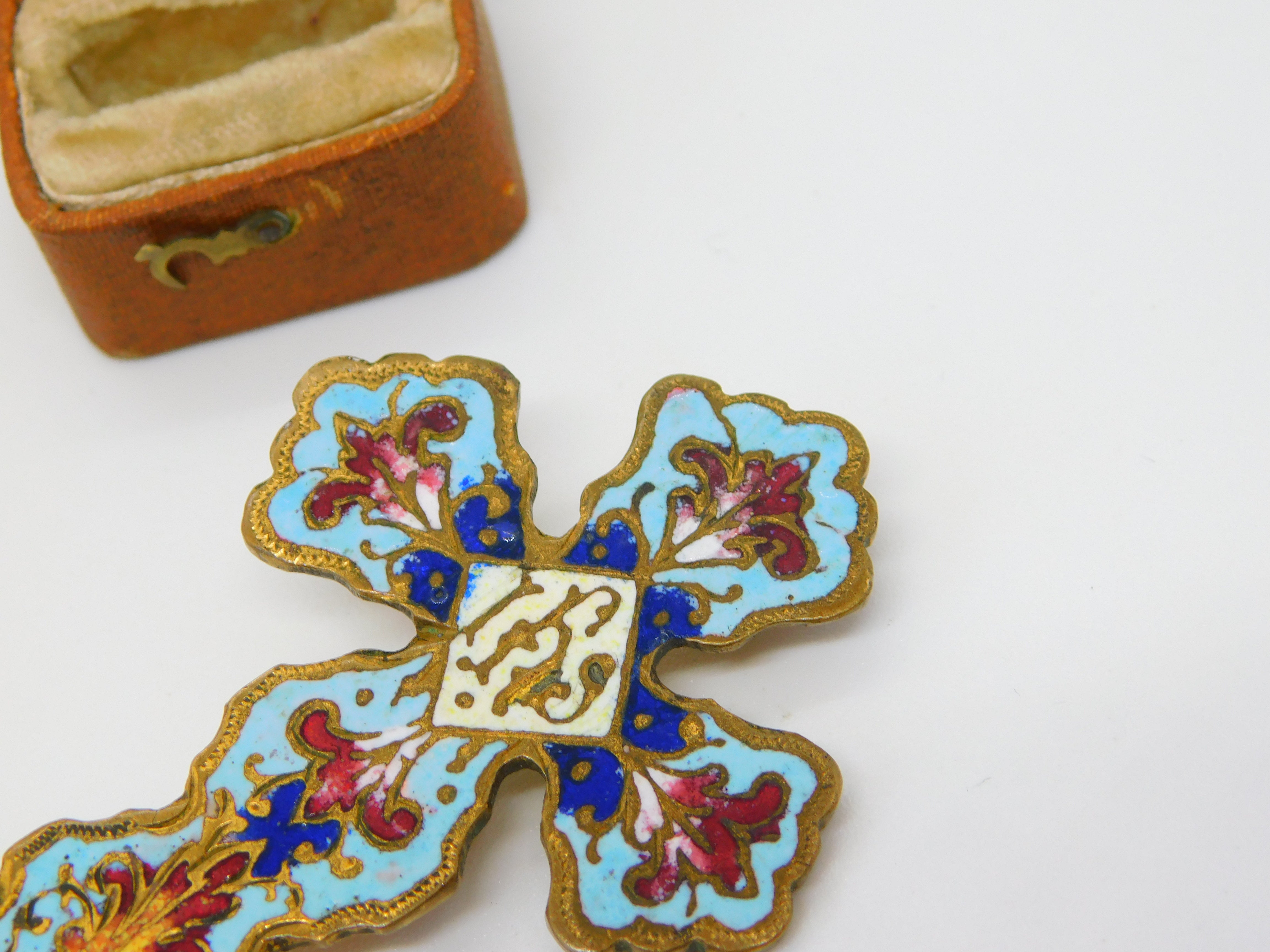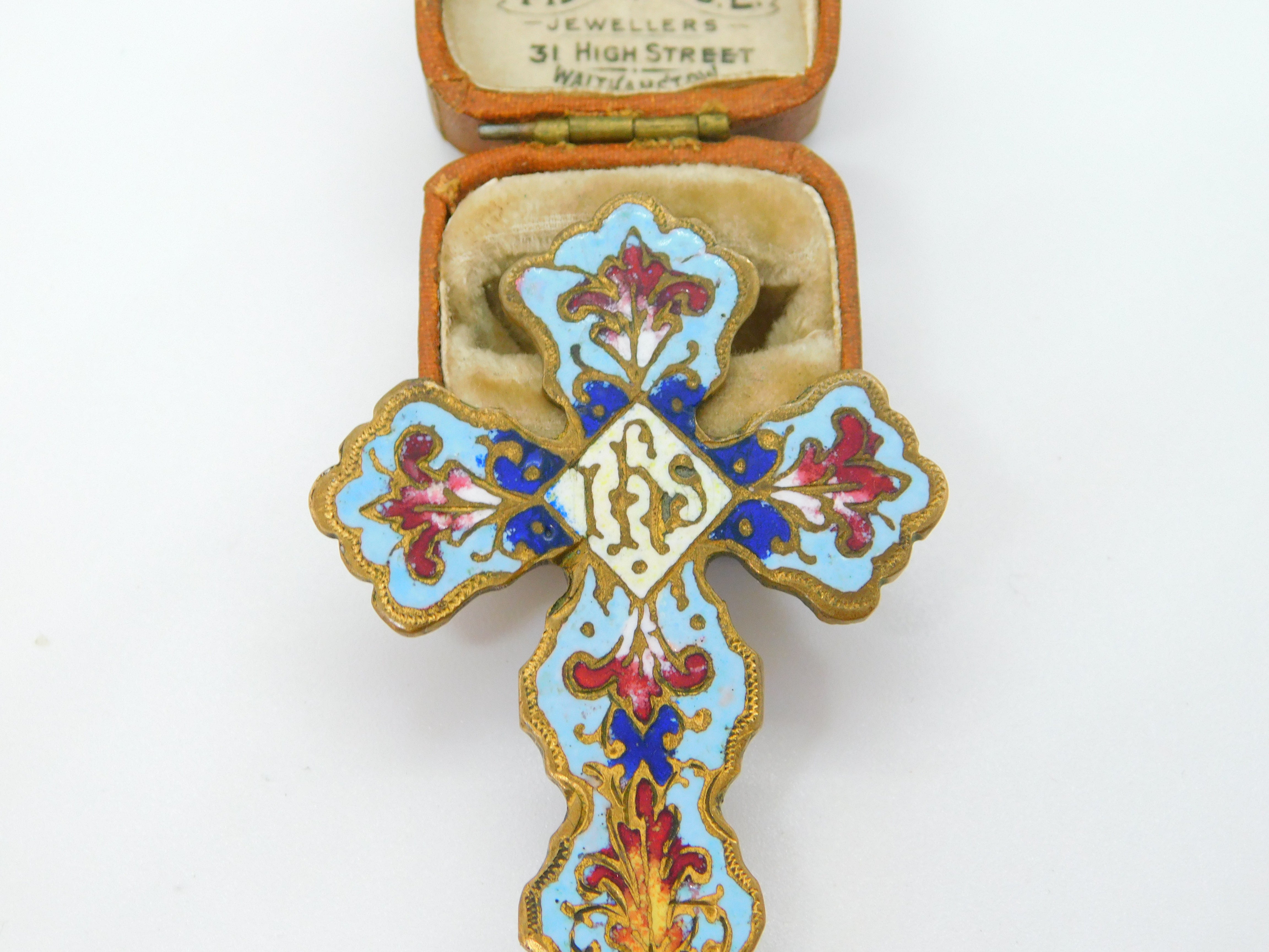 Details: A fantastic and wonderfully designed antique Victorian gilt metal and colorful enamel IHS religious christian cross finial or adornment with superb detailing c1860. Would equally look wonderful set on a wooden box. This is a wonderful item that would make a perfect gift or addition to any collection. The BOX pictured is for PRESENTATION ONLY and is NOT included in the listings but used to frame the pictures unless specifically stated otherwise.