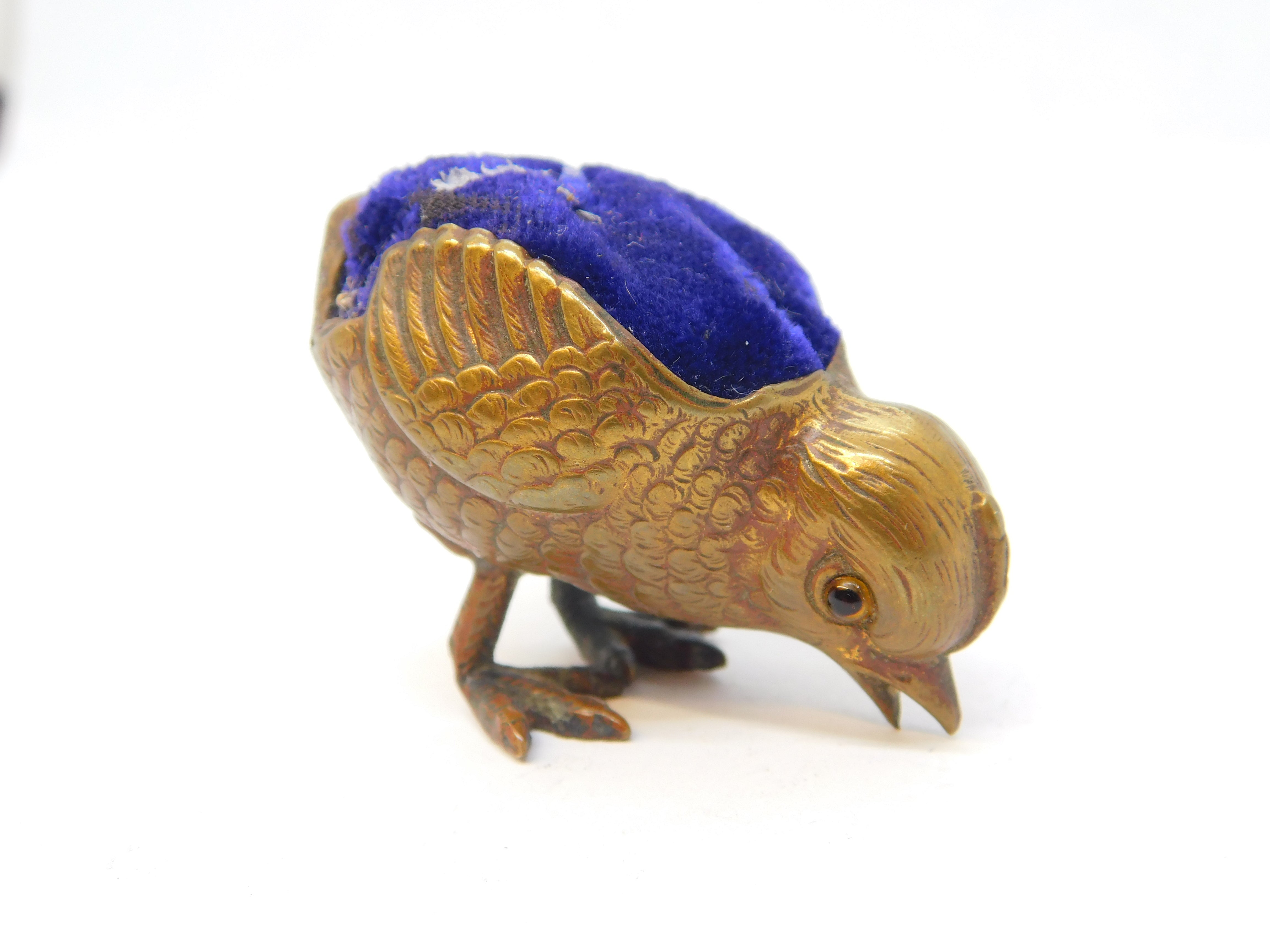 Details: A fantastic and wonderfully designed antique Victorian gilt metal novelty pecking chick form pin cushion c1880, missing one of the eyes please note. This is a wonderful item that would make a perfect gift or addition to any collection.
