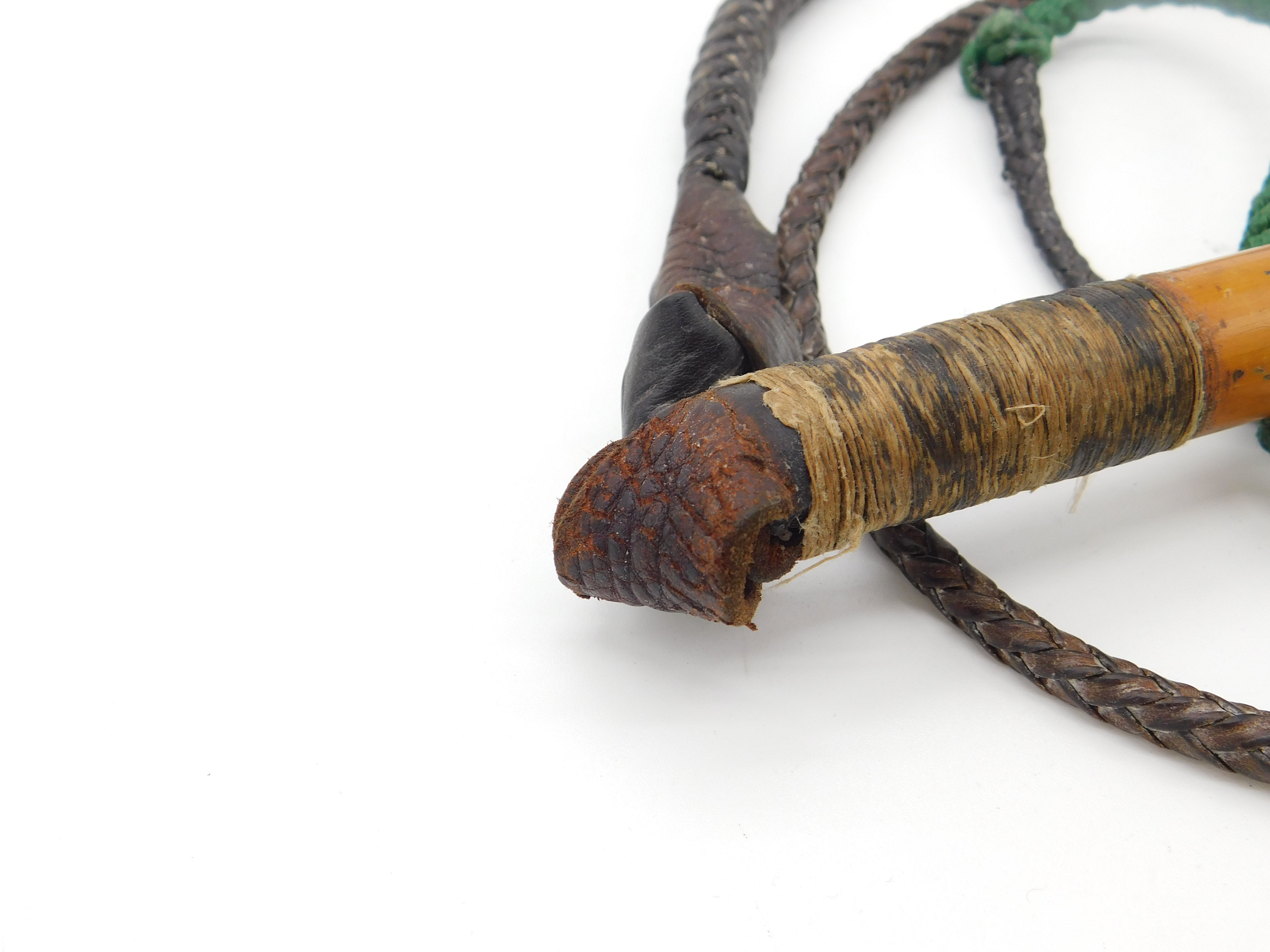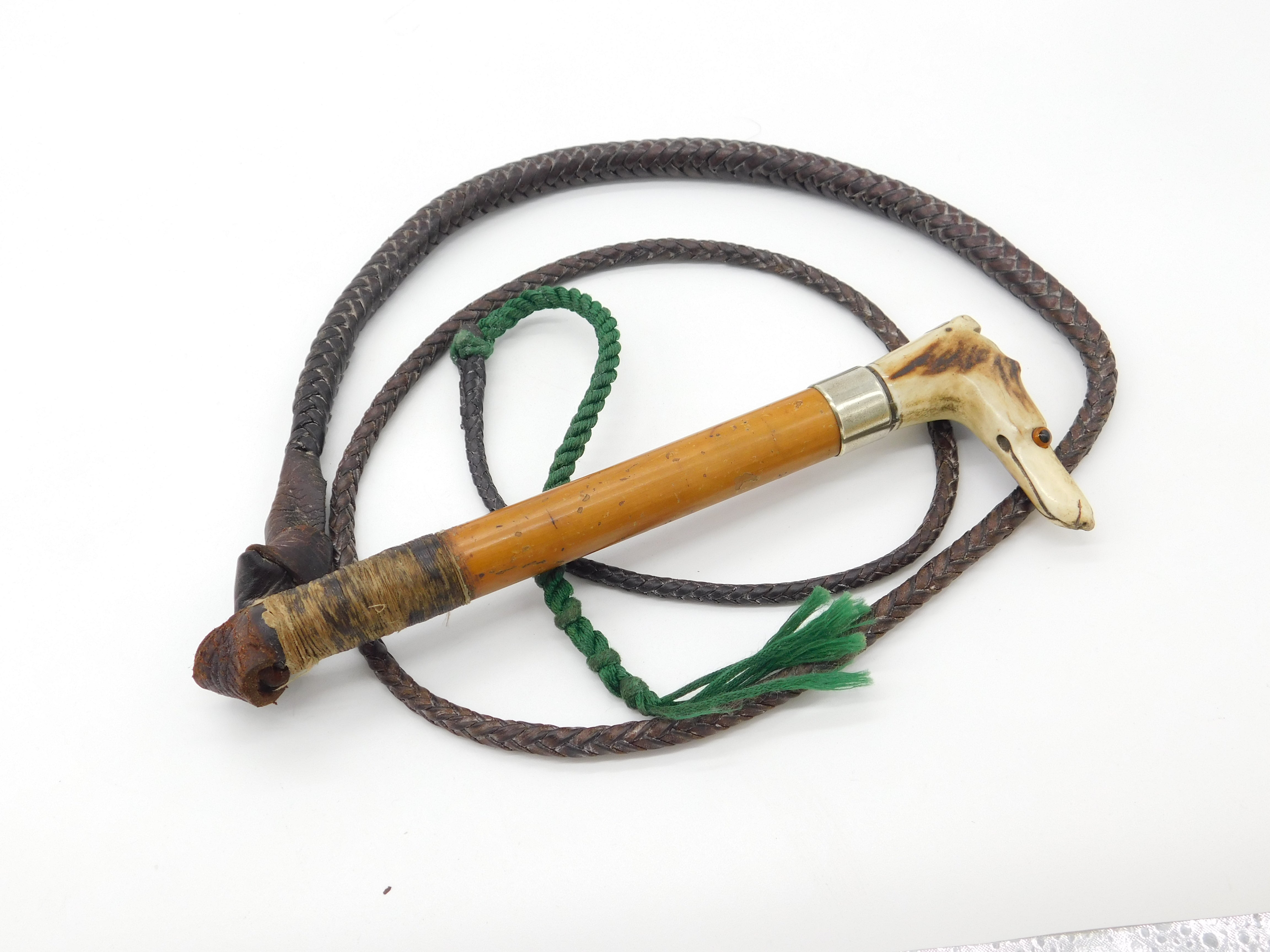 Details: A fantastic and wonderfully designed antique Victorian beagling hunting crop or whip with short stem crafted from fruit wood with leather thong attached c1890. The beauty of this whip lies in the carved antler top shaped in the form of a beagles head with eyes and even a perfectly functional dog whistle to the back of the whip. Simply charming. The area of leather where the whip joins the thoing is slightly worn but perfectly usable. This is a wonderful item that would make a perfect gift or addition to any collection. The BOX pictured is for PRESENTATION ONLY and is NOT included in the listings but used to frame the pictures unless specifically stated otherwise.