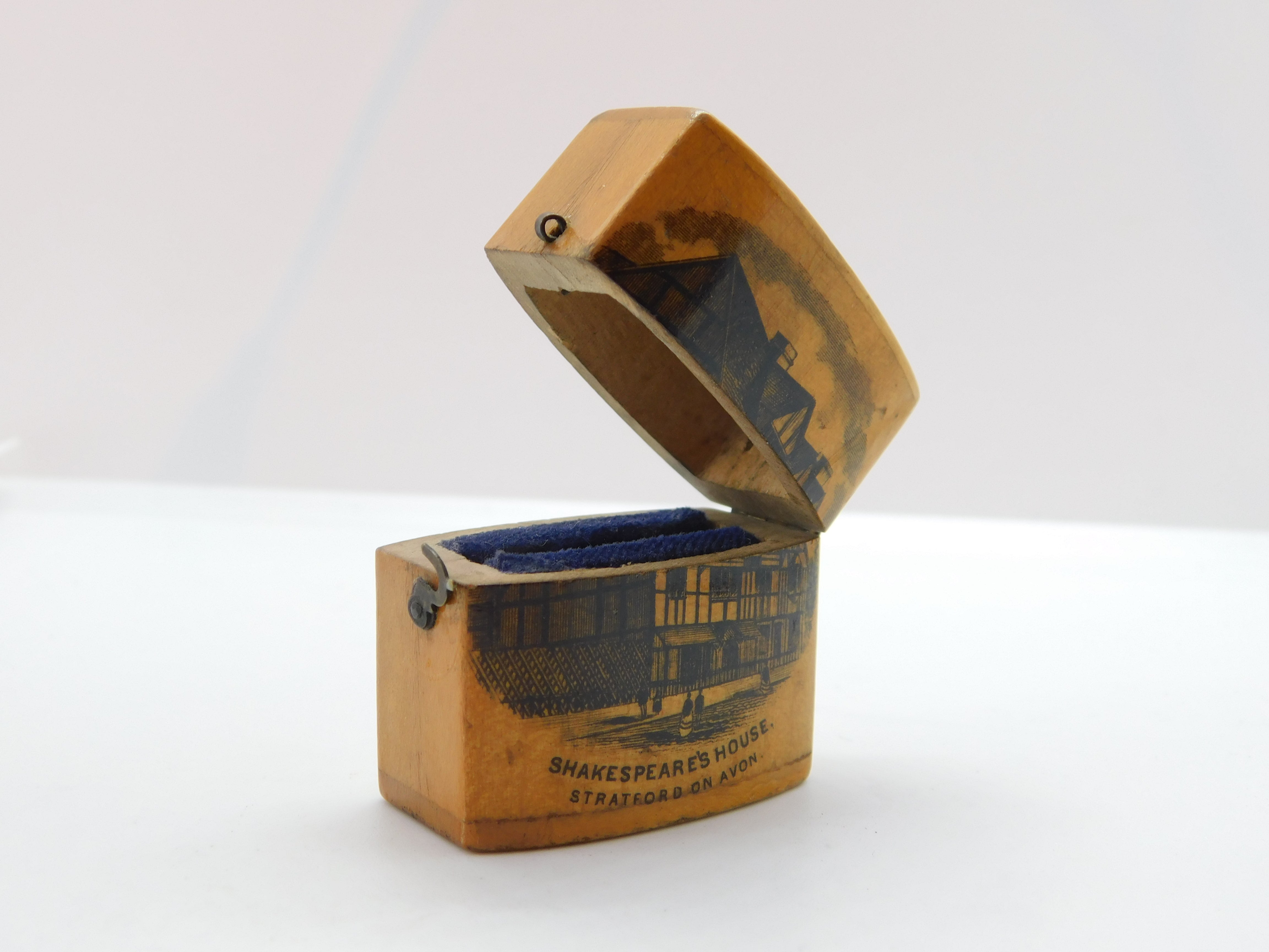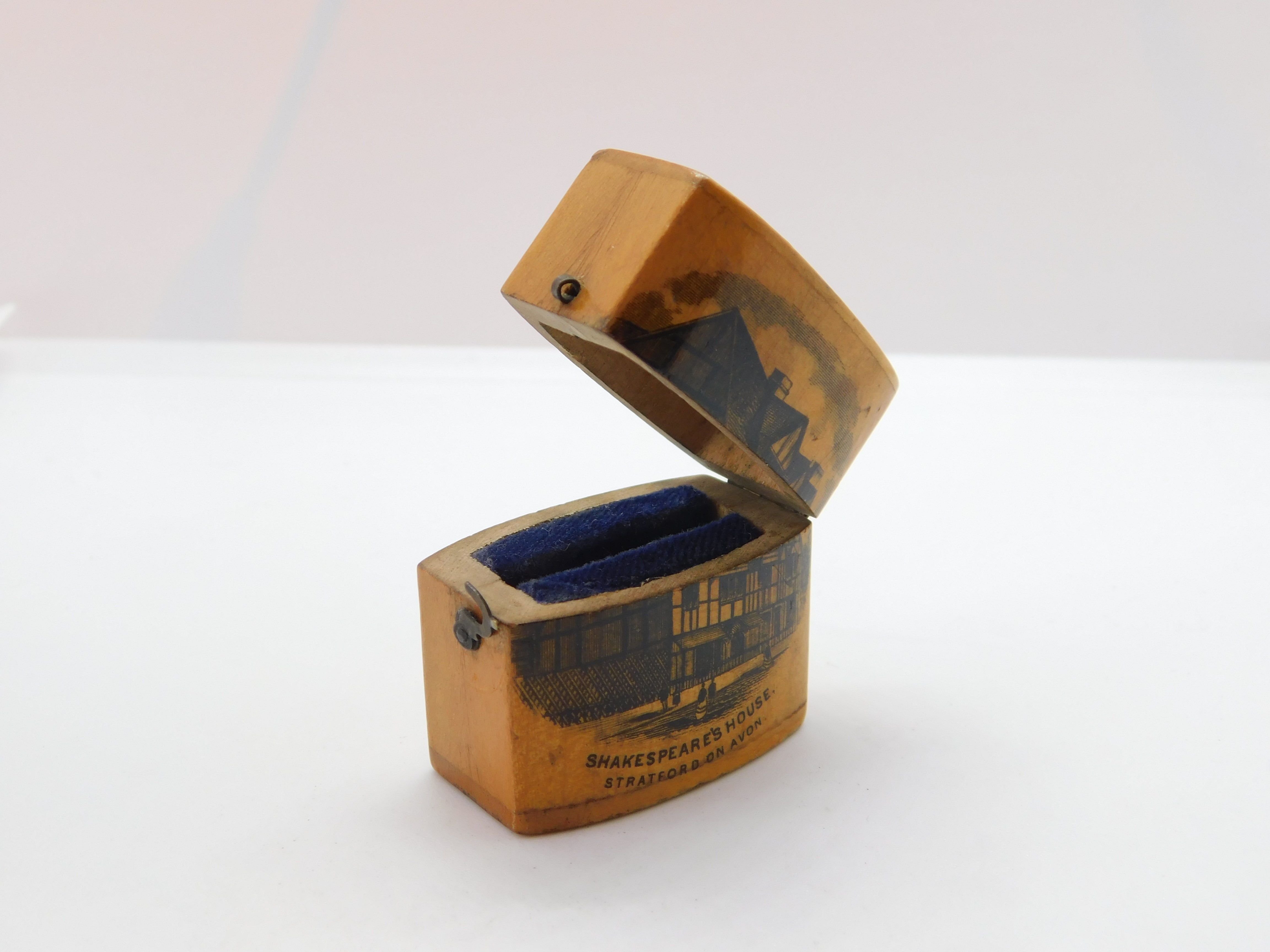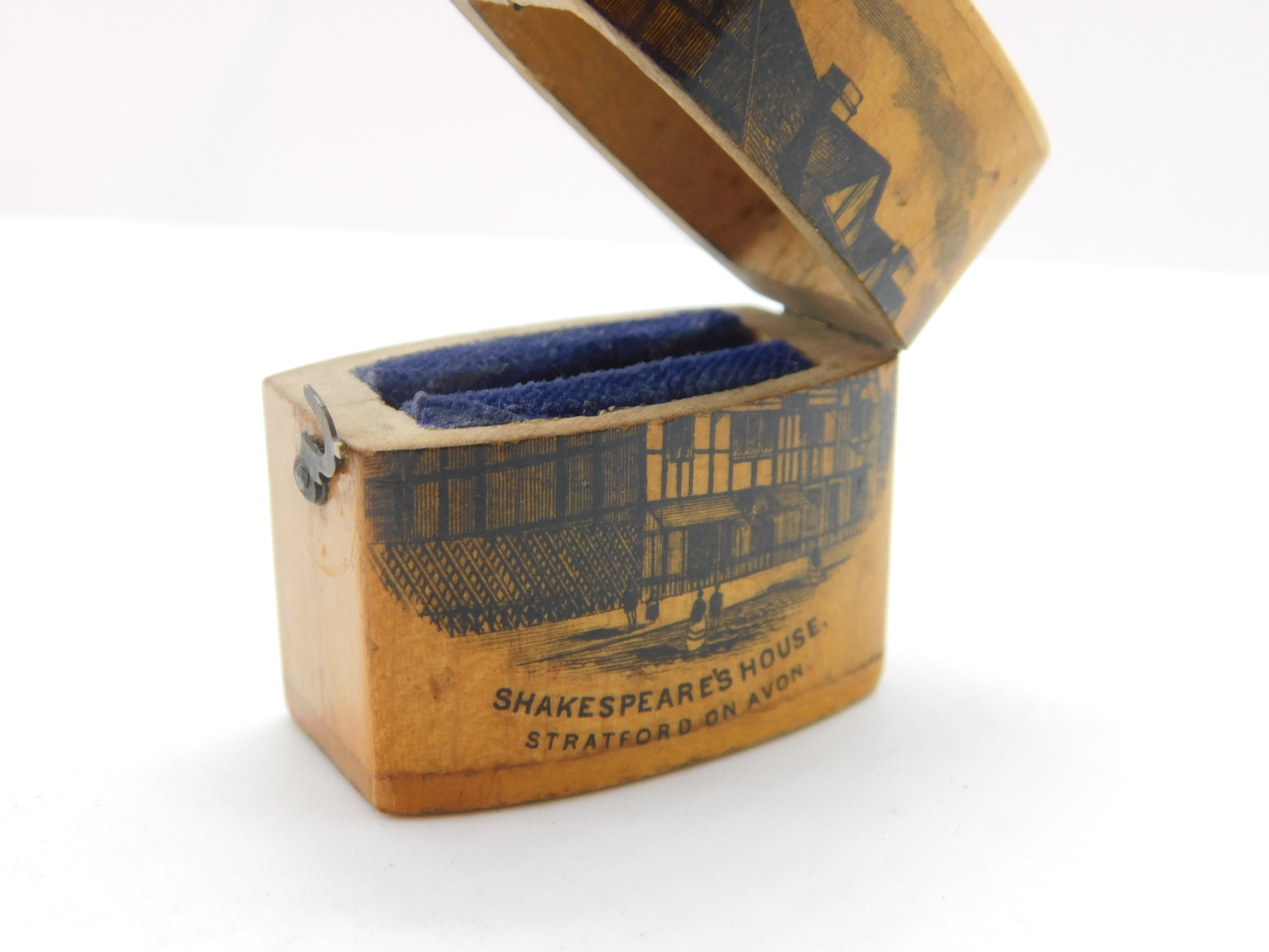 Details: A fantastic and wonderfully designed antique Victorian unusual mauchline ware treen jewellery ring box depicting William Shakespeare's House to the edge c1890. This is a wonderful item that would make a perfect gift or addition to any collection. The BOX pictured is for PRESENTATION ONLY and is NOT included in the listings but used to frame the pictures unless specifically stated otherwise.