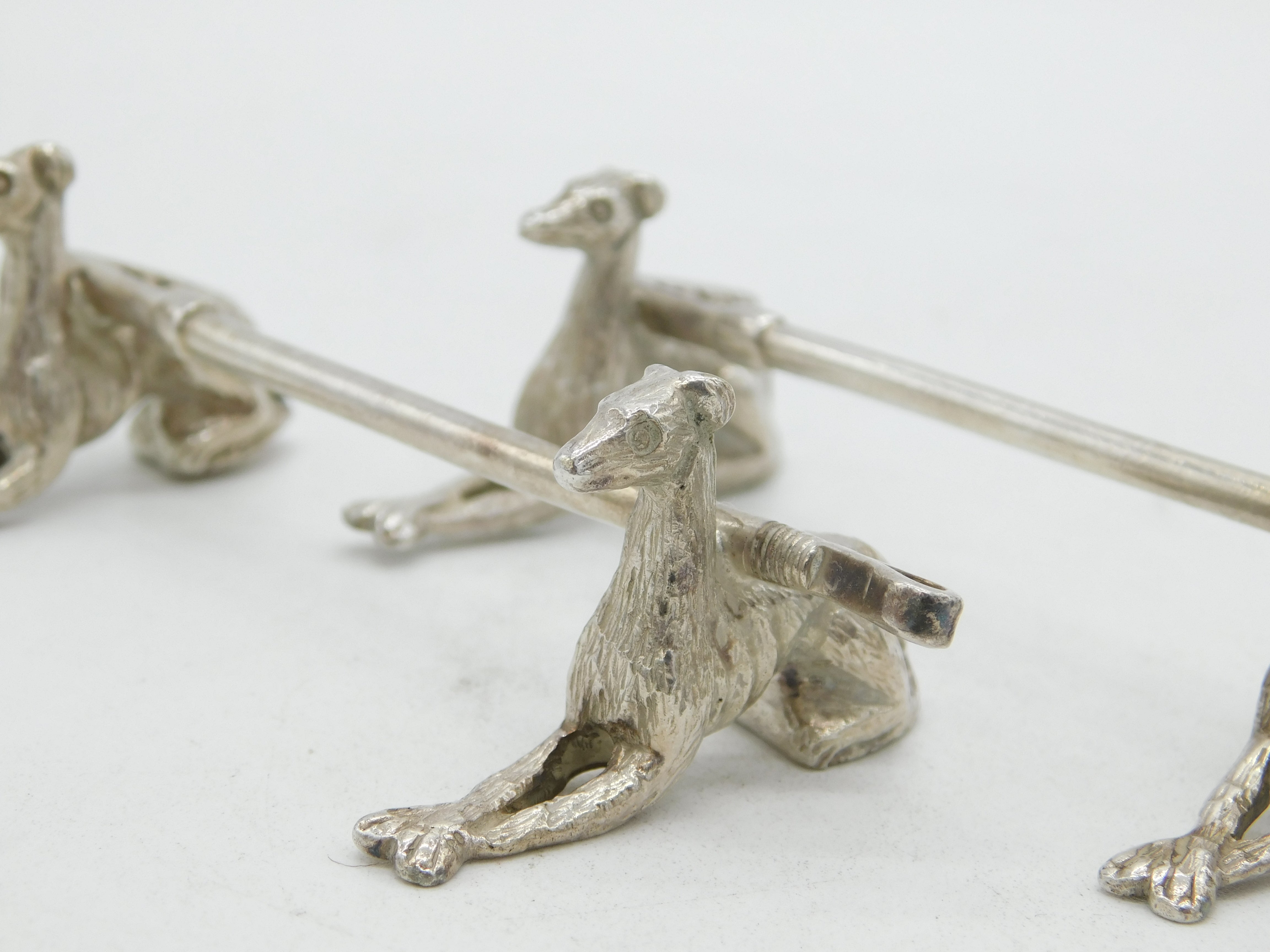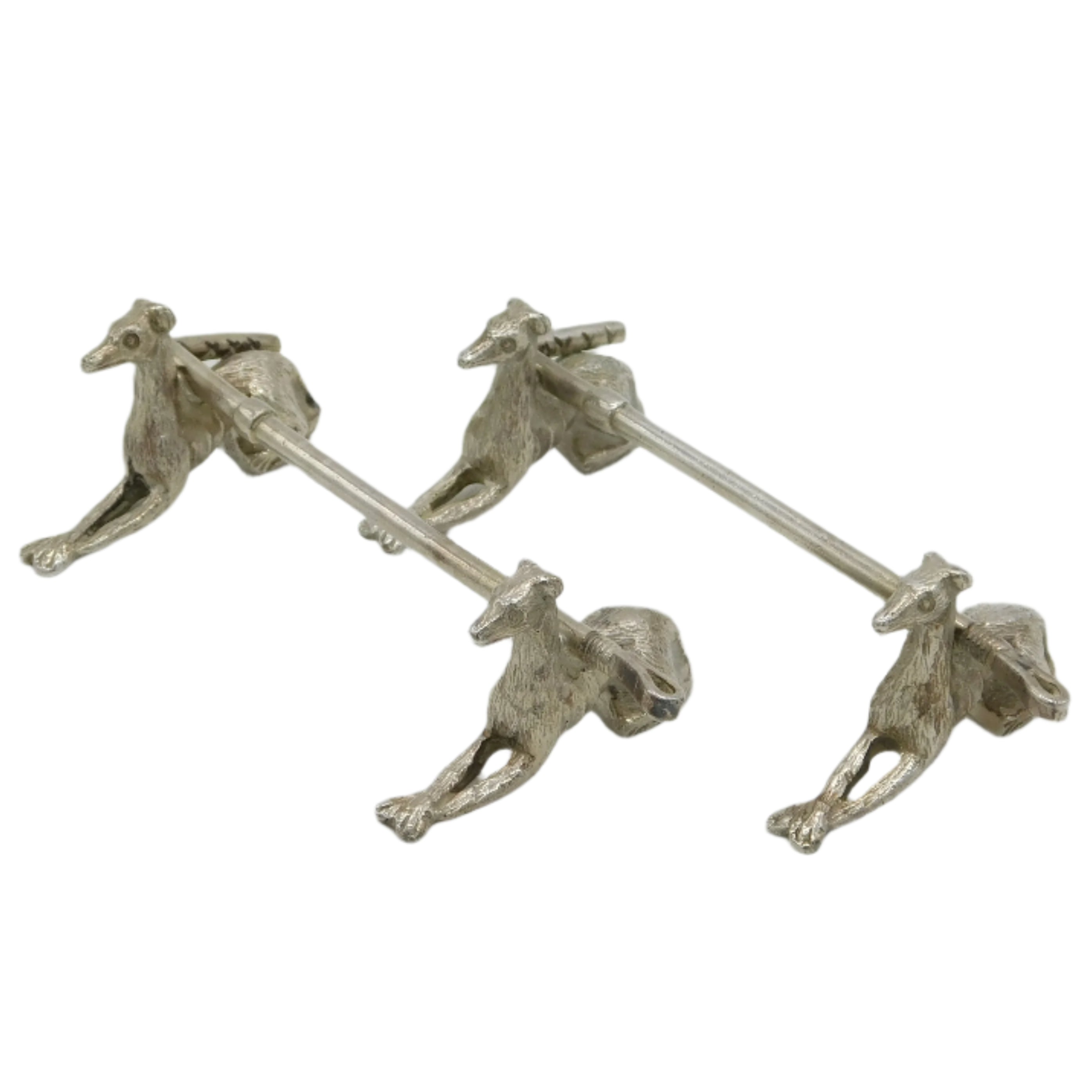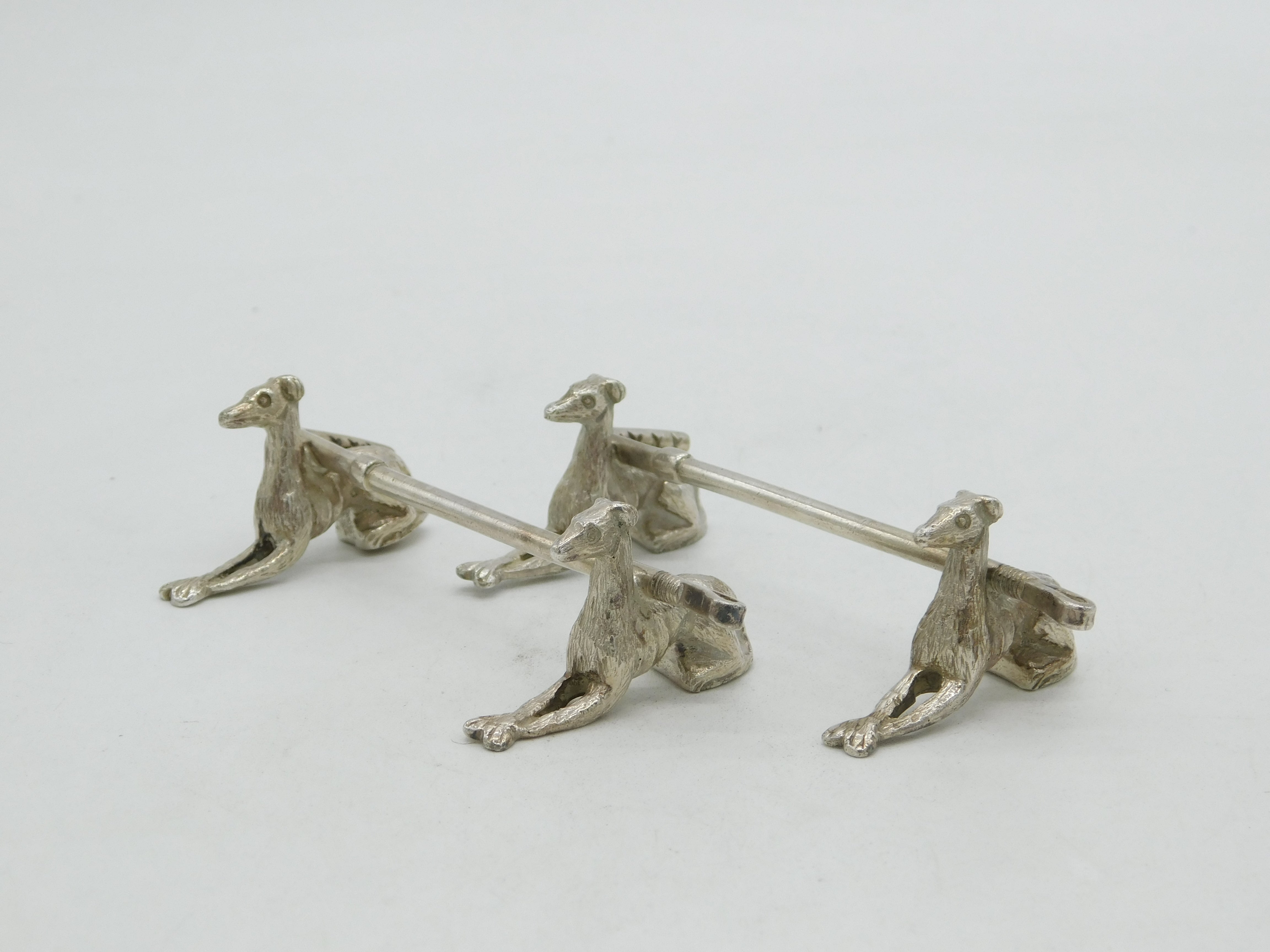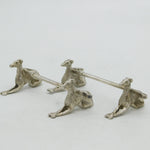 Details: A fantastic and wonderfully designed pair of antique Victorian cast silver plated knife rests in the form of hounds with a hunting crop acting as the rest c1880. This is a wonderful item that would make a perfect gift or addition to any collection.