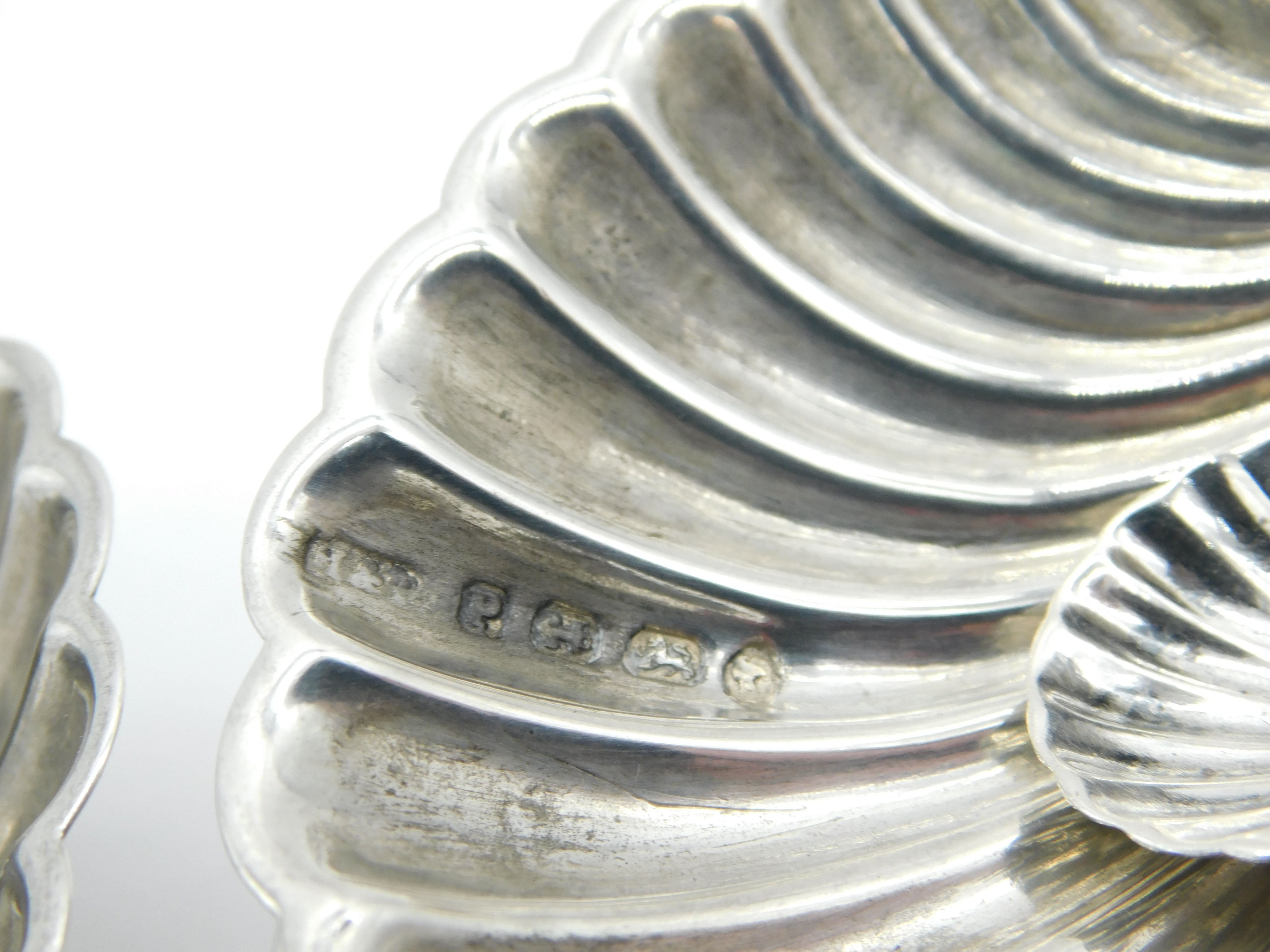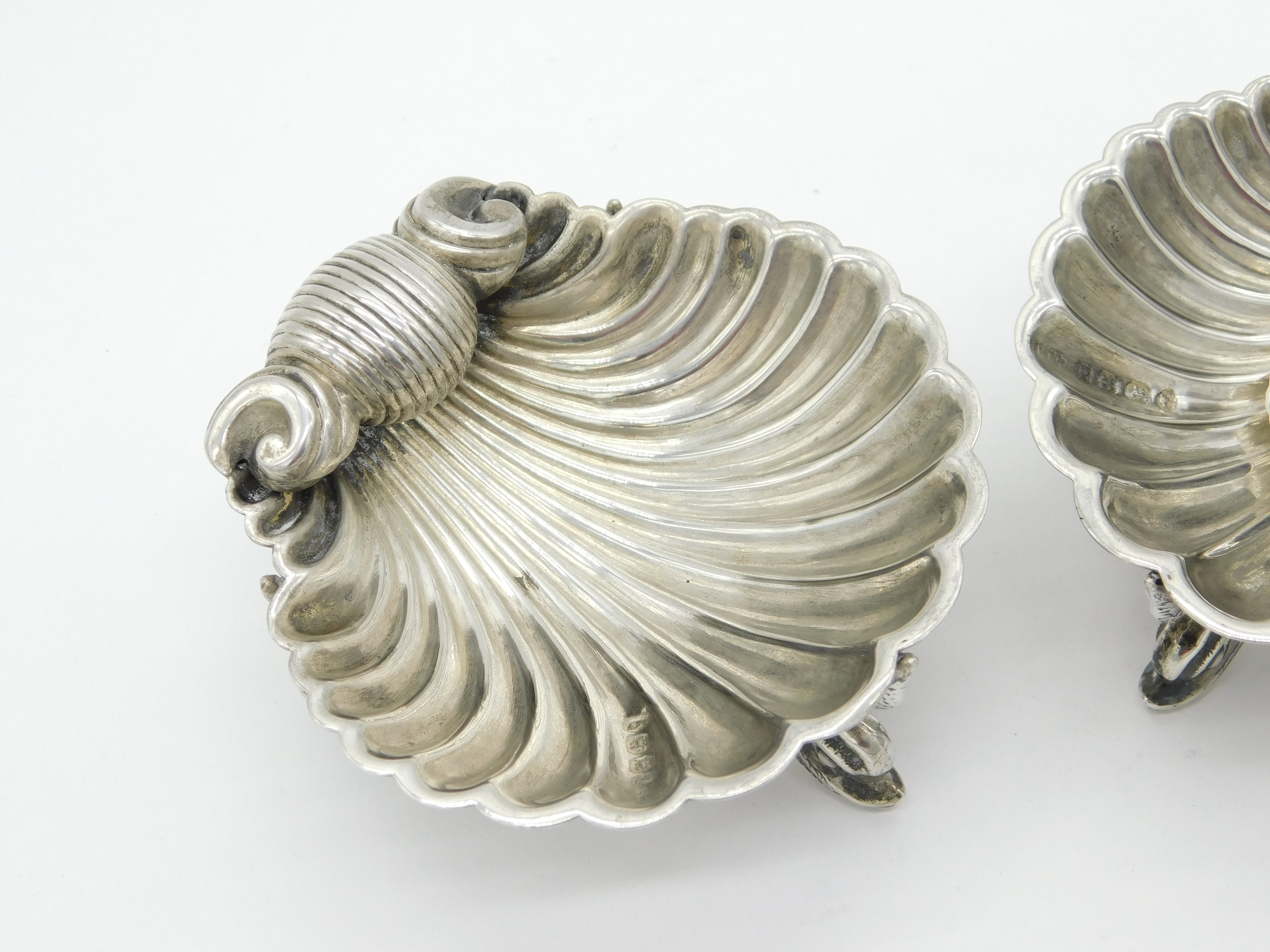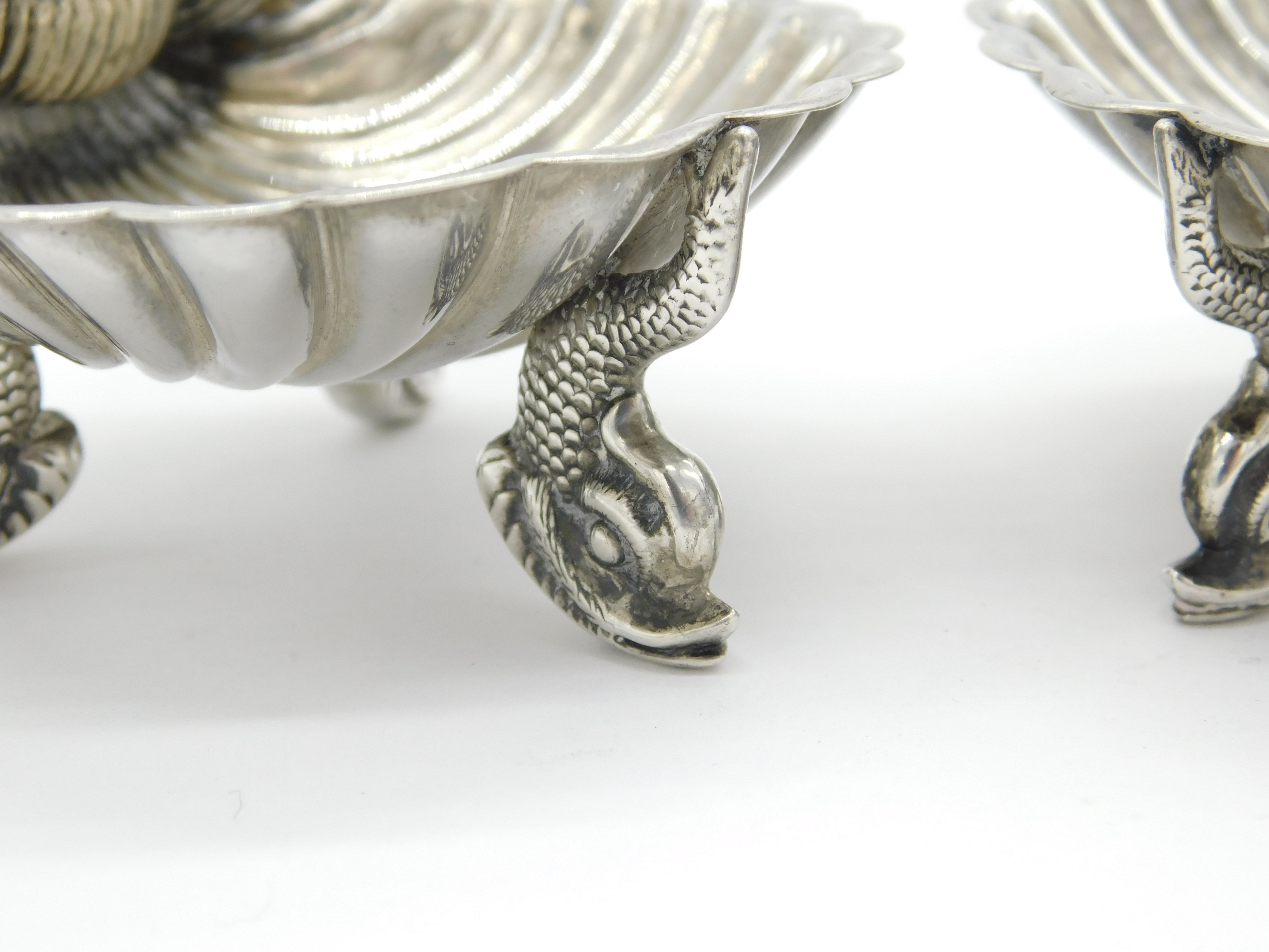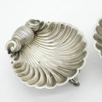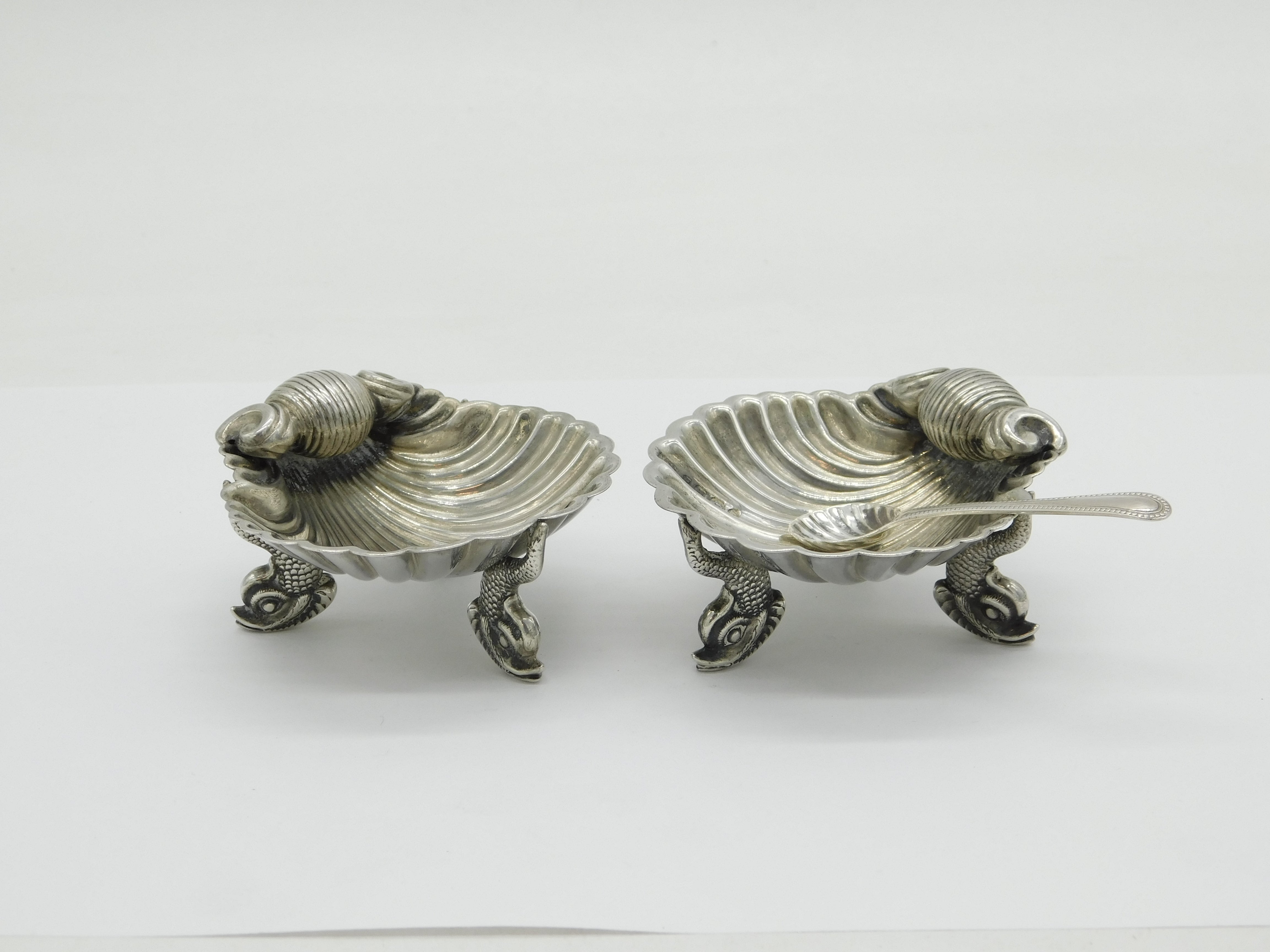 Details: A fantastic and wonderfully designed antique Victorian pair of ornate sterling silver scallop shell dolphin salt cellars with lovely detailing hallmarked Birmingham 1864 by Hilliard & Thomason. This is a wonderful item that would make a perfect gift or addition to any collection. We are more than happy to provide XRF reports for items upon request.