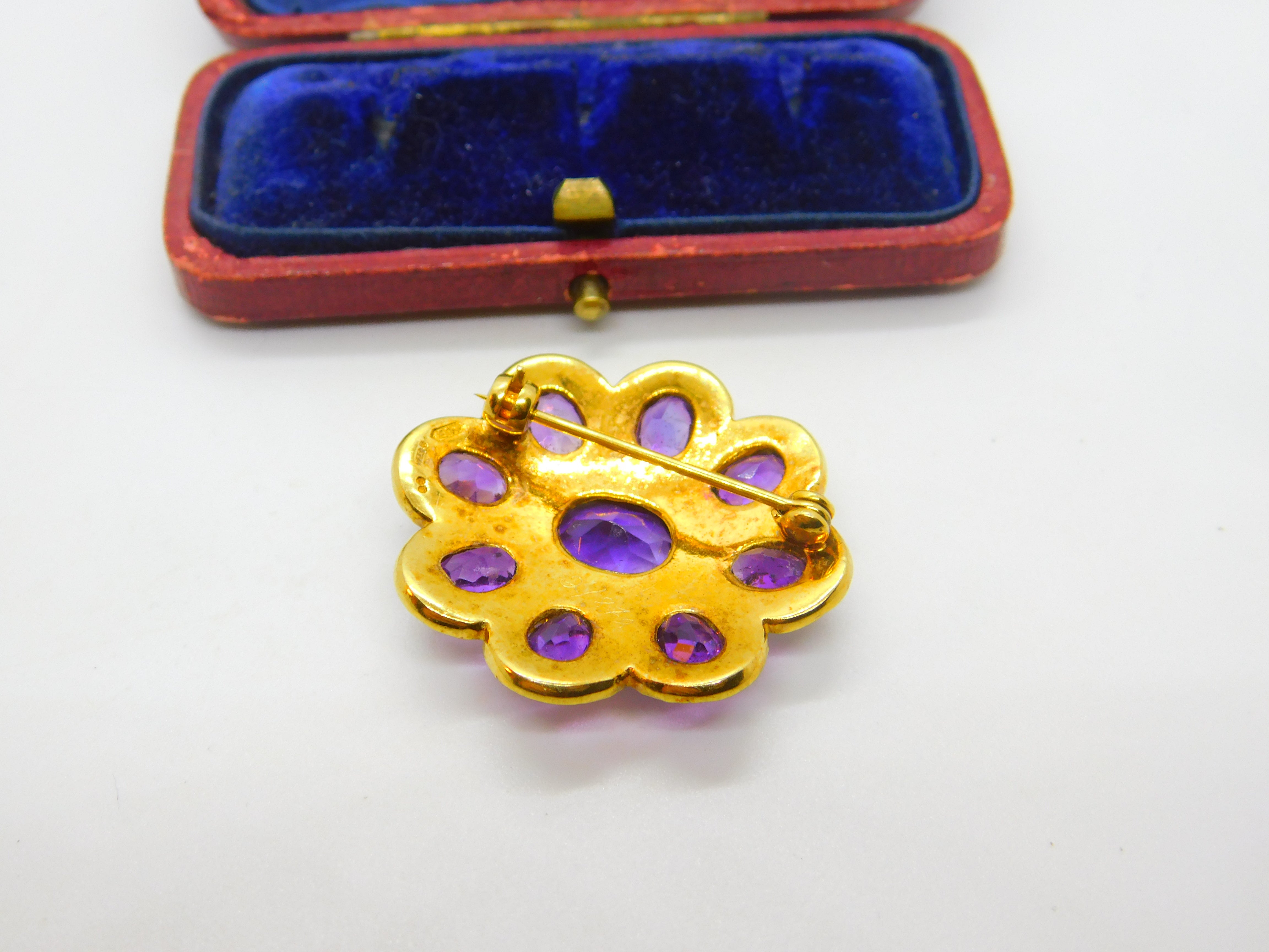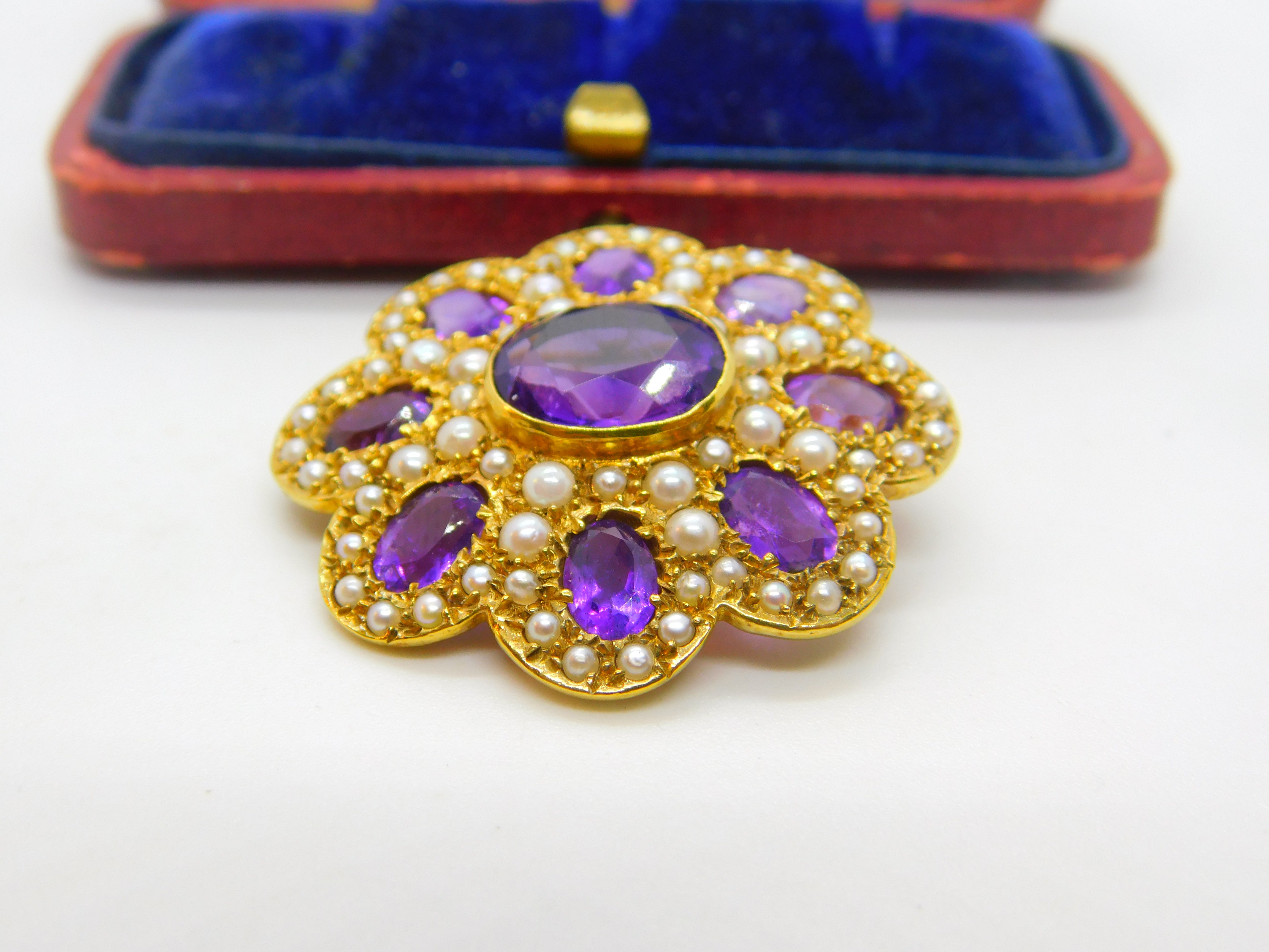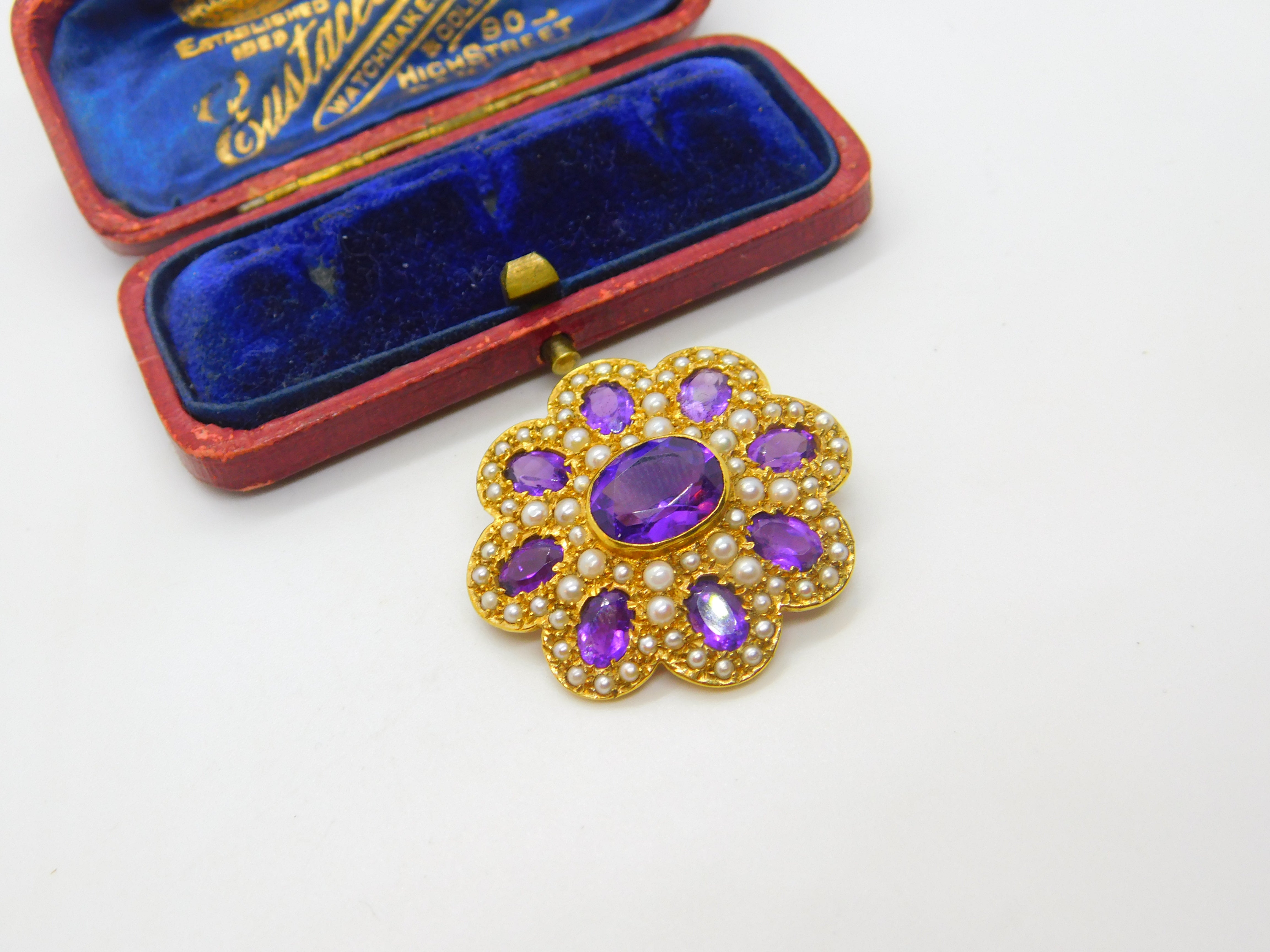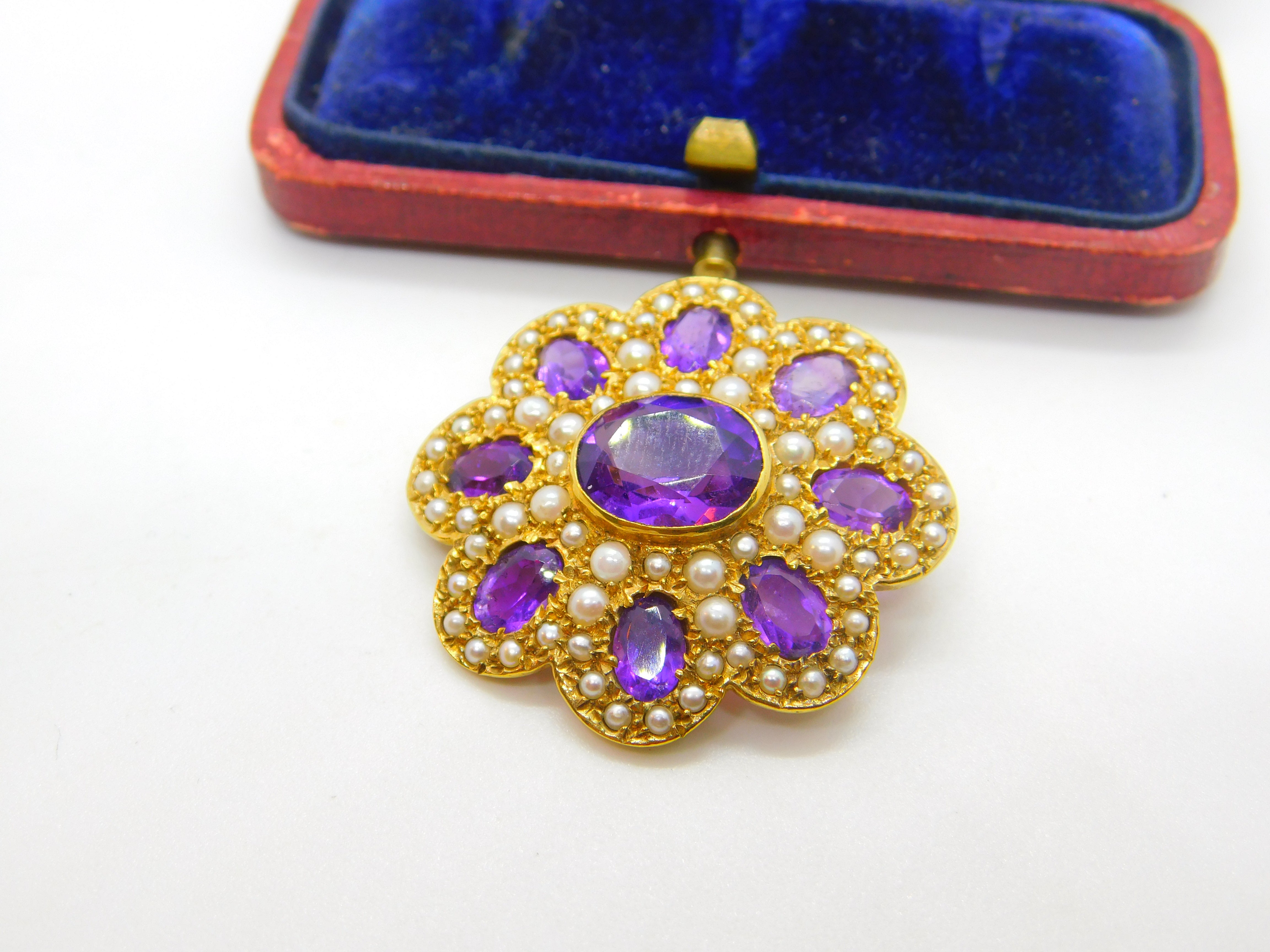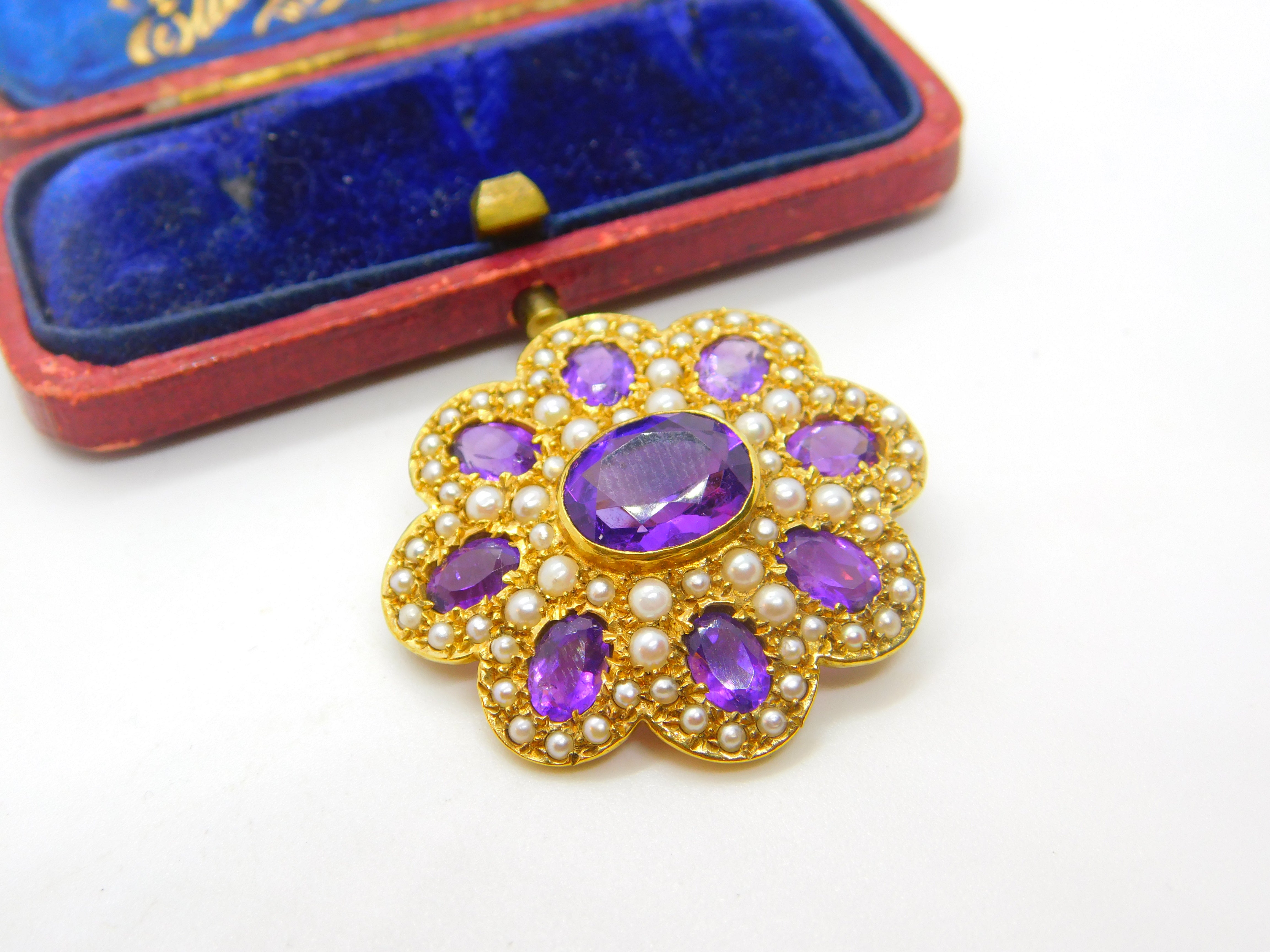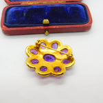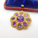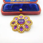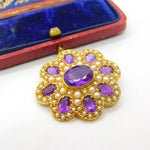 Victorian Revival 9ct Gold, Amethyst & Seed Pearl Floral Brooch 1972 London
