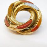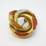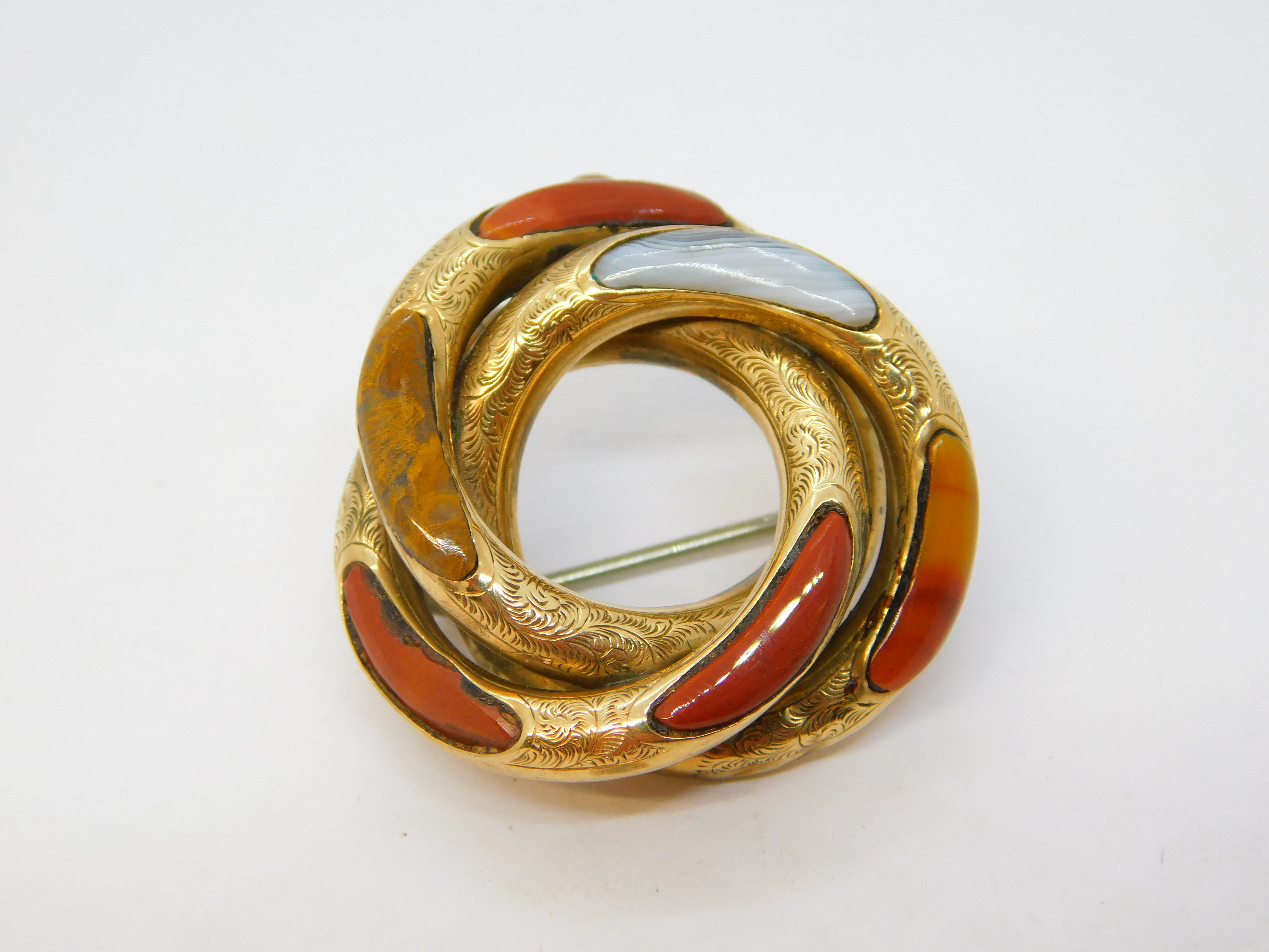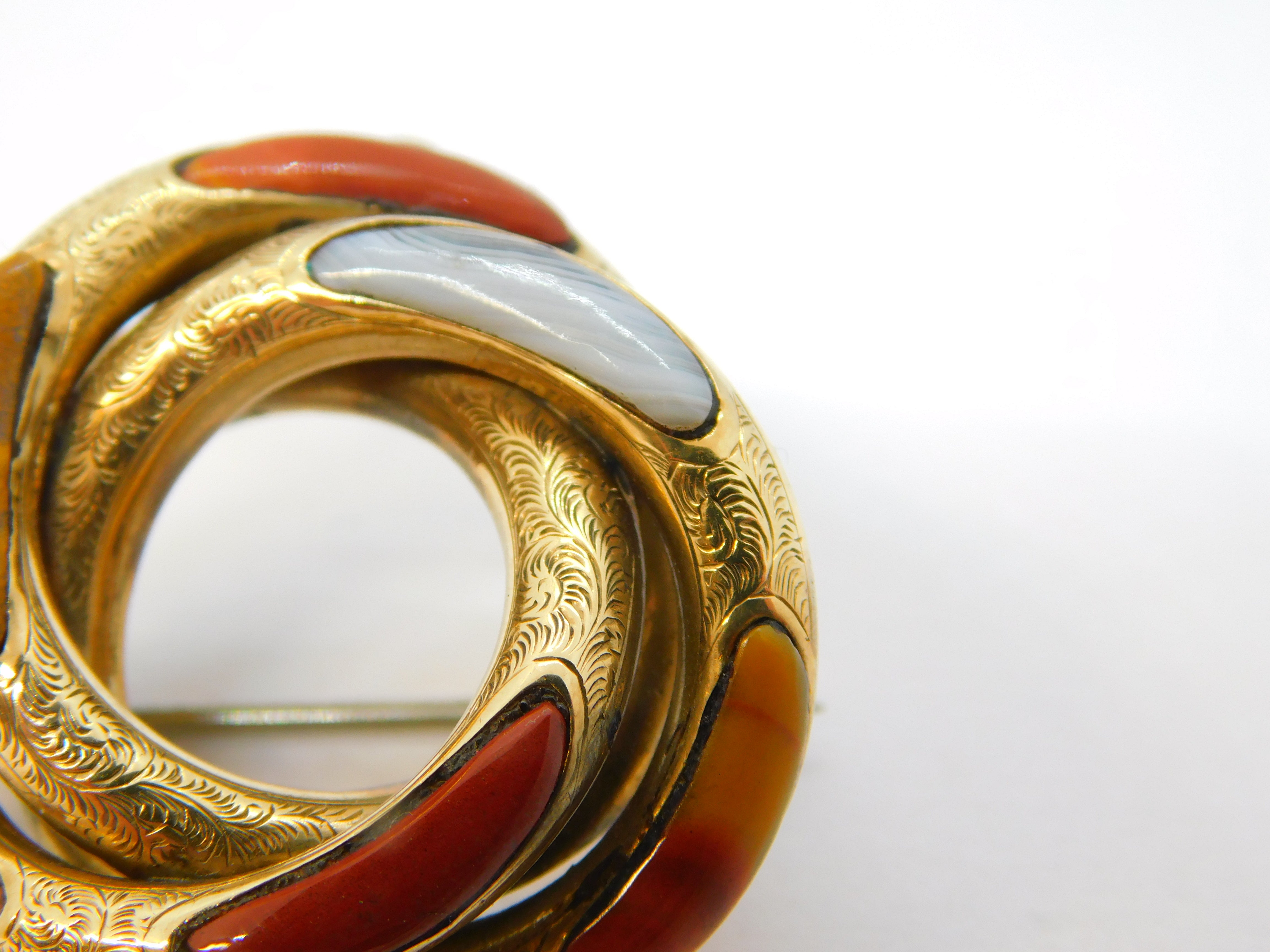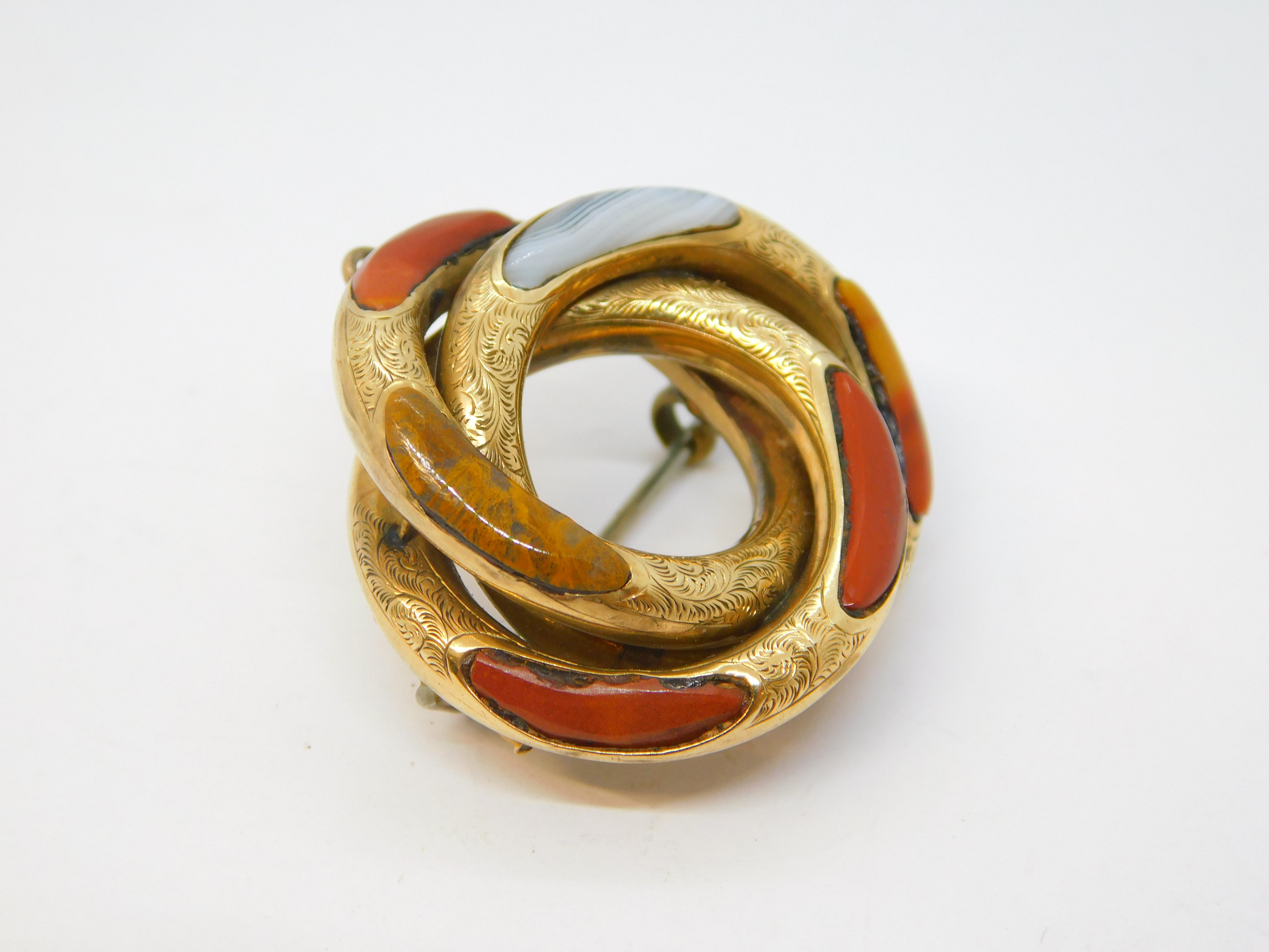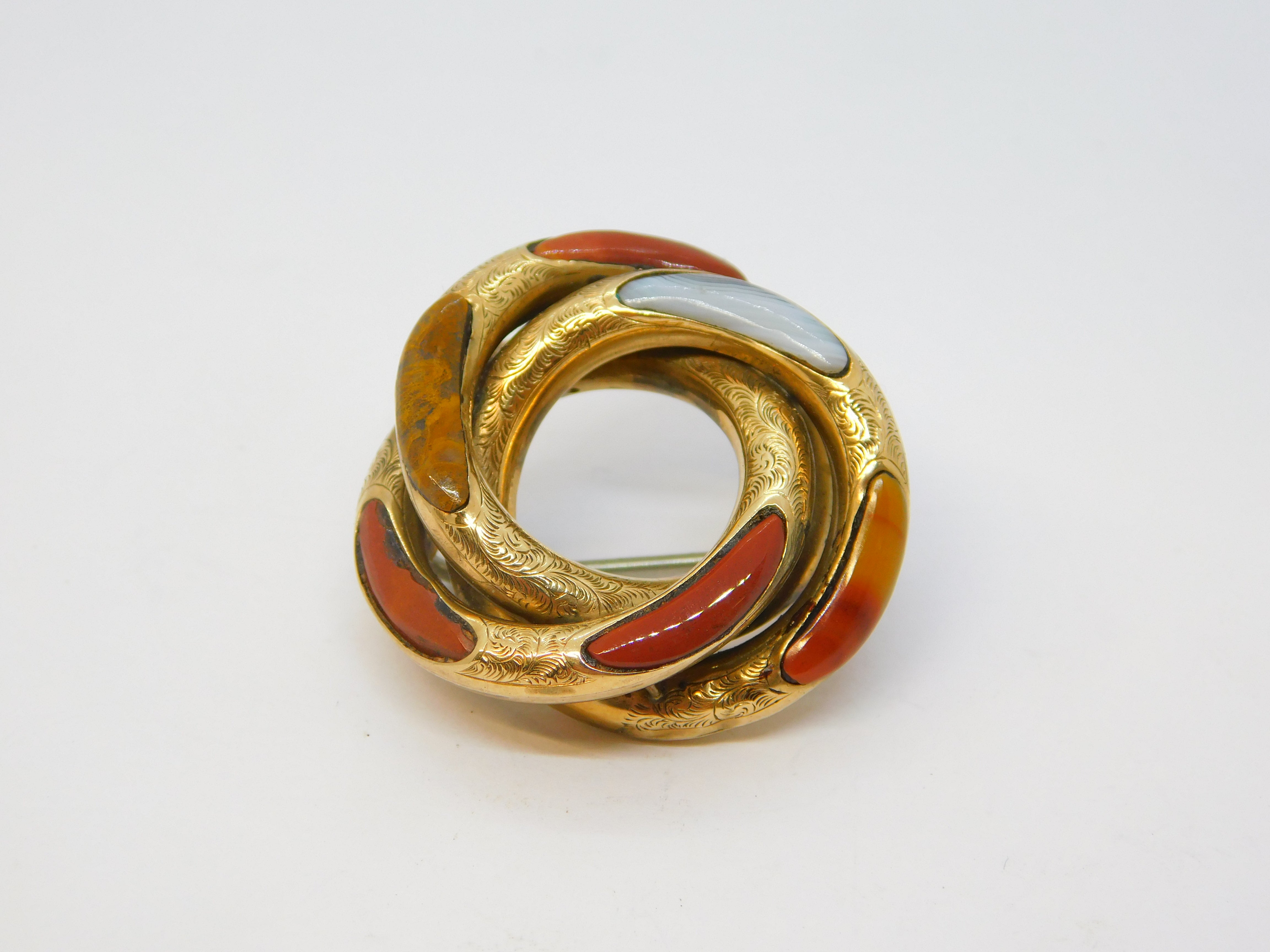 Details: A fantastic and wonderfully designed antique mid-Victorian Scottish 9ct yellow gold knot brooch, possibly a lovers knot, set with montrose agate, red carnelian agate & brown agate, decorated with charming floral chased detail, the gold has been XRF tested as it is unmarked c1860. The brooch also features a bale ring so could be worn as a pendant. This is a wonderful item that would make a perfect gift or addition to any collection.