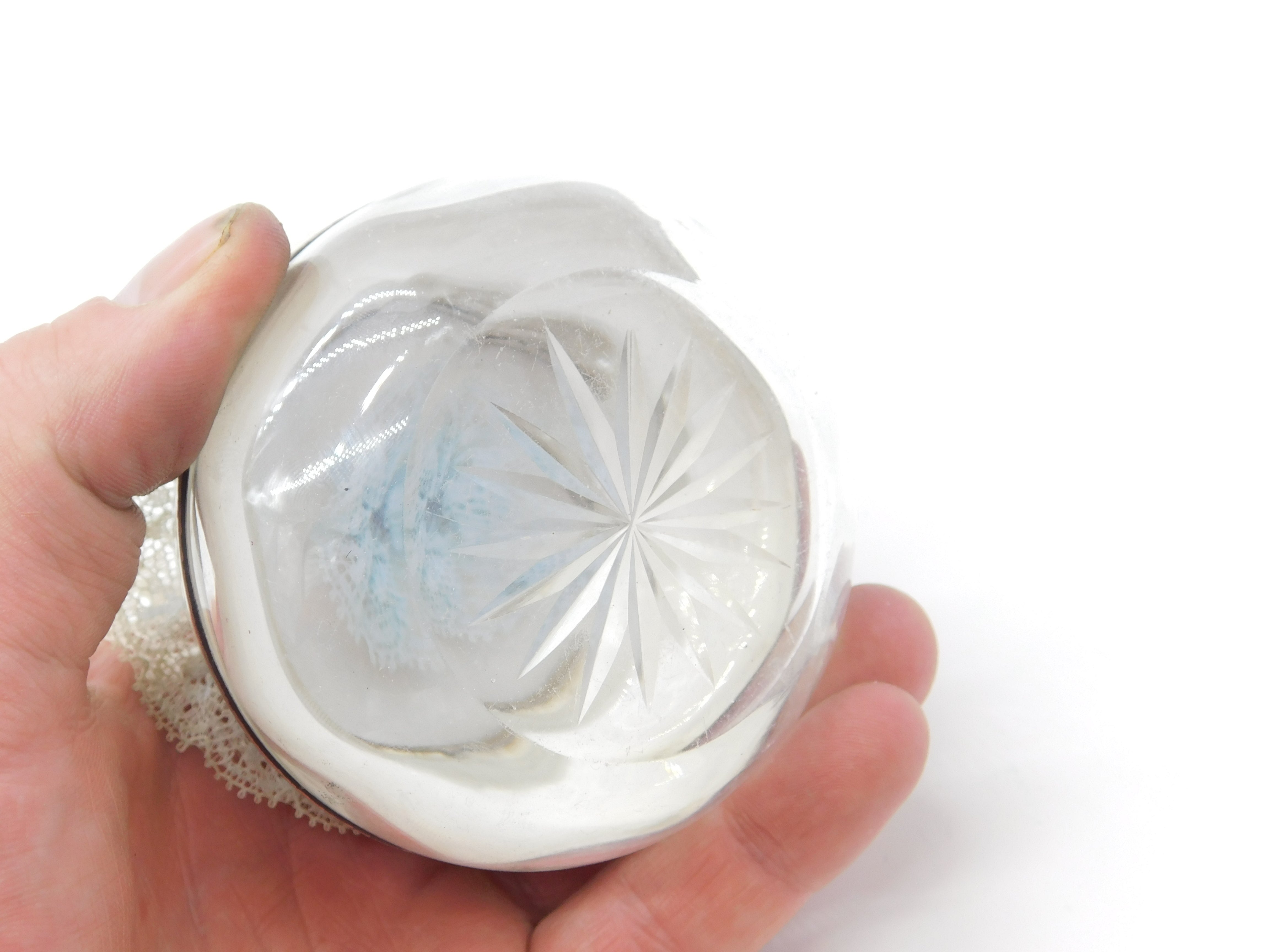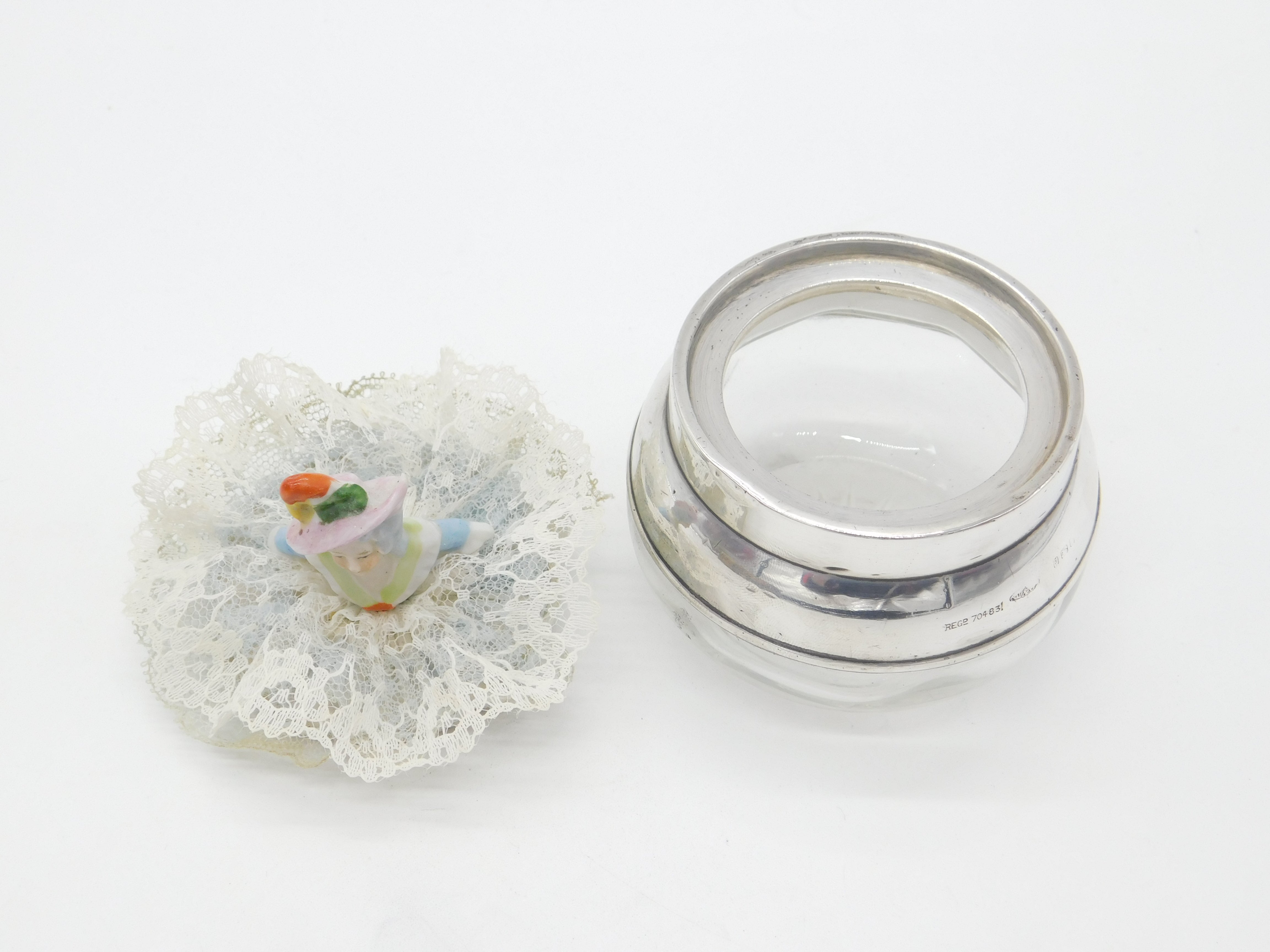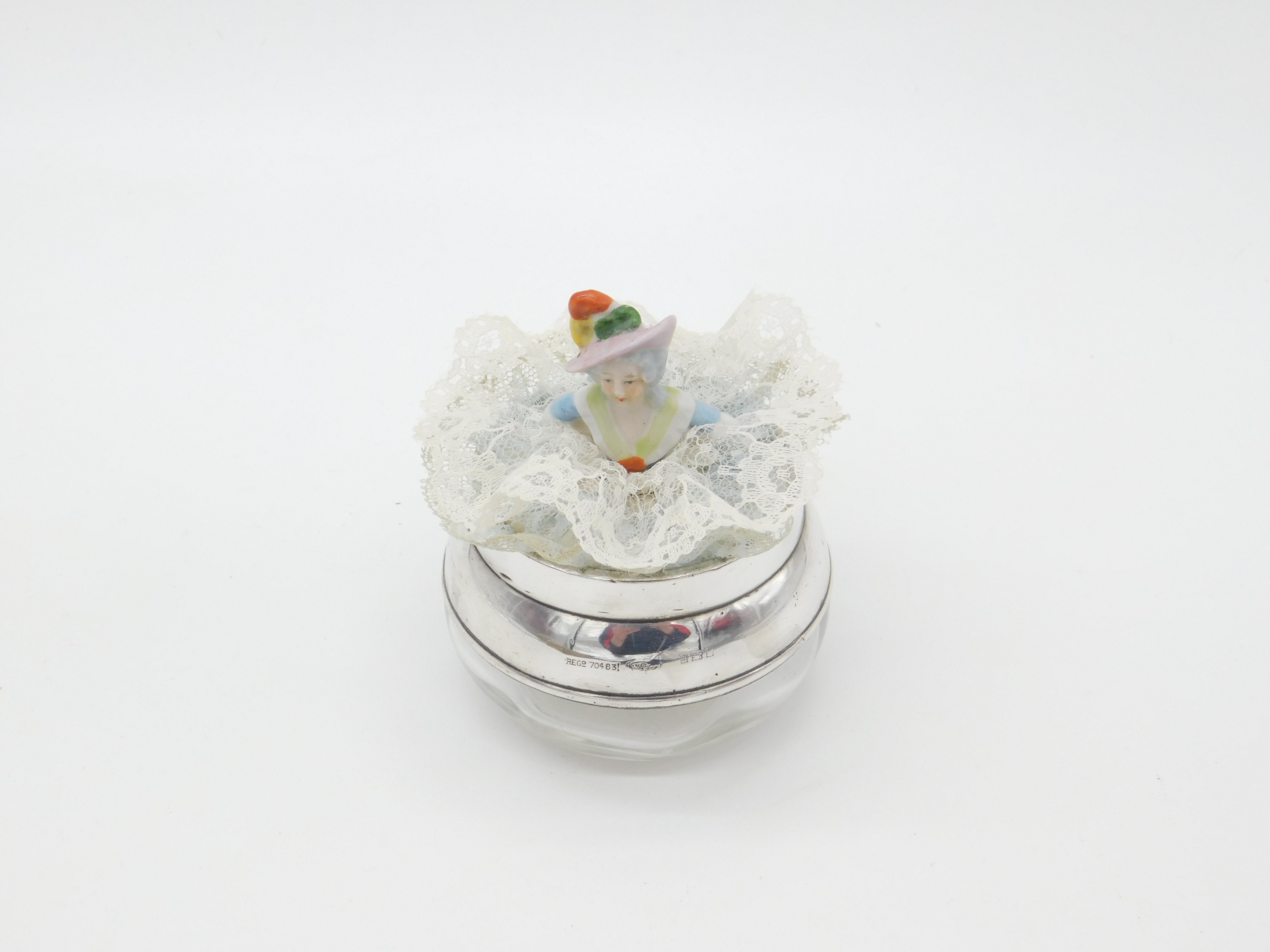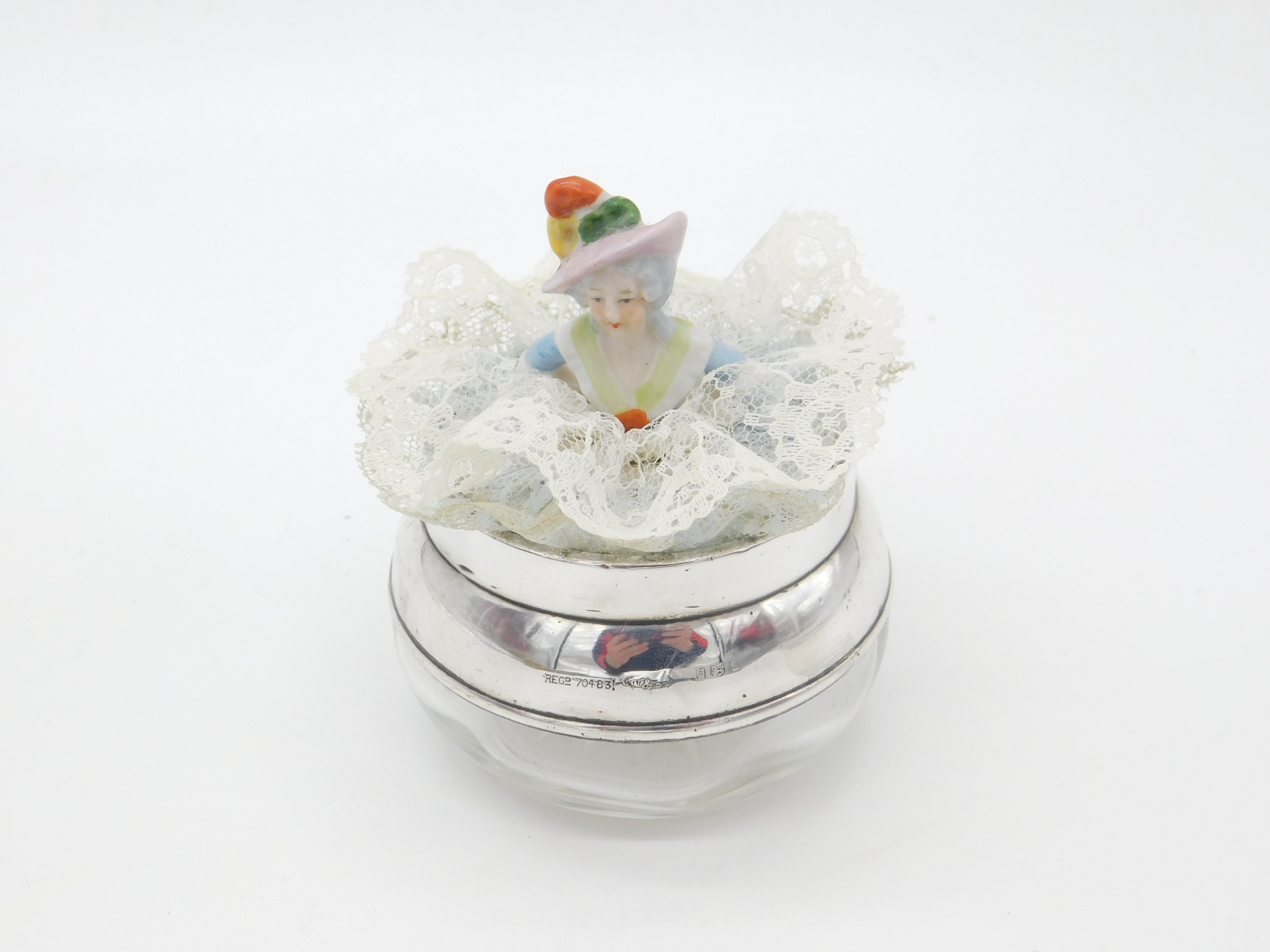 Victorian Sterling Silver & Cut Glass Trinket Pot with Porcelain Dolly Lid 1901
