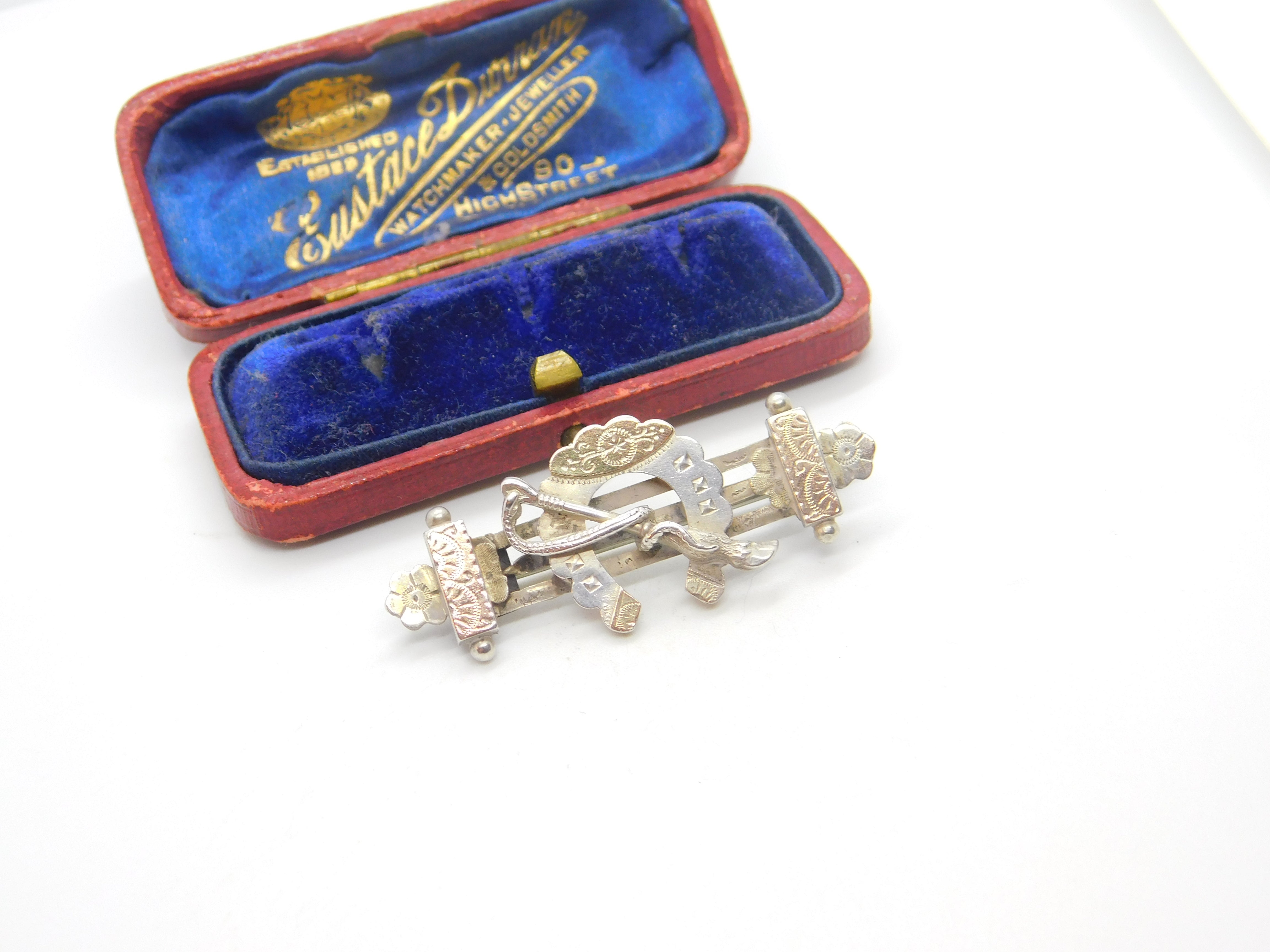 Details: A fantastic and wonderfully designed antique Victorian sterling silver stock pin or brooch with horseshoe, crop and fence hallmarked Birmingham 1888 to the reverse. This is a wonderful item that would make a perfect gift or addition to any collection. The BOX pictured is for PRESENTATION ONLY and is NOT included in the listings but used to frame the pictures unless specifically stated otherwise.