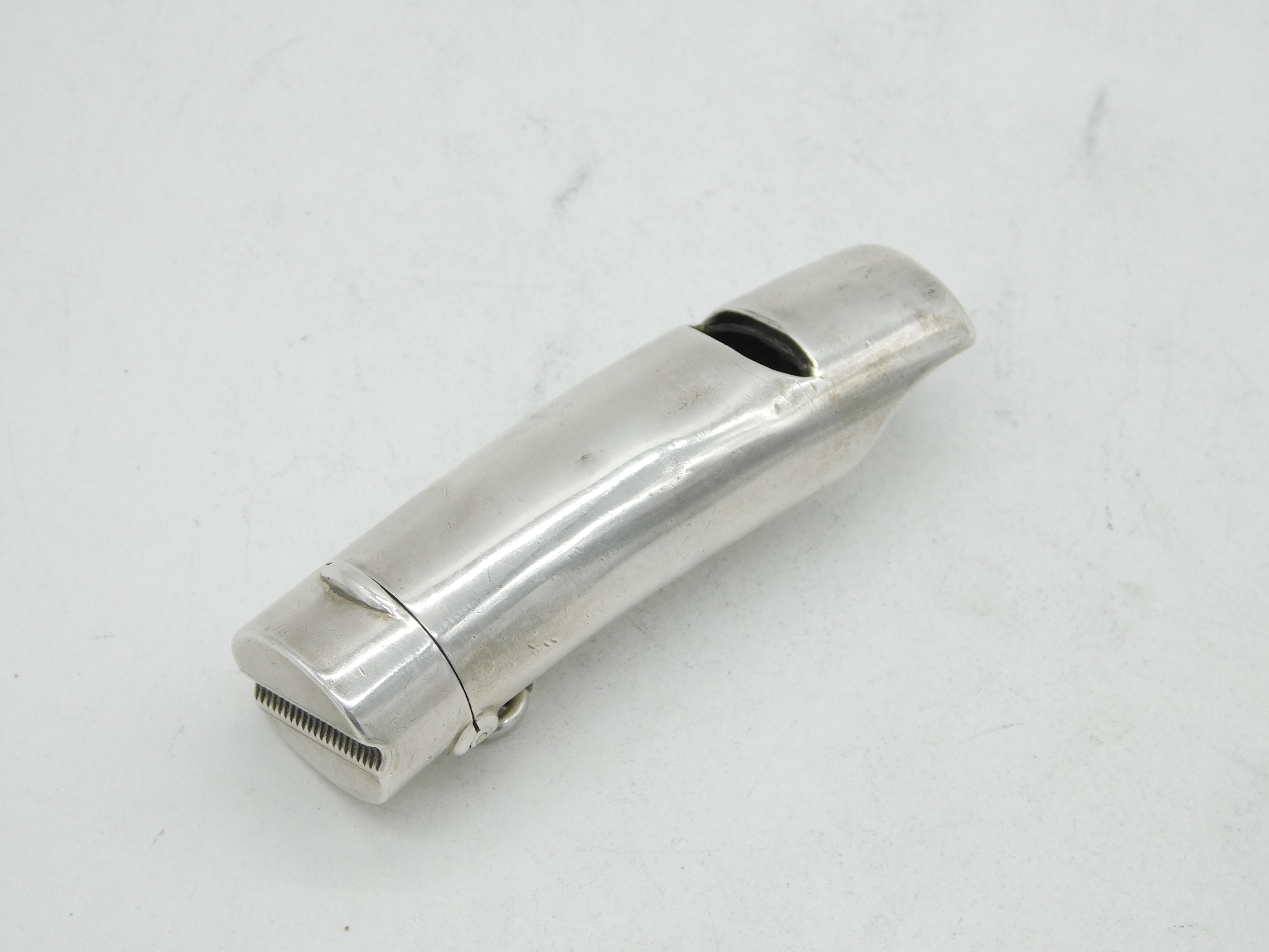 Details: A fantastic and wonderfully designed antique sterling silver novelty whistle form vesta case with mouthpiece to one end and striker to the top of the lid. Hallmarked to the interior gilded, Chester 1898 by Stokes & Ireland Ltd. This is a wonderful item that would make a perfect gift or addition to any collection. We are more than happy to provide XRF reports for items upon request.
