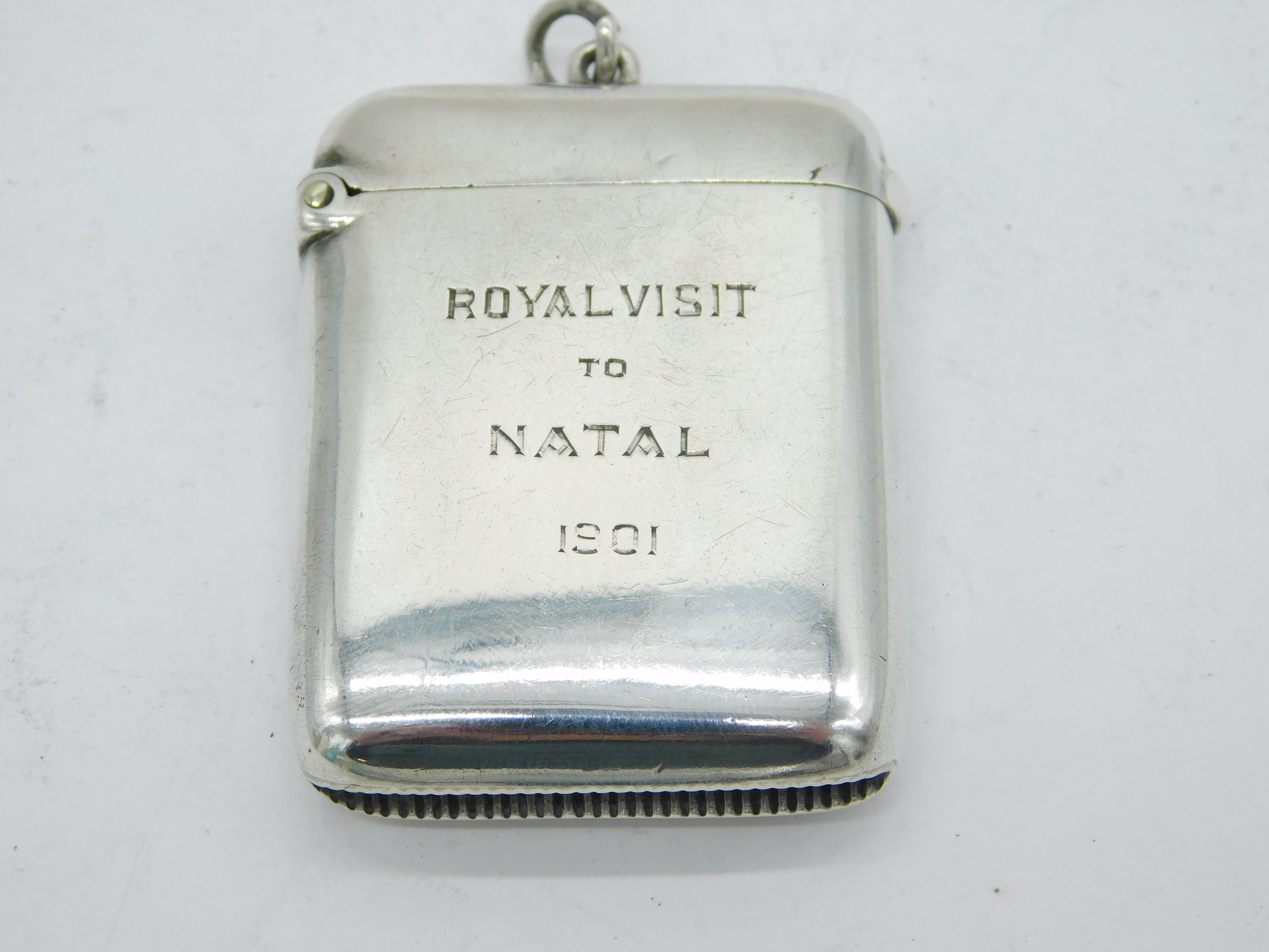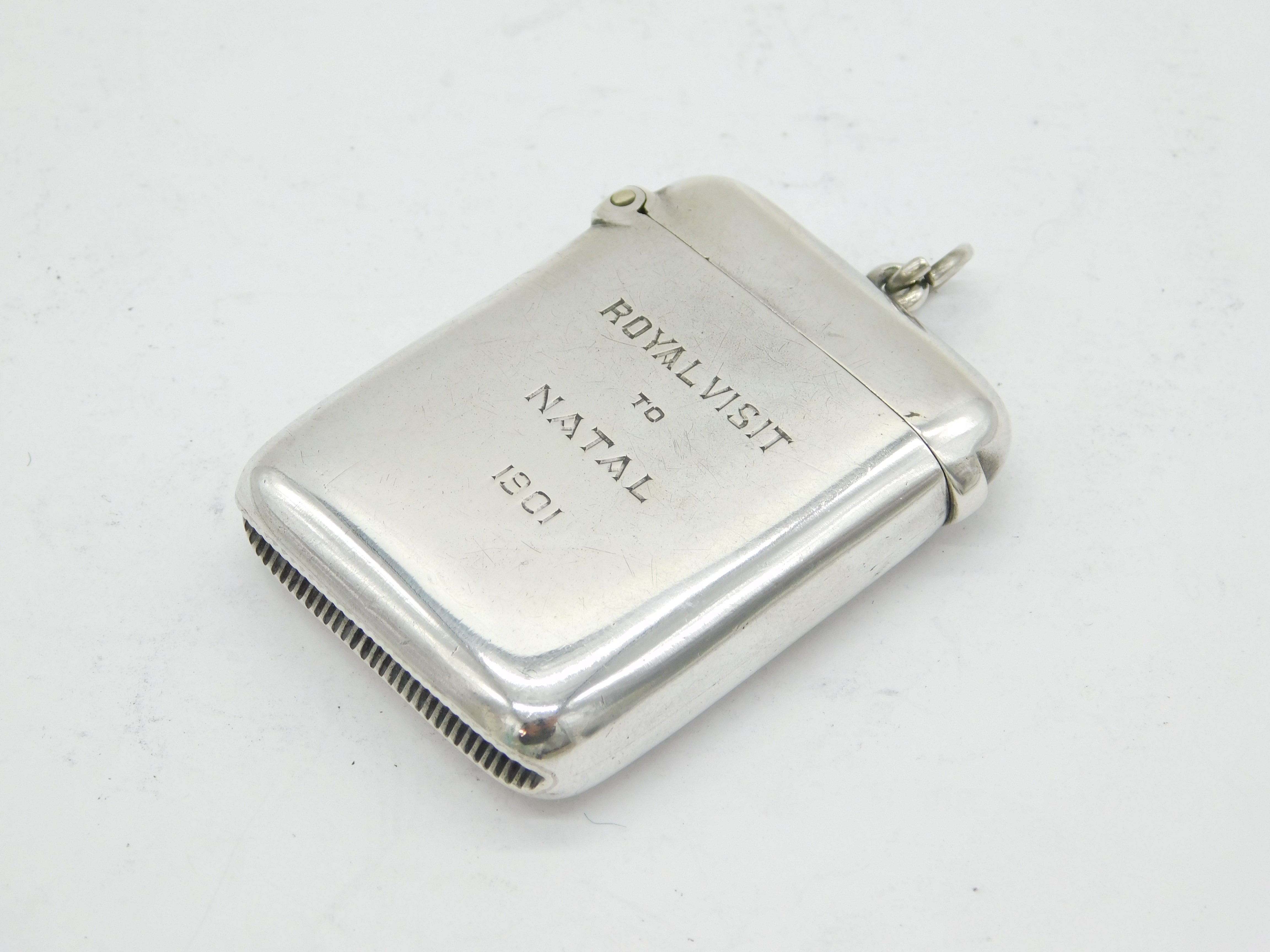Victorian Sterling Silver 'Royal Visit to Natal, 1901' Vesta Case Antique Birmingham