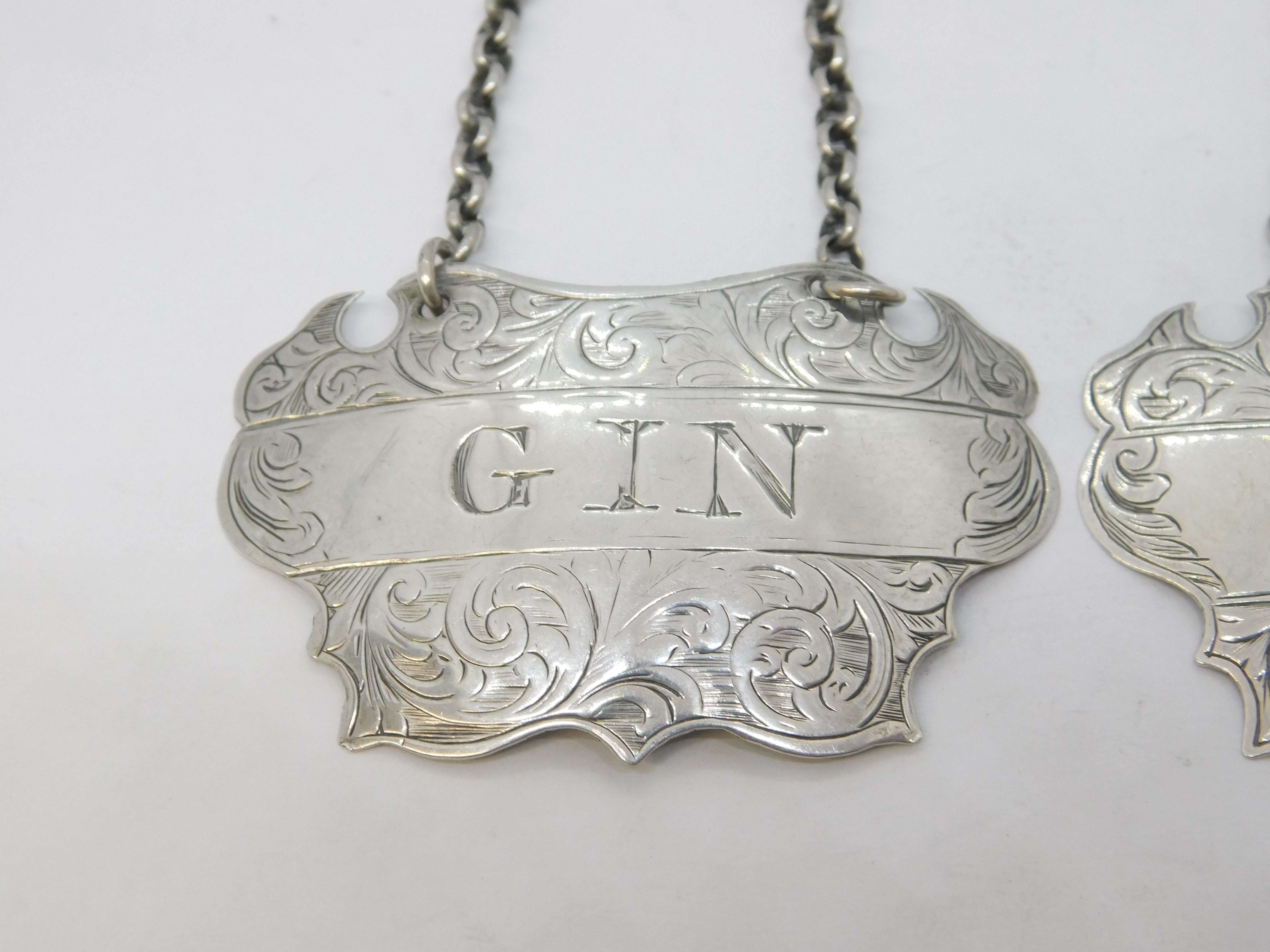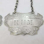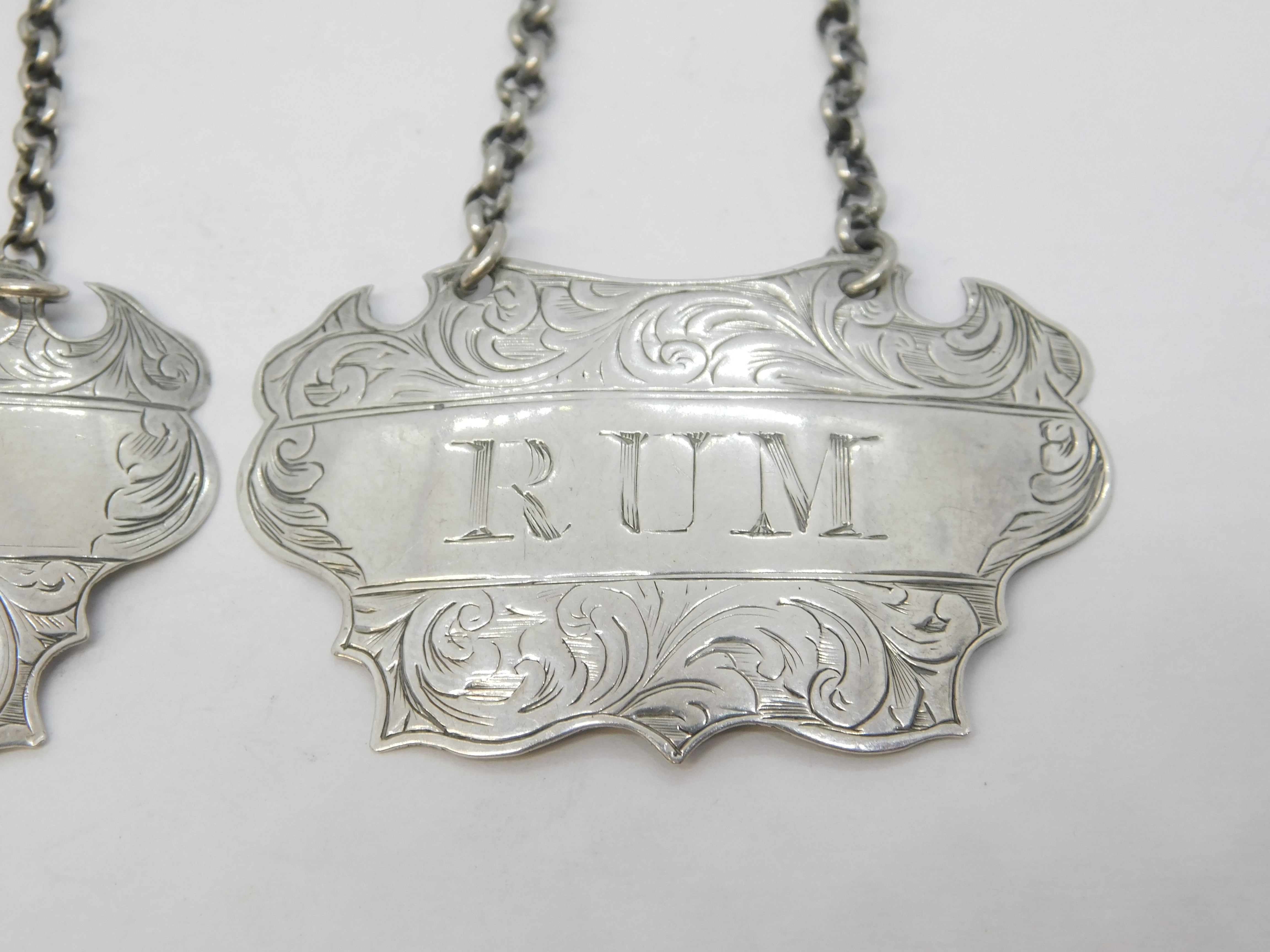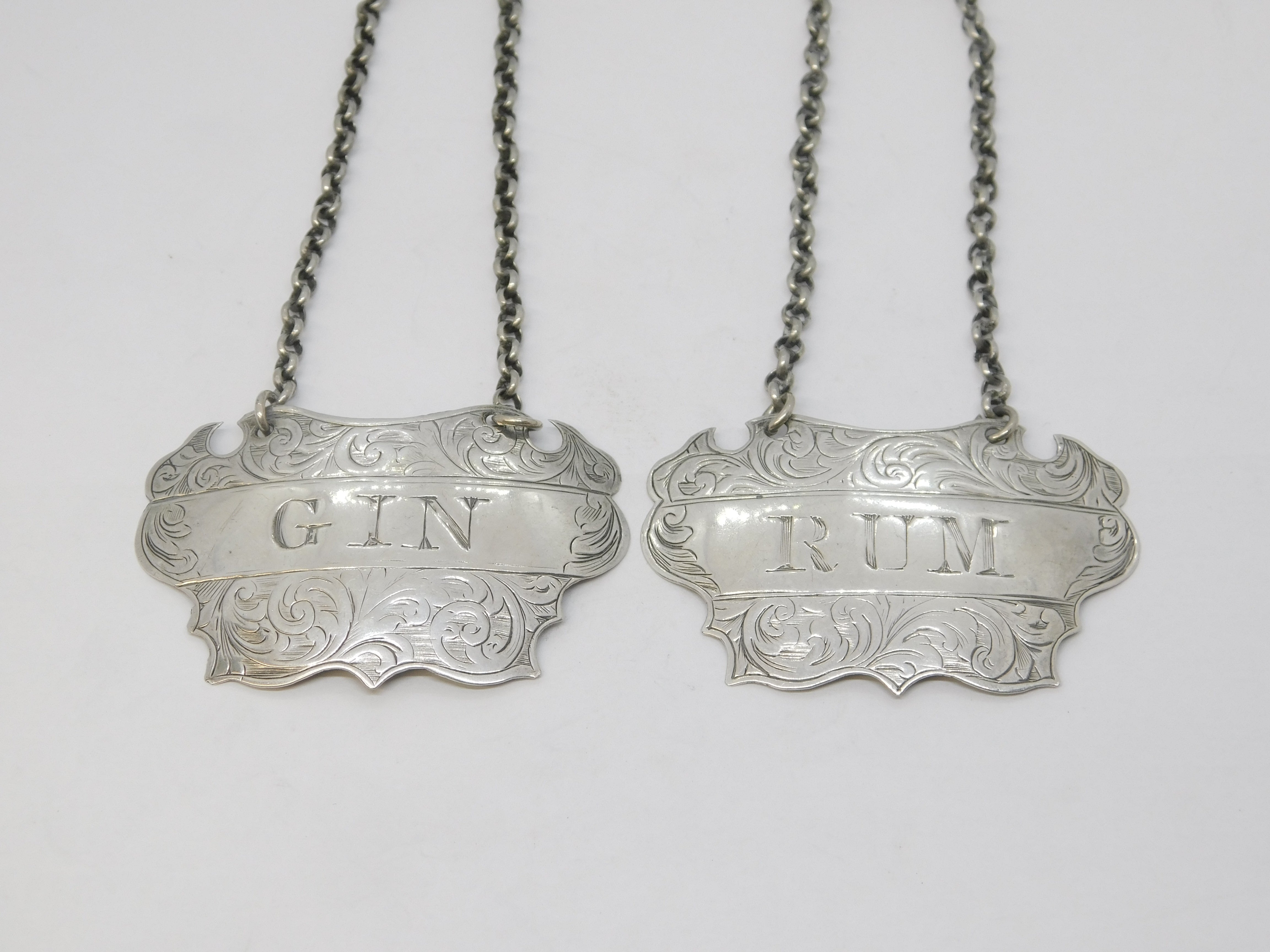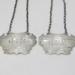Details: A fantastic and wonderfully designed antique mid-Victorian pair of sterling silver Rum & Gin decanter labels with charming floral patterns throughout hallmarked Birmingham 1857 to the reverse by John Tongue. This is a wonderful item that would make a perfect gift or addition to any collection.