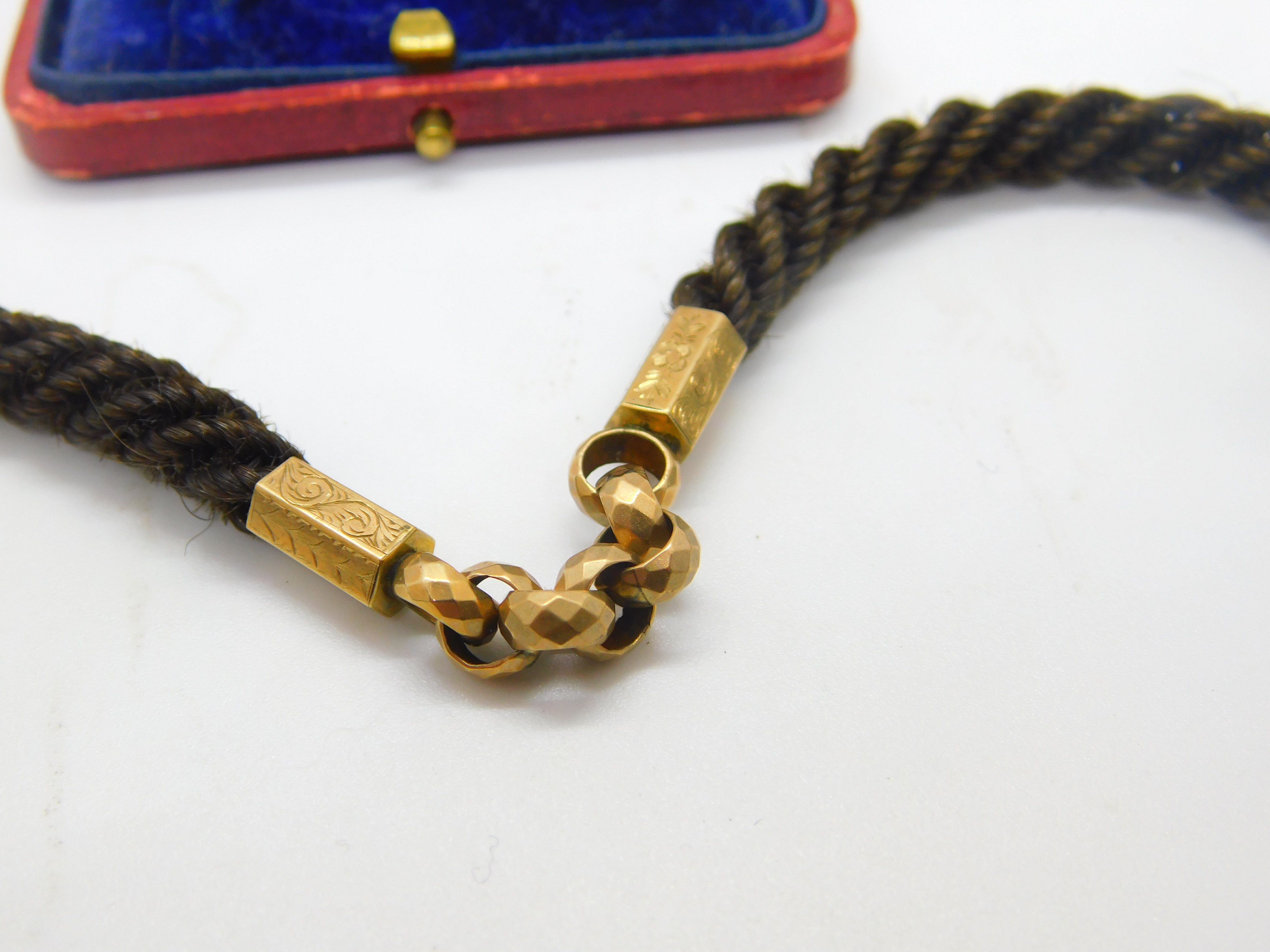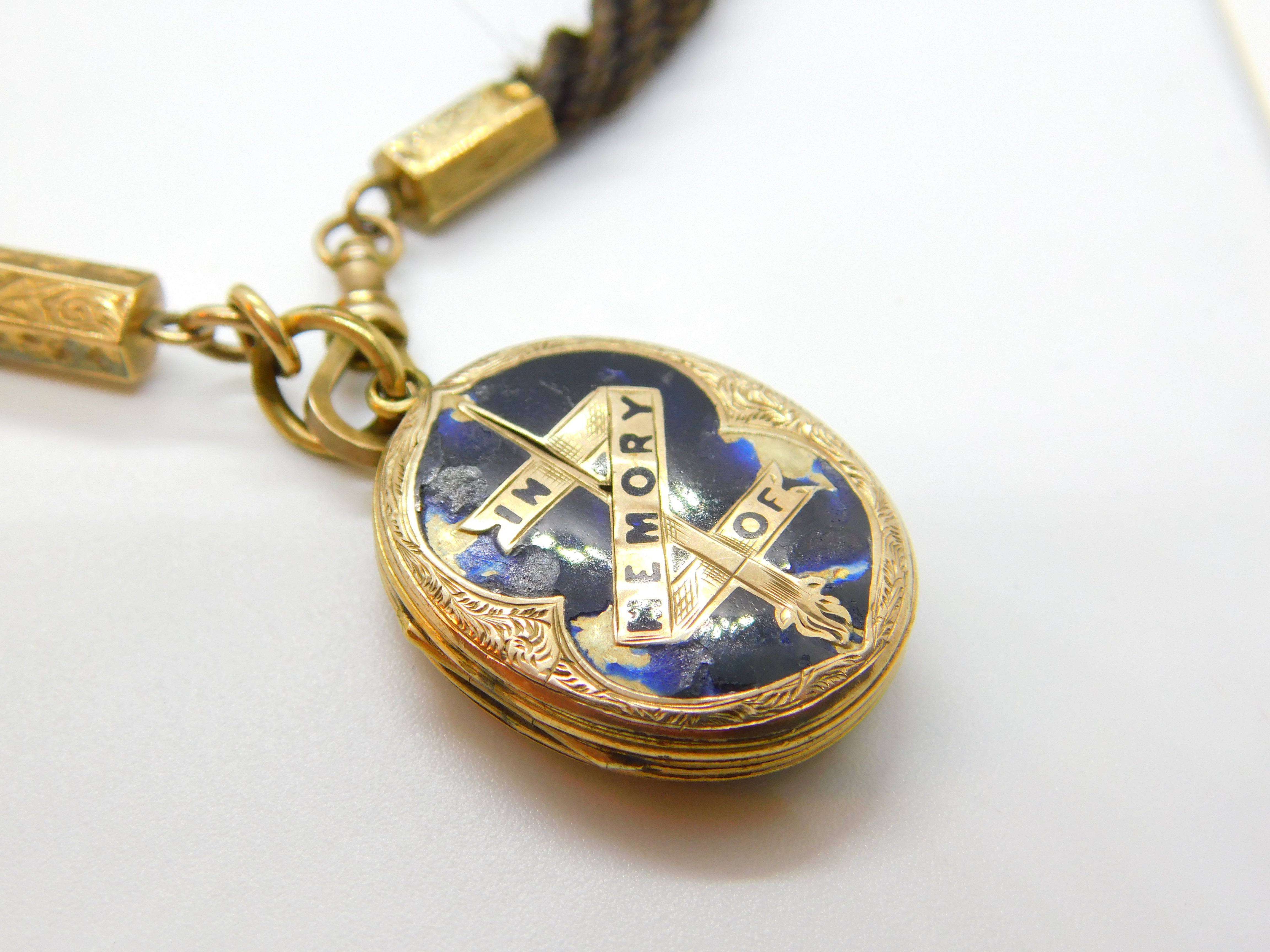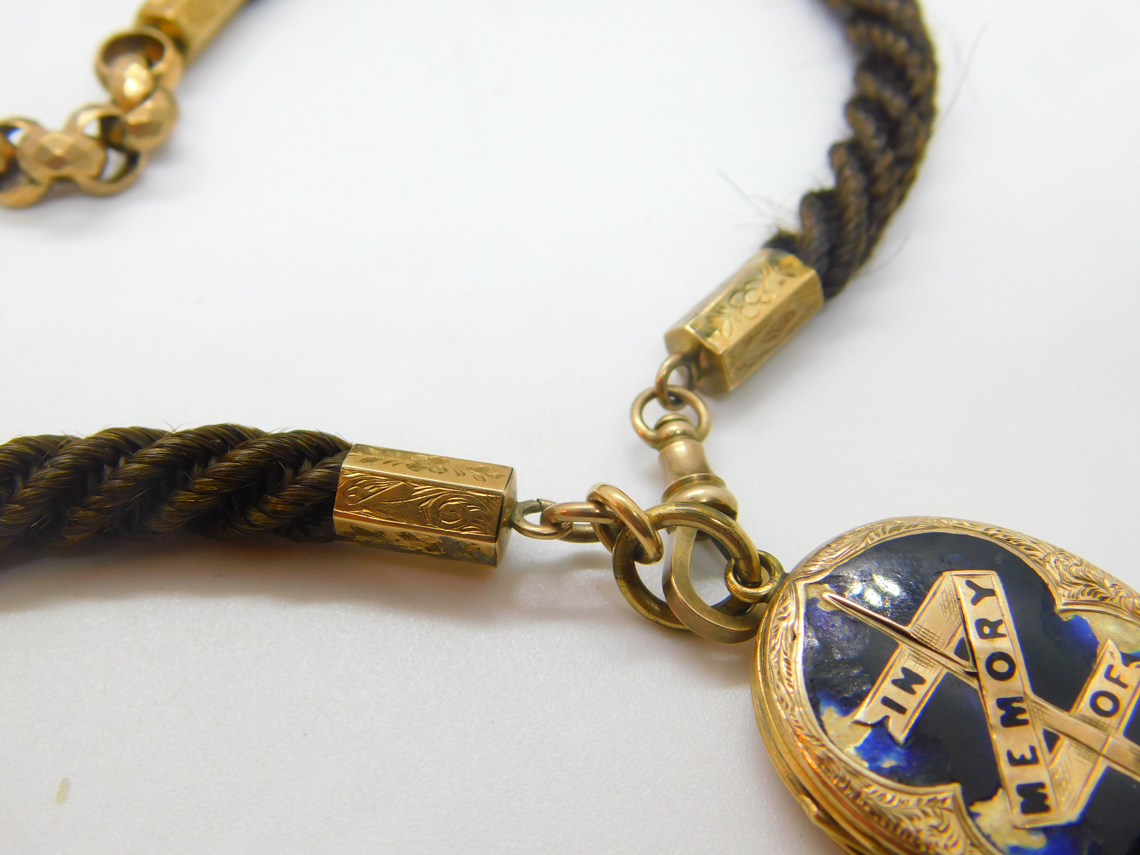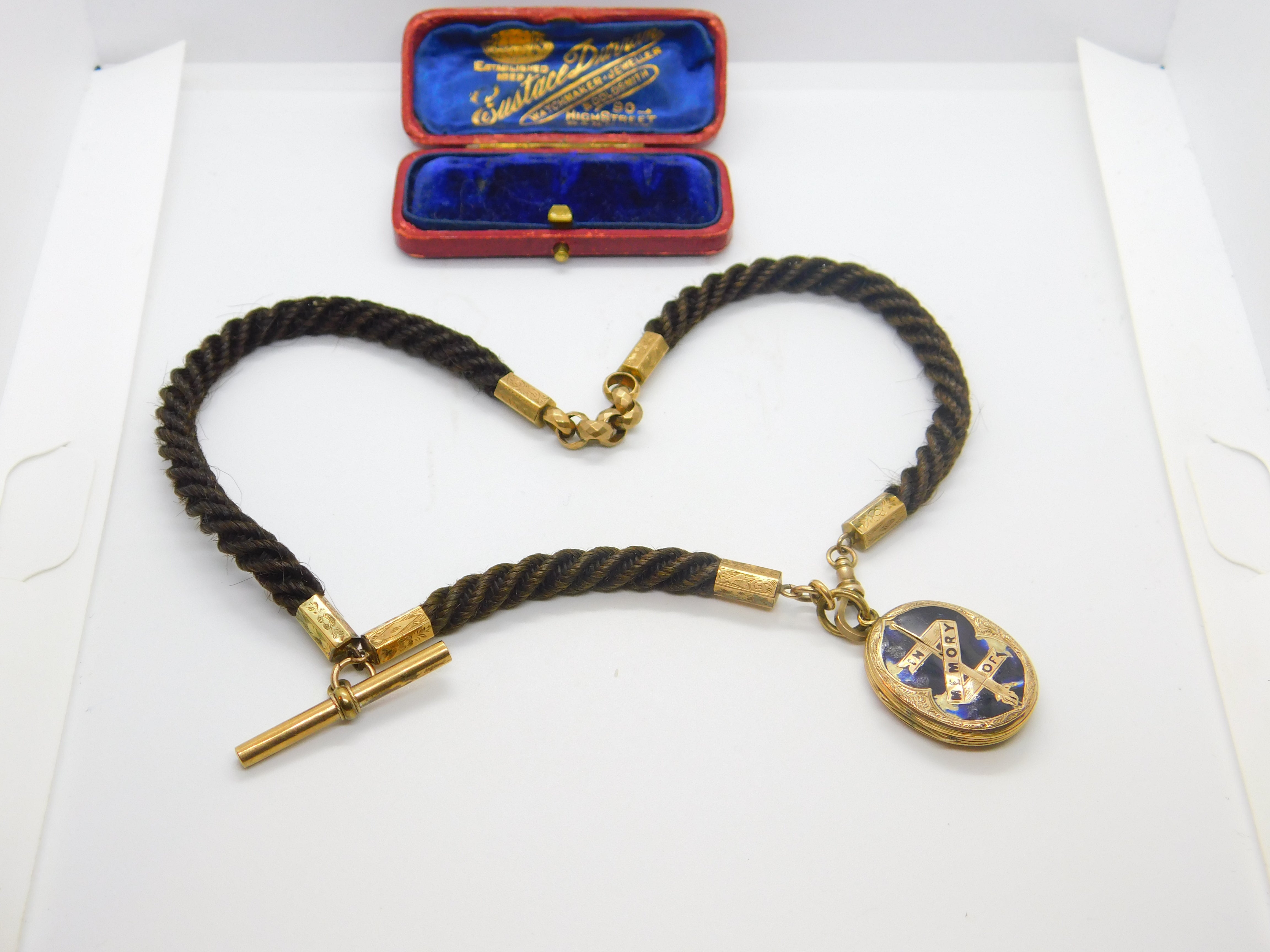 Details: A fantastic and wonderfully designed antique Victorian woven hair pinchbeck set mourning necklace or watch chain adorned with a 9ct yellow gold back and front enamel 'In Memory Of' locket c1860. Enamel is damaged please note. This is a wonderful item that would make a perfect gift or addition to any collection. The BOX pictured is for PRESENTATION ONLY and is NOT included in the listings but used to frame the pictures unless specifically stated otherwise.