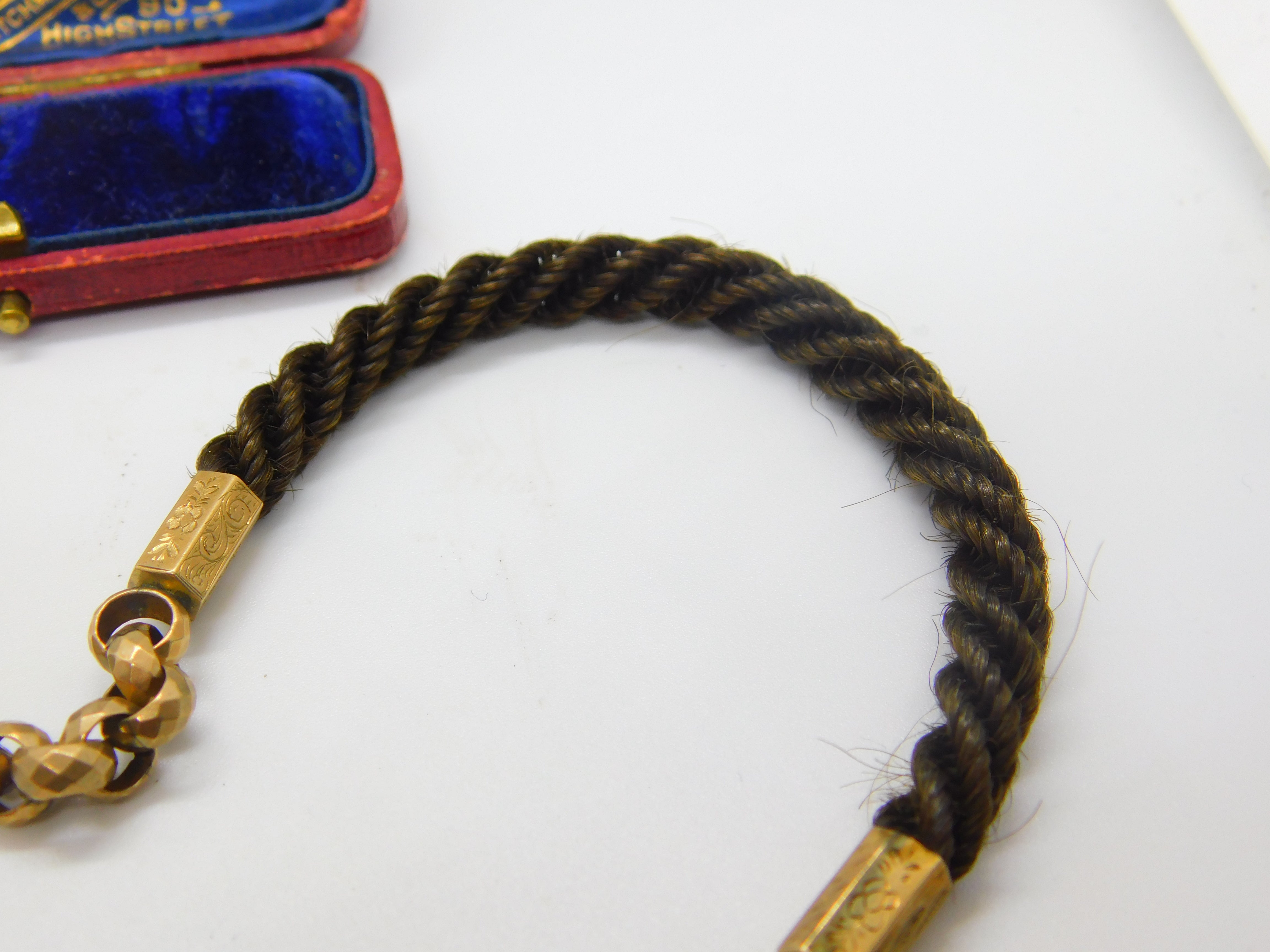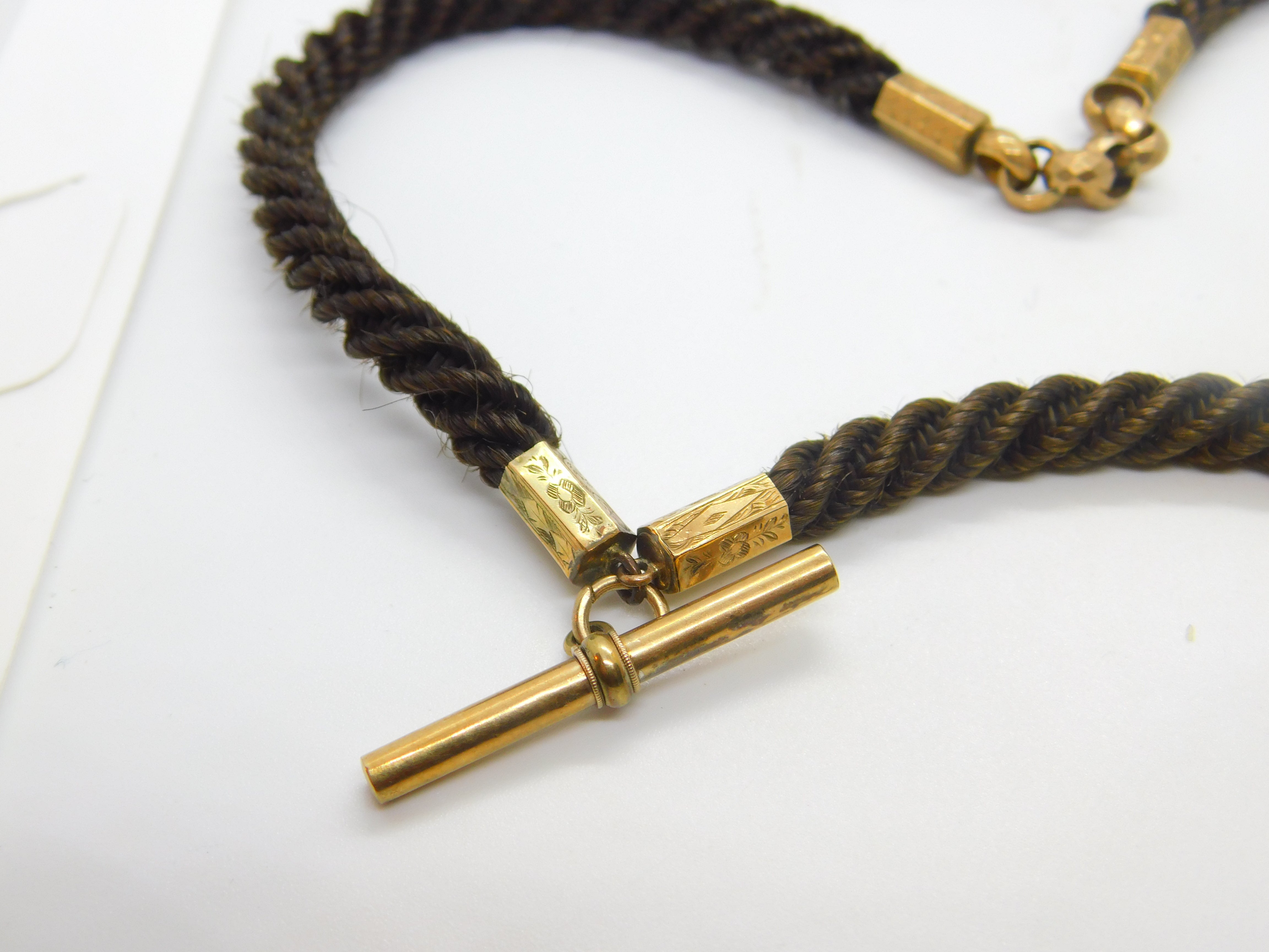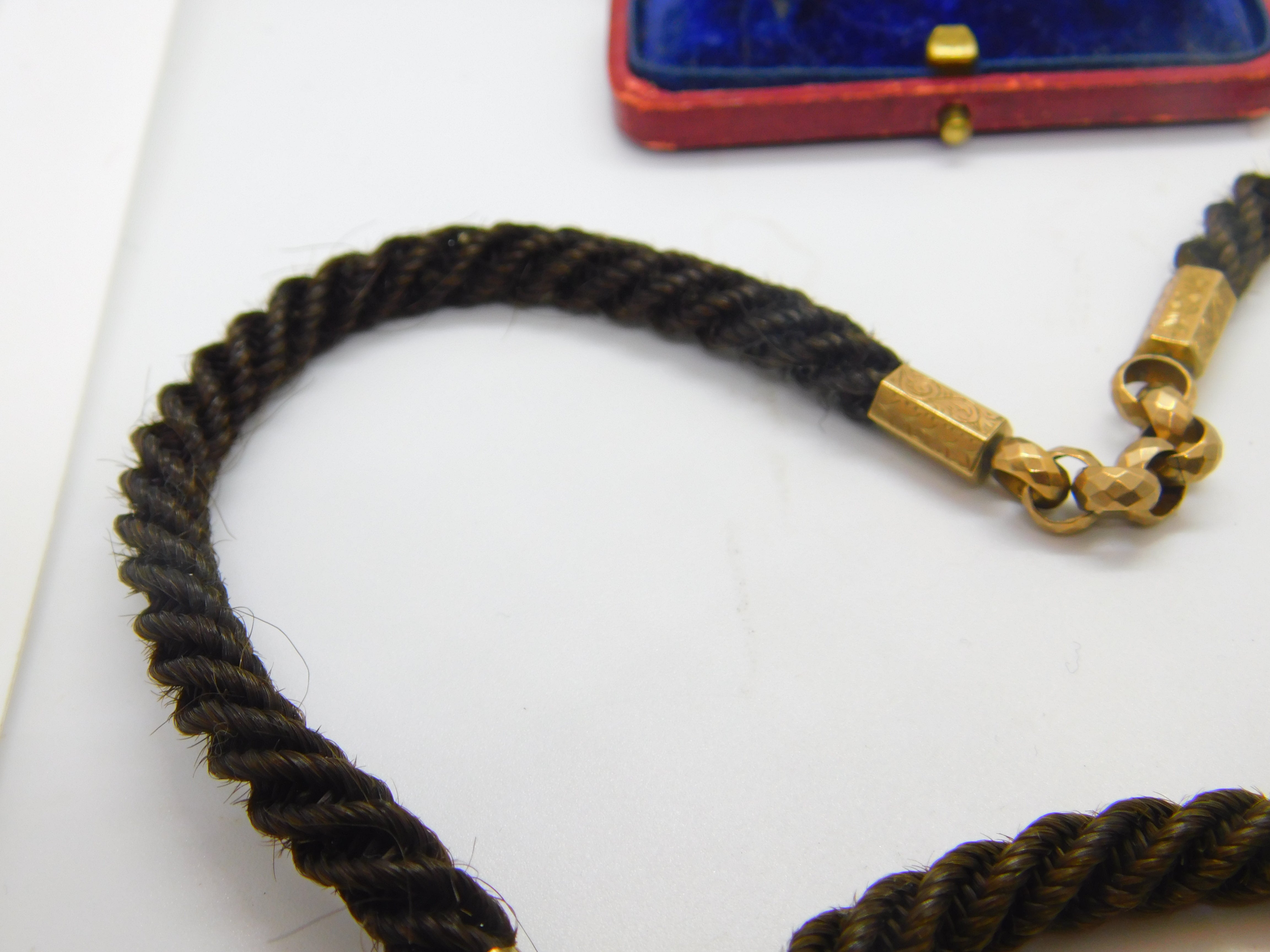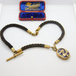 Details: A fantastic and wonderfully designed antique Victorian woven hair pinchbeck set mourning necklace or watch chain adorned with a 9ct yellow gold back and front enamel 'In Memory Of' locket c1860. Enamel is damaged please note. This is a wonderful item that would make a perfect gift or addition to any collection. The BOX pictured is for PRESENTATION ONLY and is NOT included in the listings but used to frame the pictures unless specifically stated otherwise.