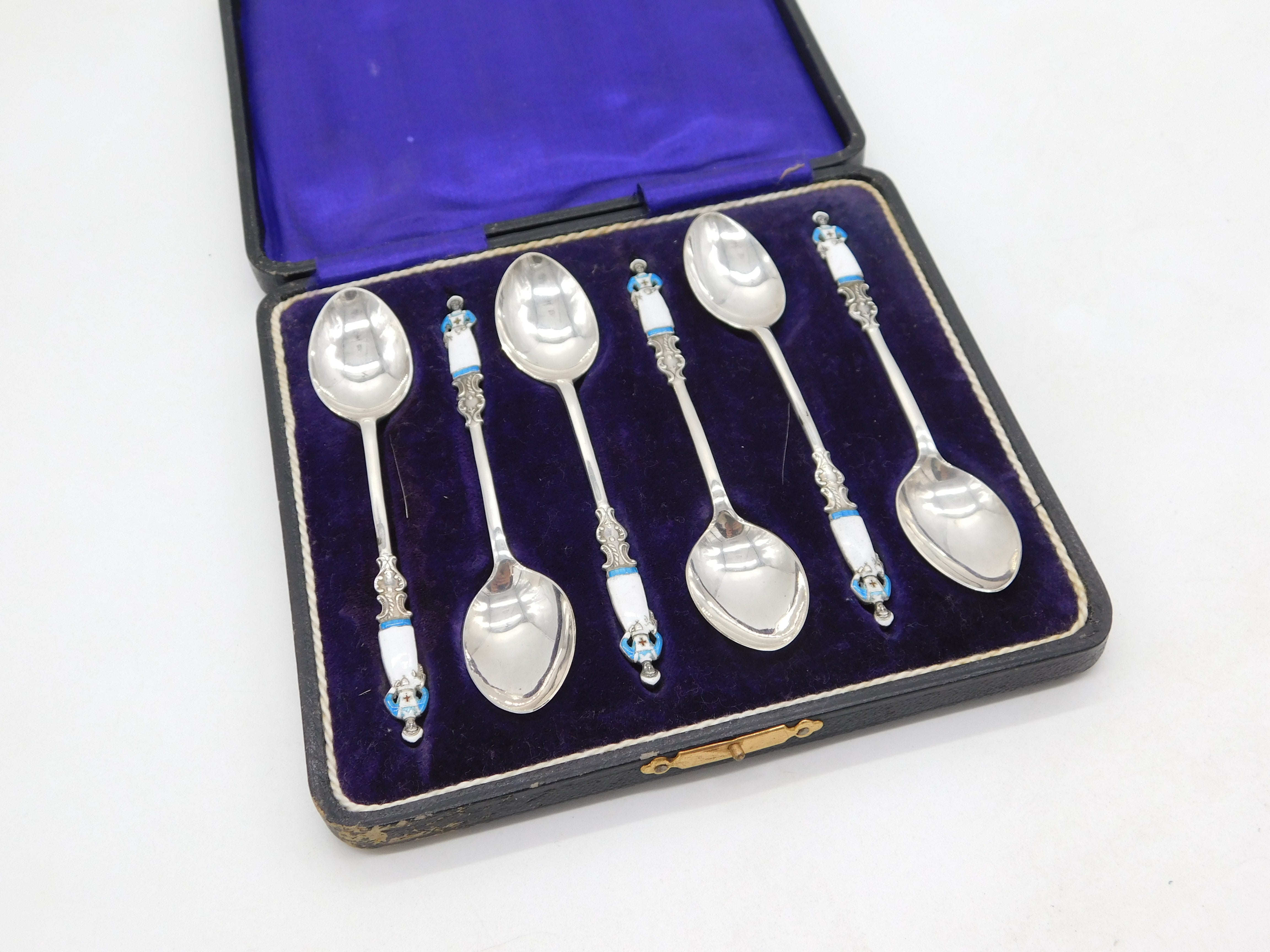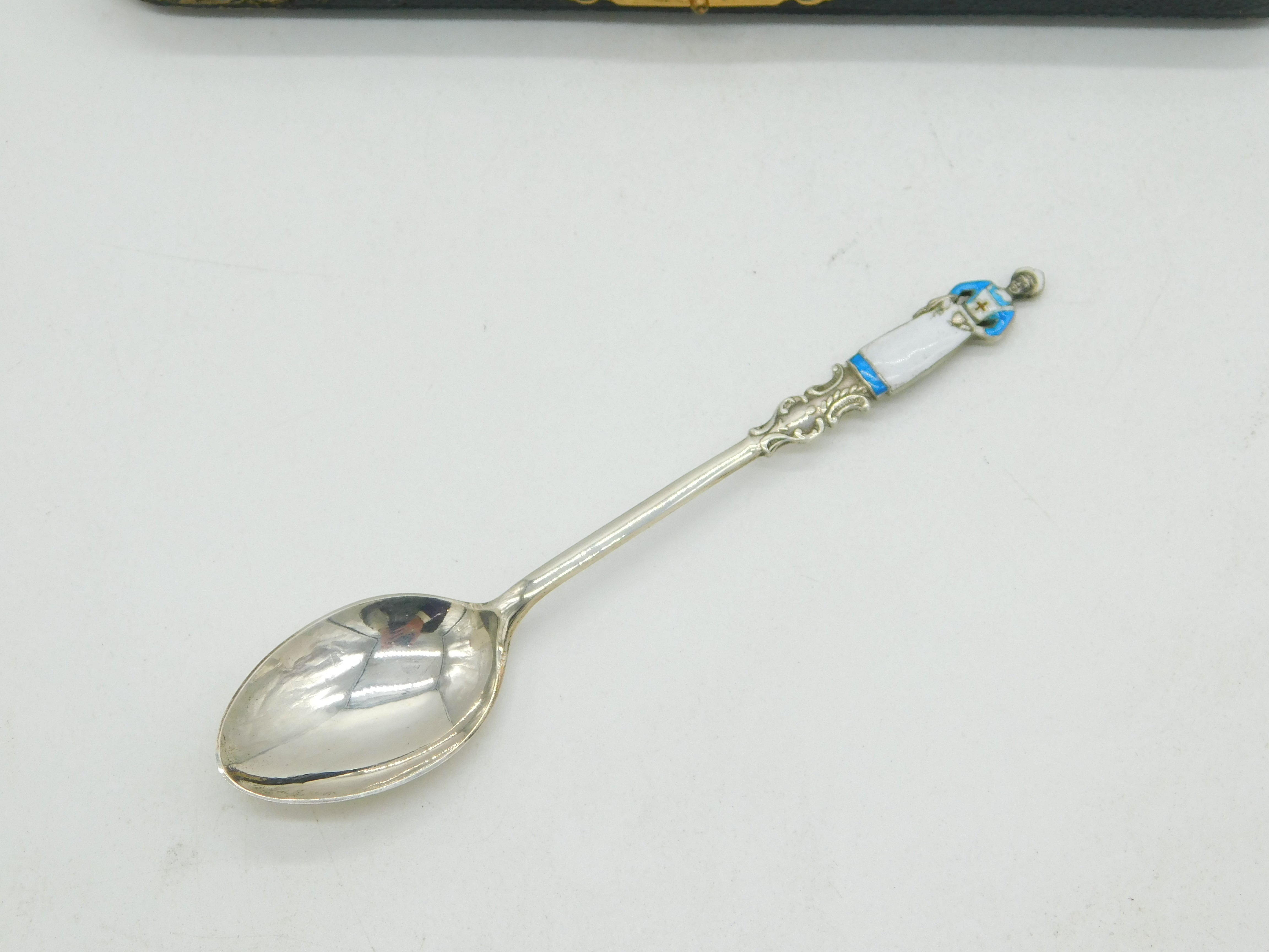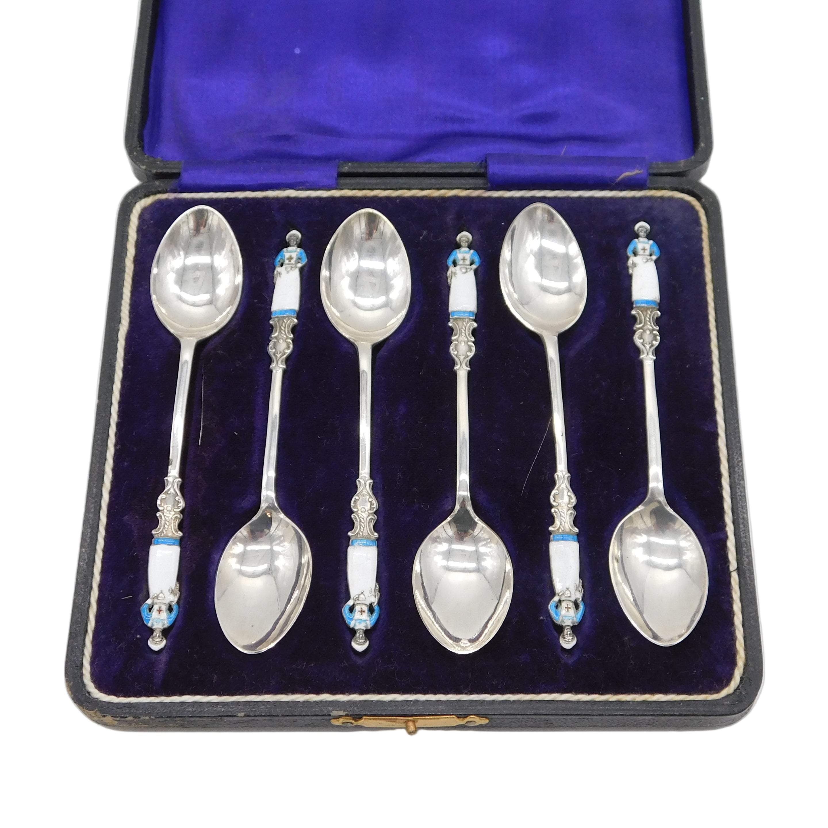 Details: A fantastic and wonderfully designed antique WW1-interest boxed set of sterling silver teaspoons with charming enamel terminals depicting medical nurses finished with excellent detailing hallmarked Birmingham 1914, likely produced in relation to WW1. This is a wonderful item that would make a perfect gift or addition to any collection. We are more than happy to provide XRF reports for items upon request.