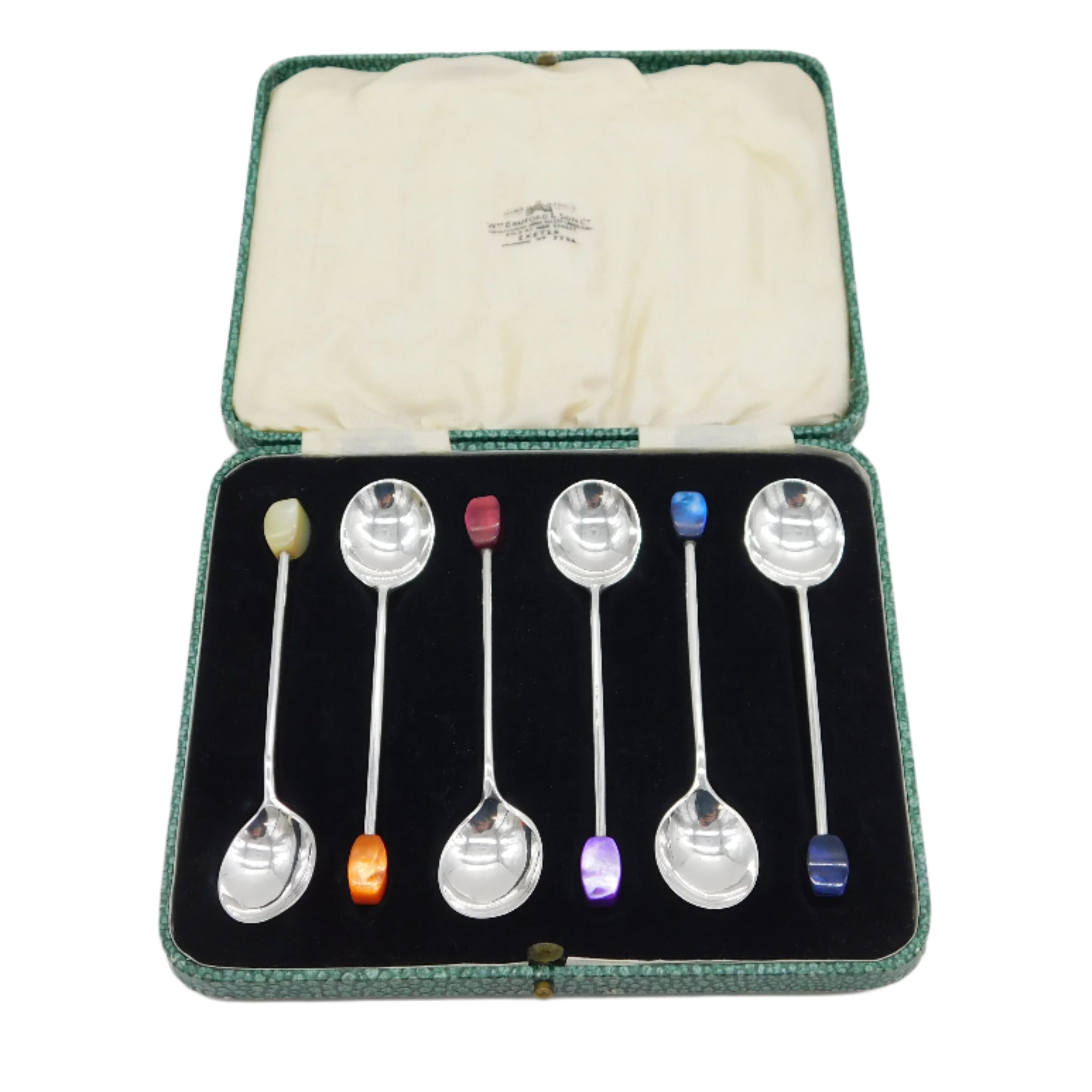 Boxed Sterling Silver Colourful Bakelite Teaspoon Set Antique 1935 Sheffield
