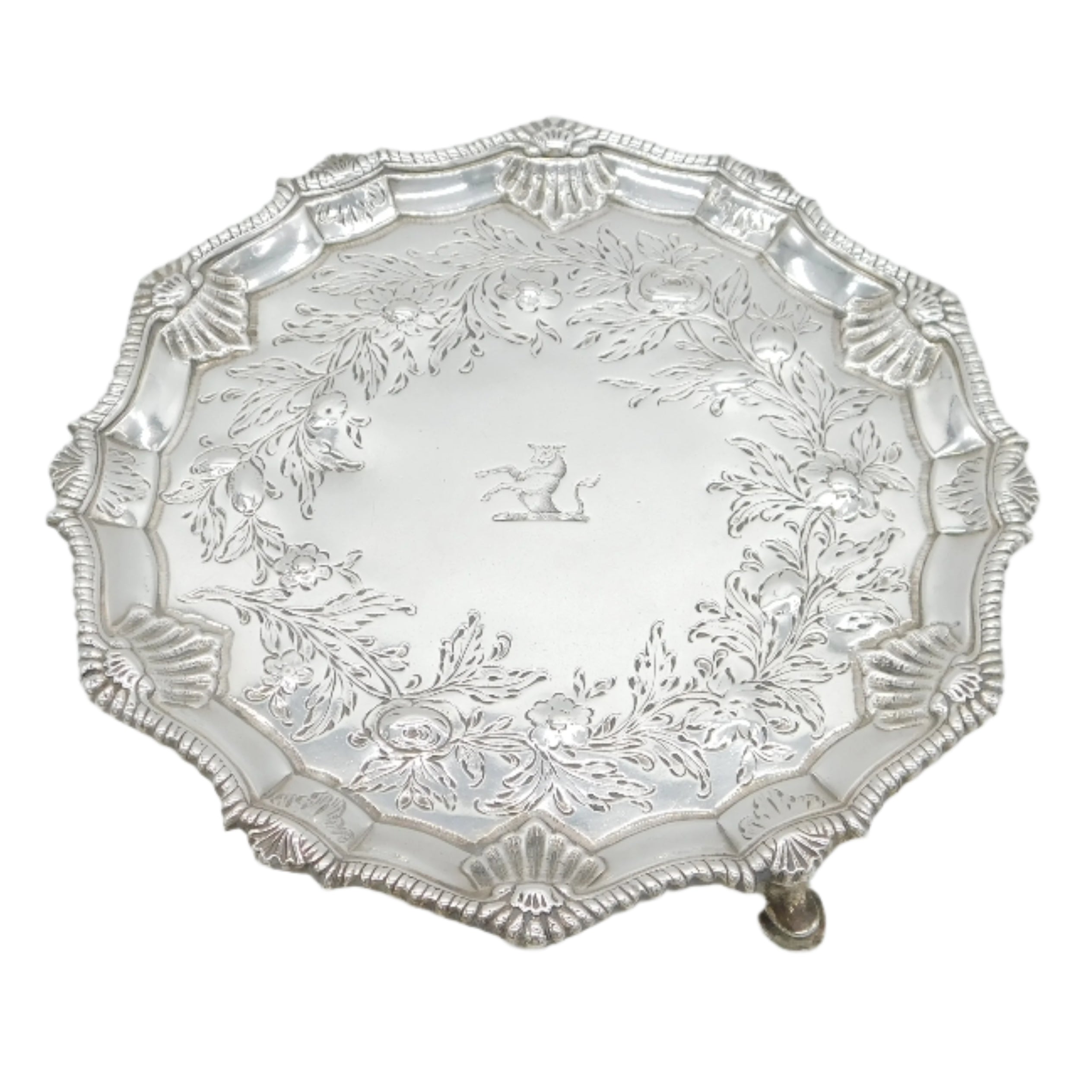 George III Sterling Silver Floral Pattern Cow Crest Salver Antique 1764 London