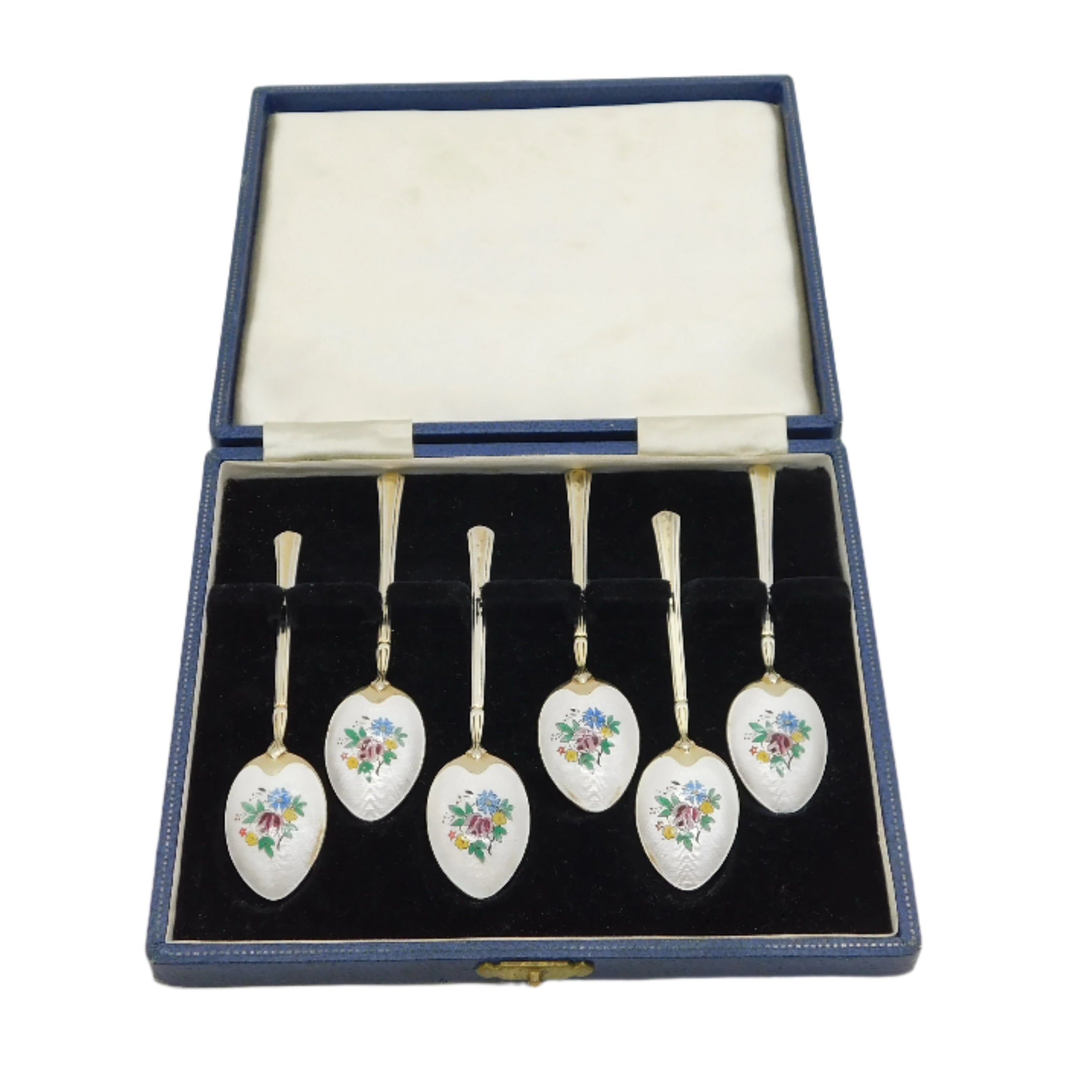 Boxed Sterling Silver Floral Enamel Gilded Teaspoon Set Vintage 1962 Birmingham