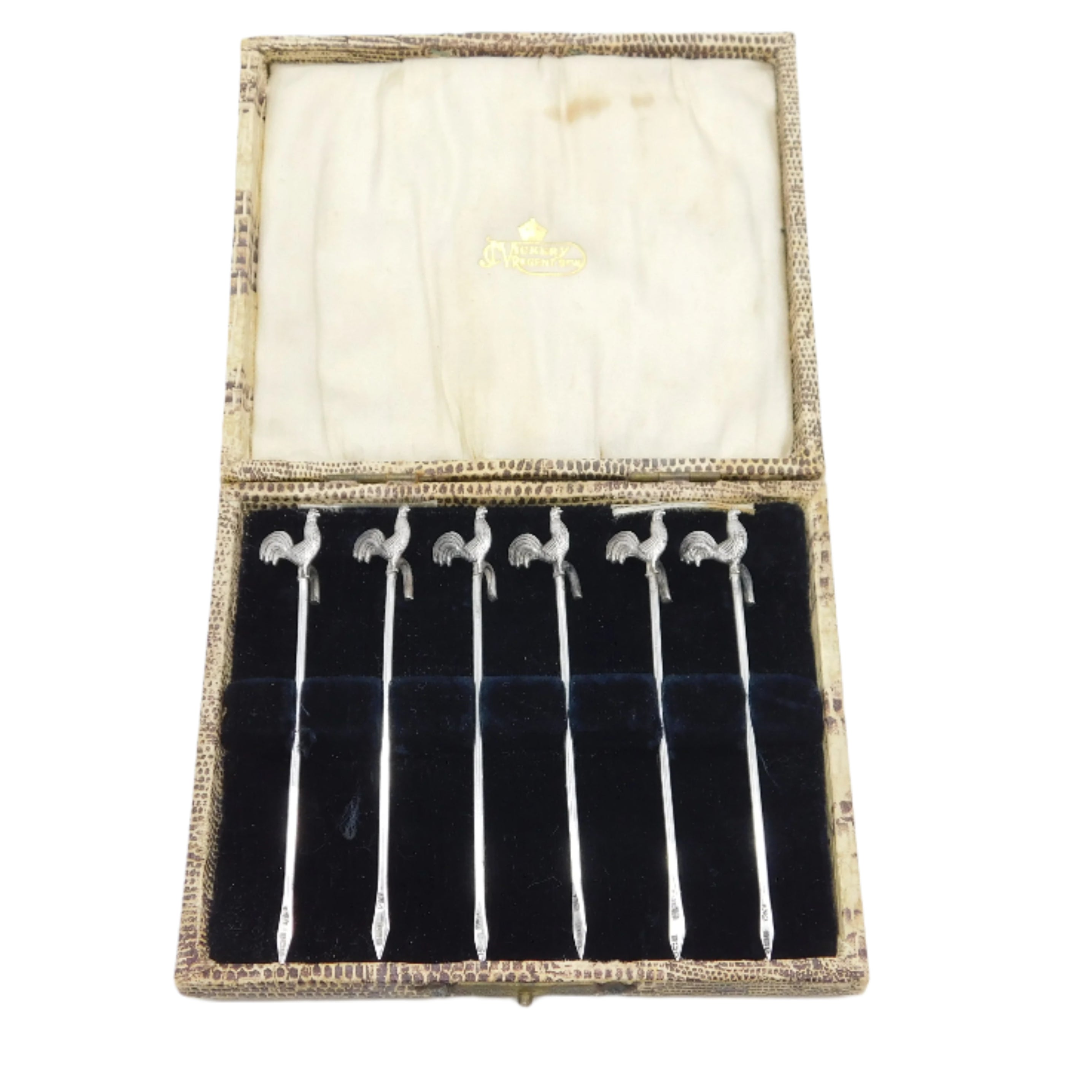 Boxed Set of Sterling Silver Chicken Terminal Cocktail Sticks Antique 1902 Birmingham