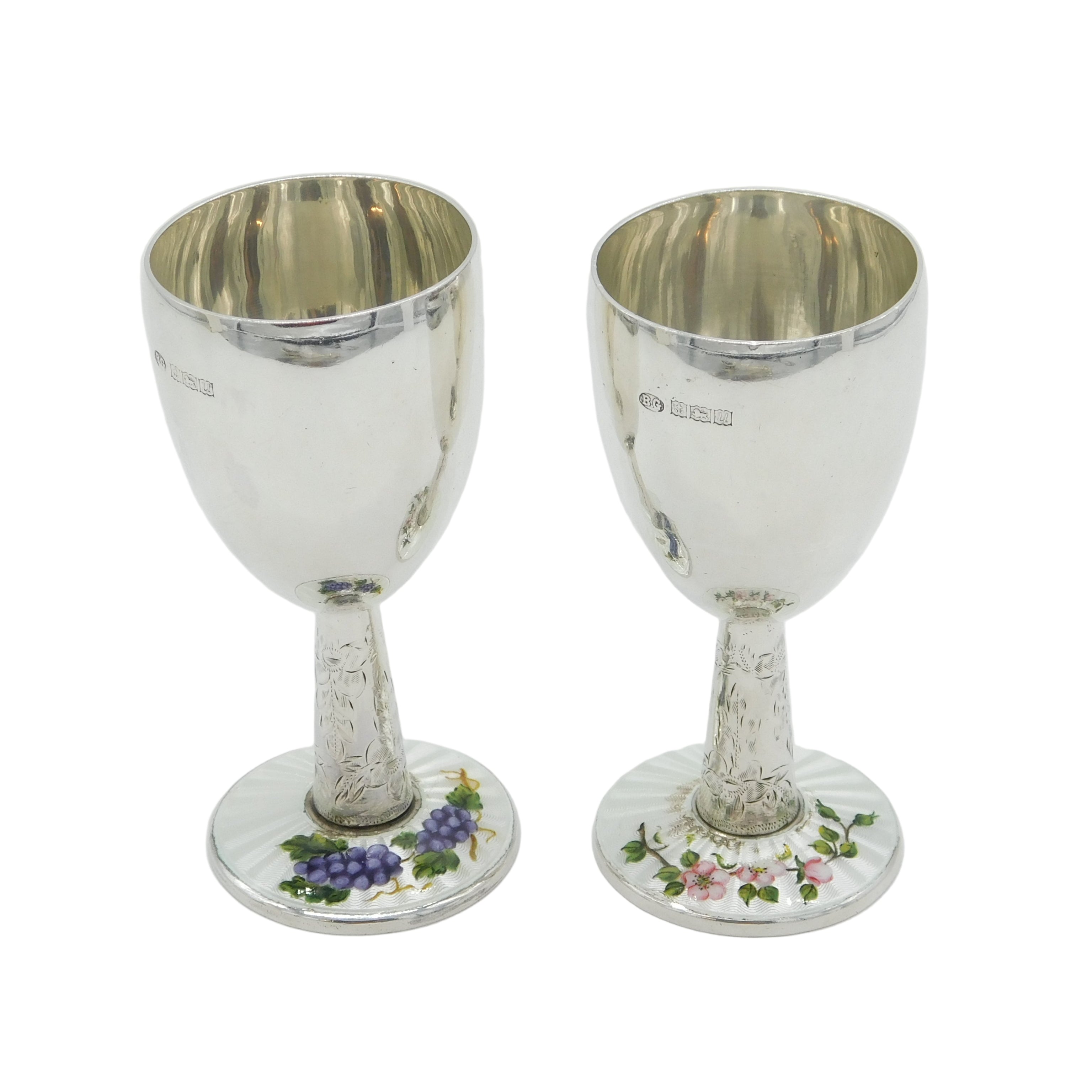 Pair of Sterling Silver Guilloche Enamel Floral Wine Goblets Vintage 1969 Birmingham