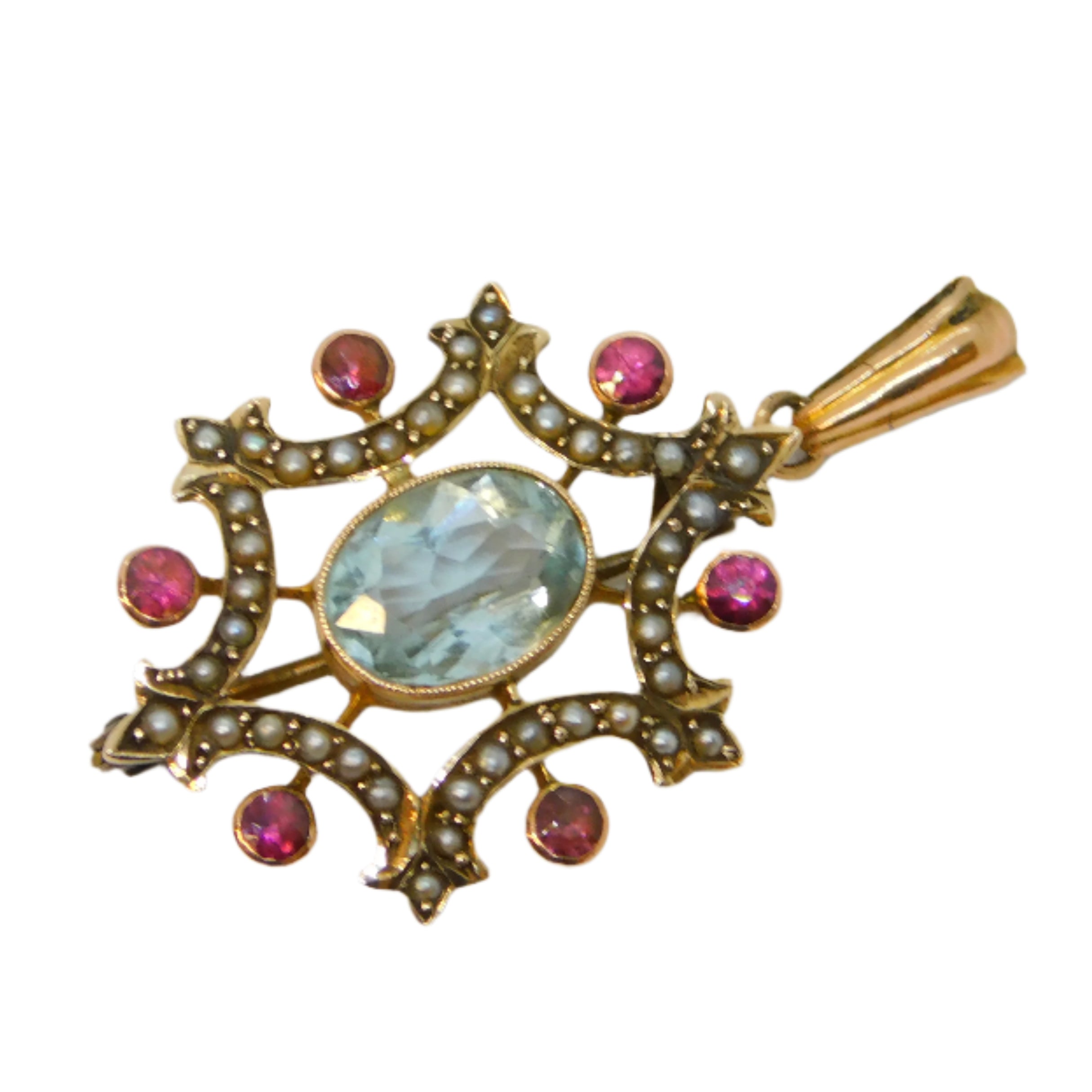 Edwardian 9ct Gold, Aquamarine, Seed Pearl, Ruby Drop Pendant Antique c1910