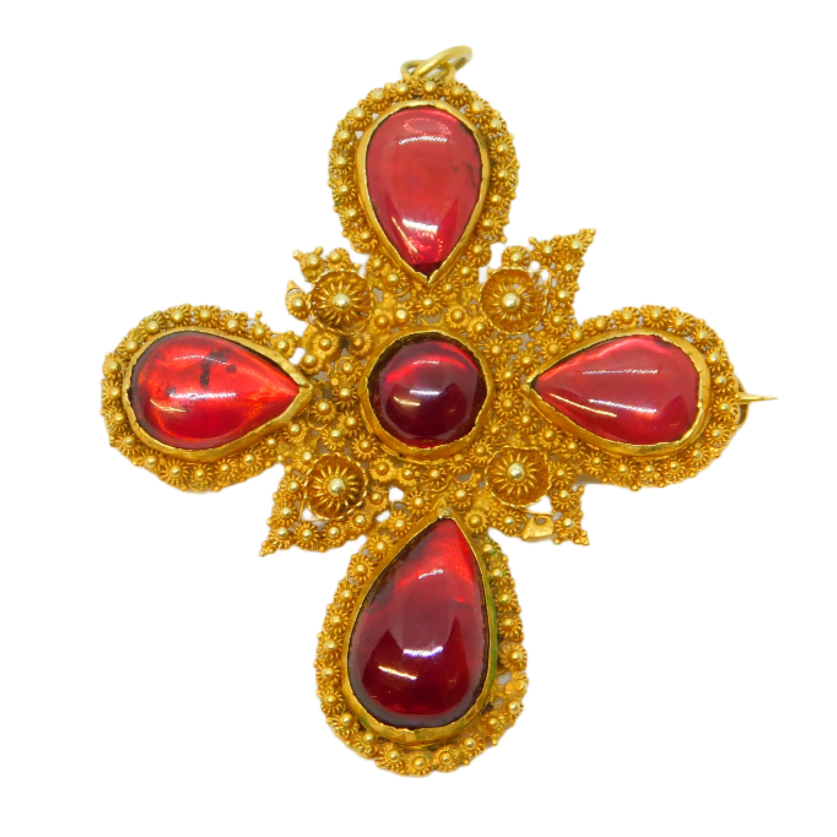 18th Century Iberian 18ct Gold Foil-Back Garnet Cannetille Cross Pendant Antique c1790