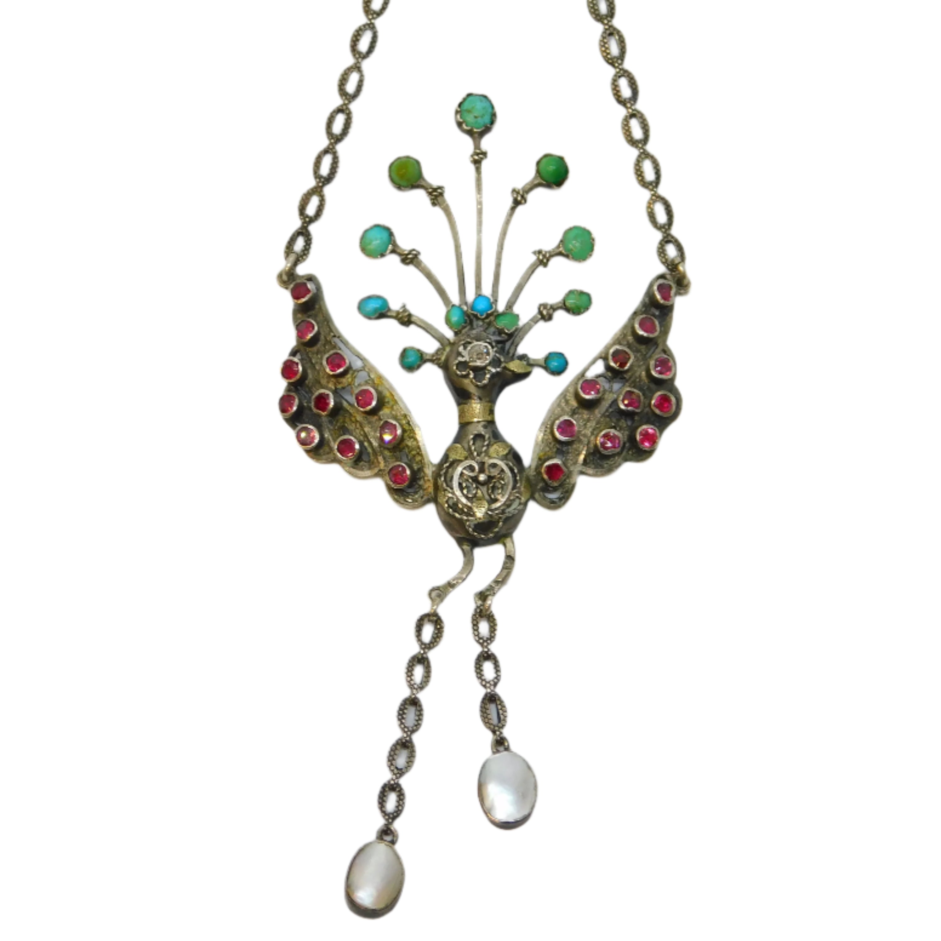 19th Century Austro-Hungarian Silver, Ruby, Diamond, Turquoise & Pearl Peacock Drop Pendant c1860
