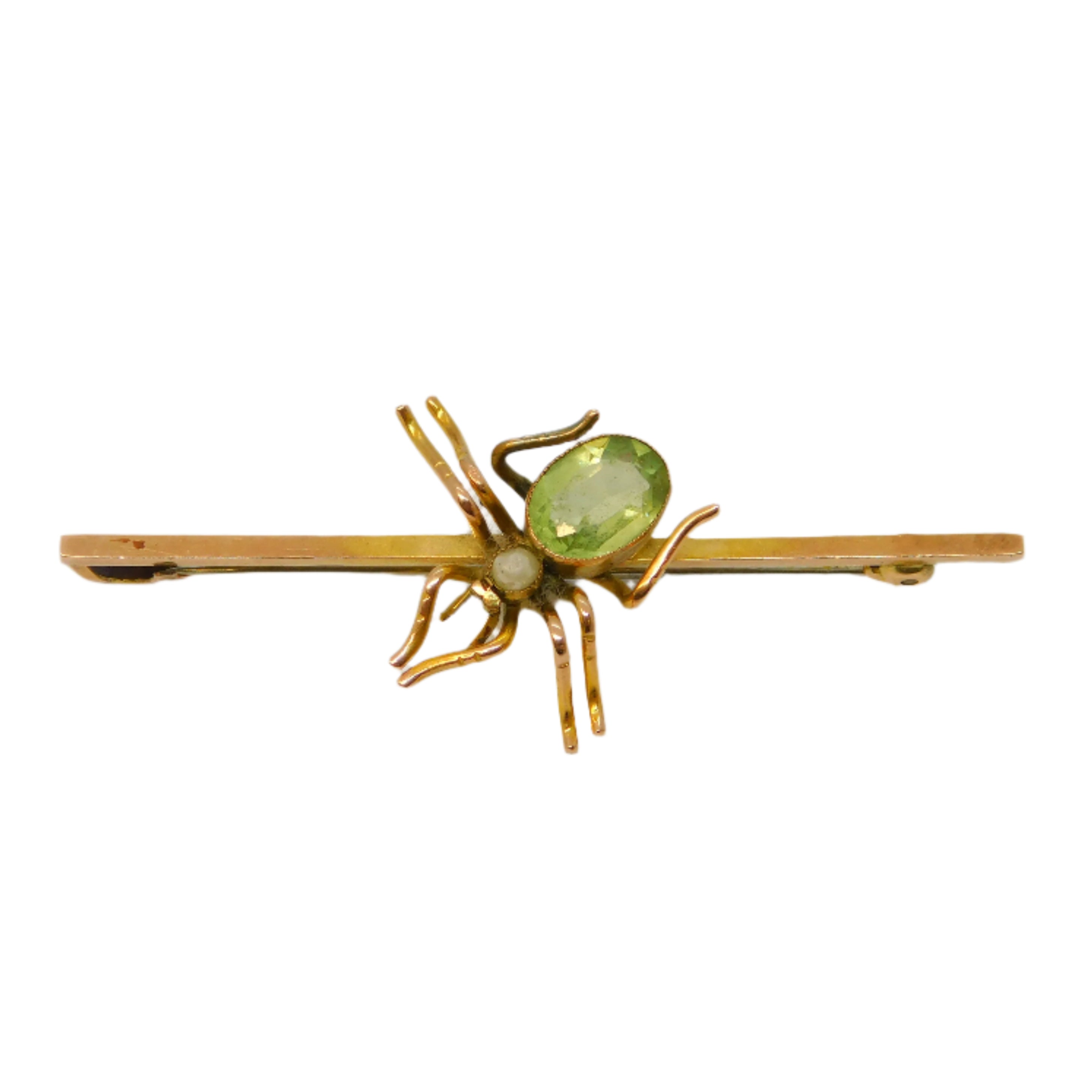 Edwardian 9ct Gold, Peridot & Seed Pearl Spider Insect Brooch Antique c1910
