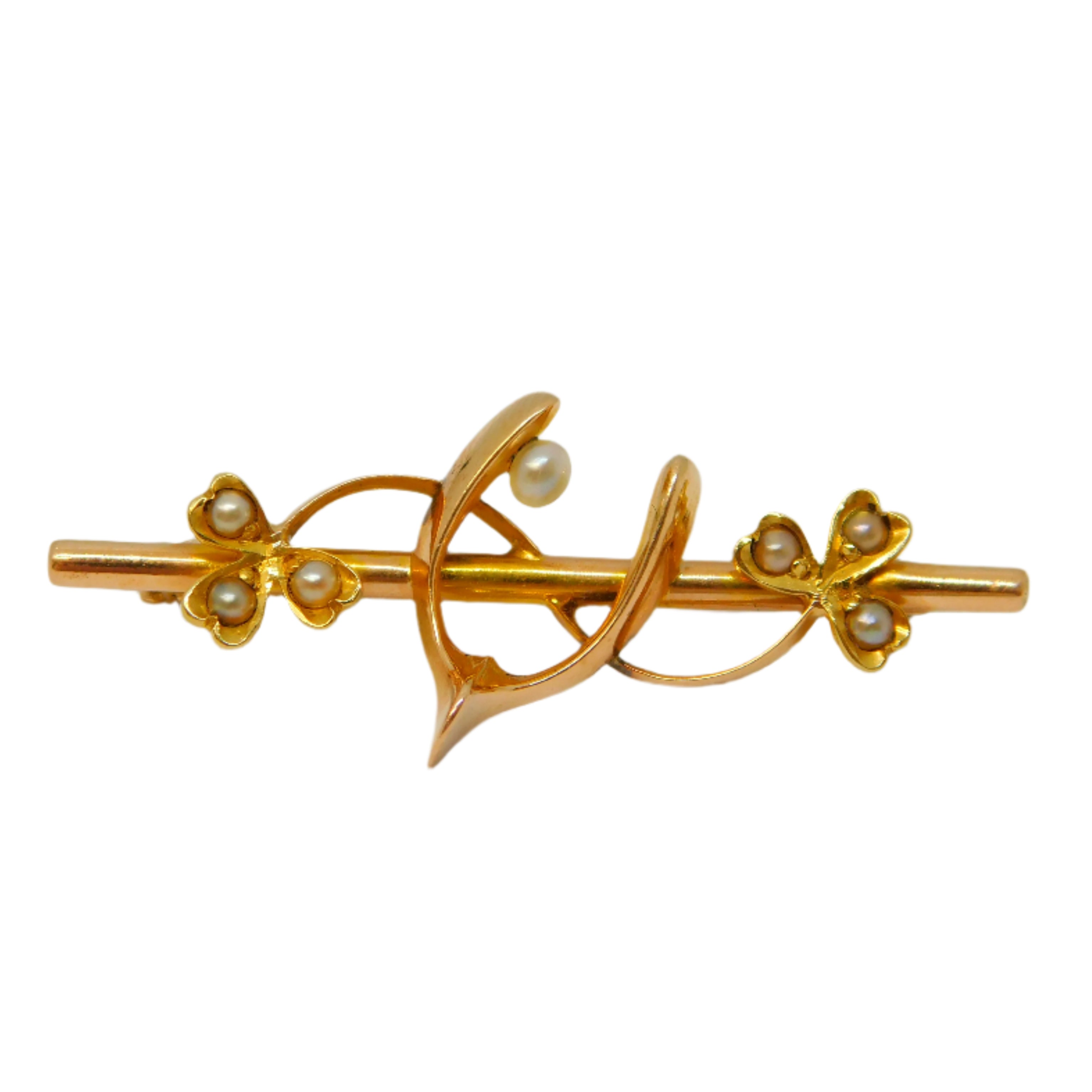 Edwardian 15ct Gold & Seed Pearl Wishbone Sweetheart Brooch Antique c1910