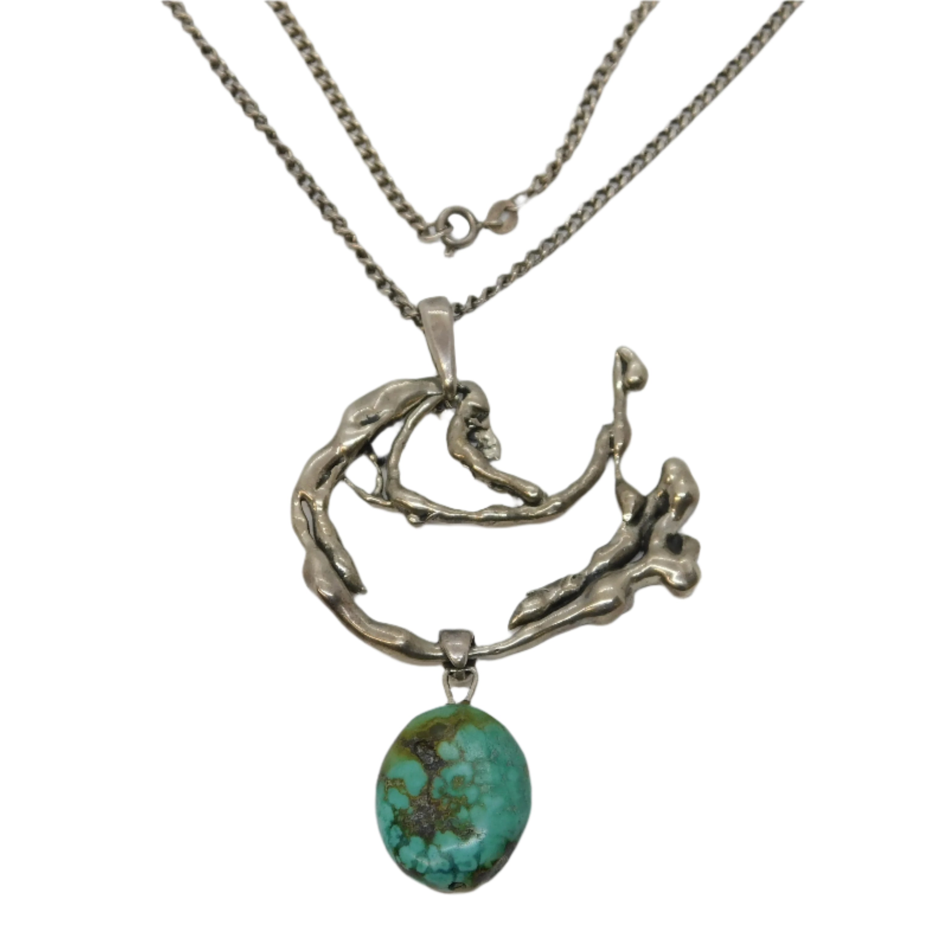 Austro-Hungarian Style Sterling Silver, Raw Turquoise Abstract Pendant Necklace