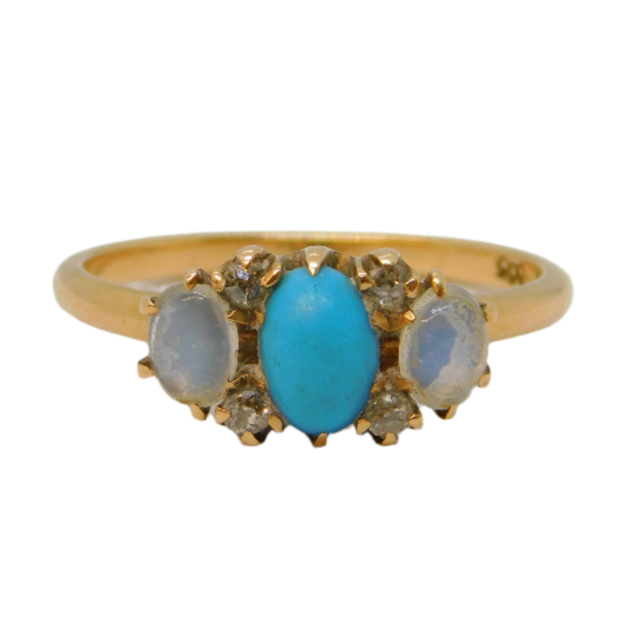 9ct Rose Gold, Turquoise, Moonstone & Diamond Dress Ring Antique c1930 Deco