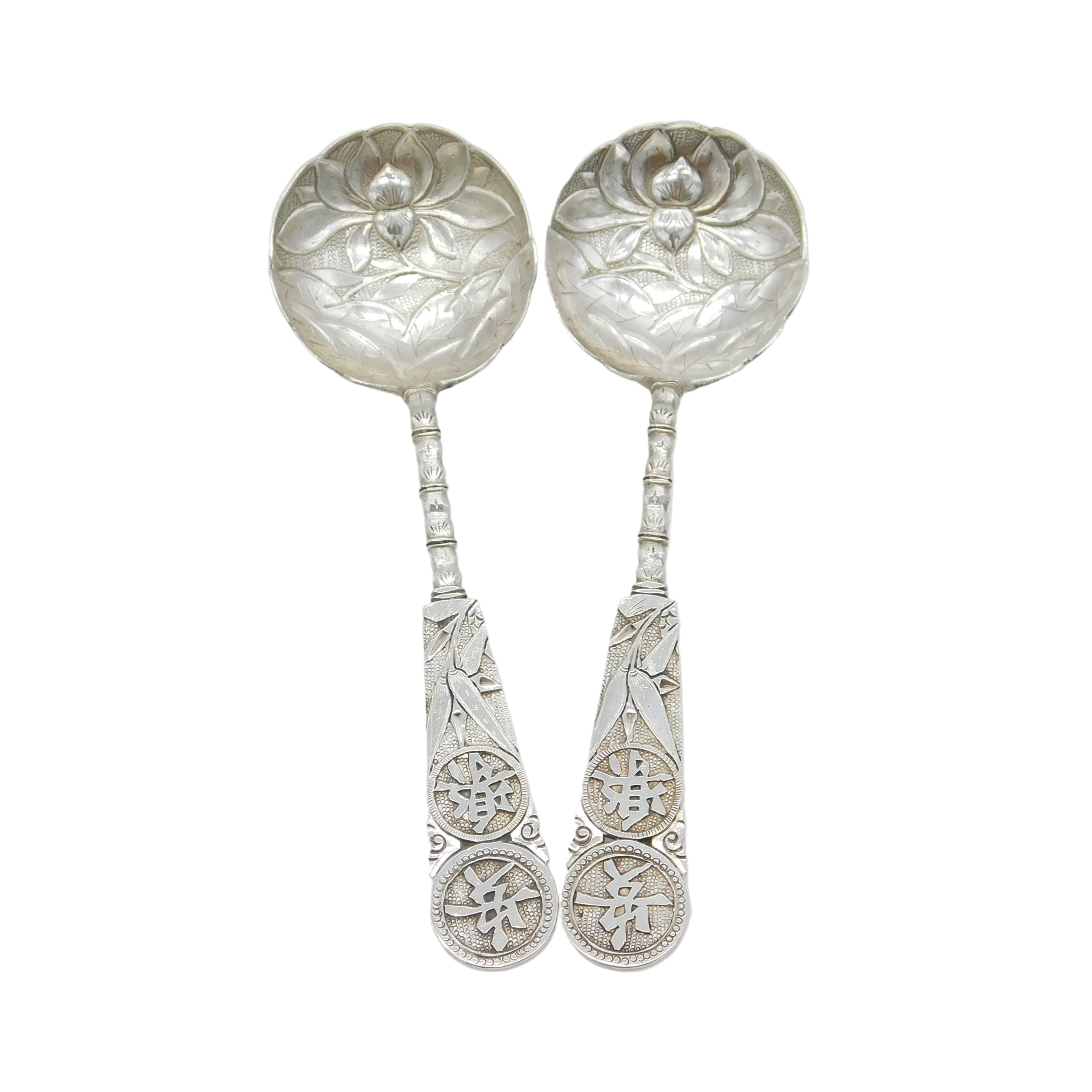 19th Century Chinese Pair of Sterling Silver Floral Teaspoons Antique c1880