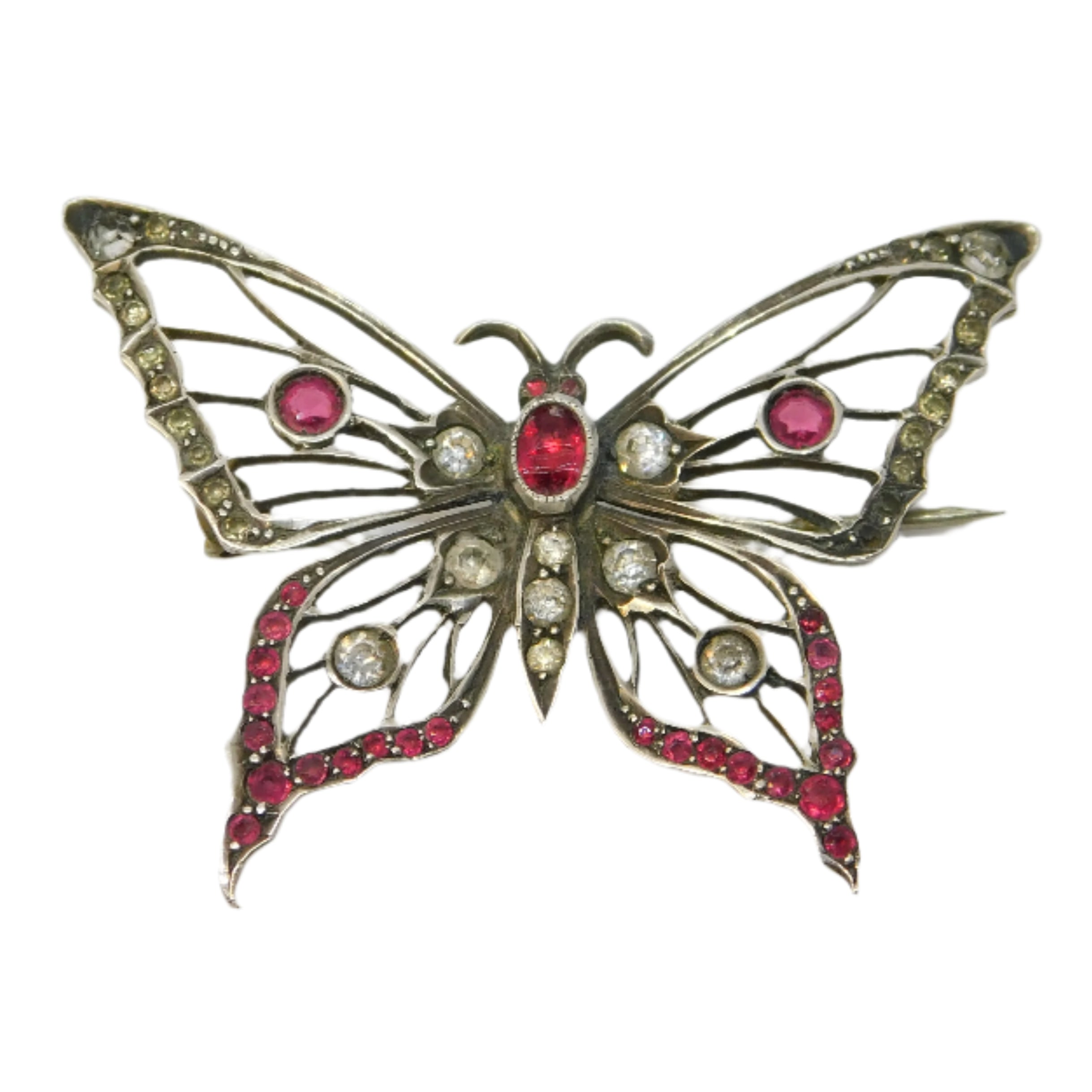 19th Century .800 Silver Red-White Paste Set Butterfly Brooch Antique c1860