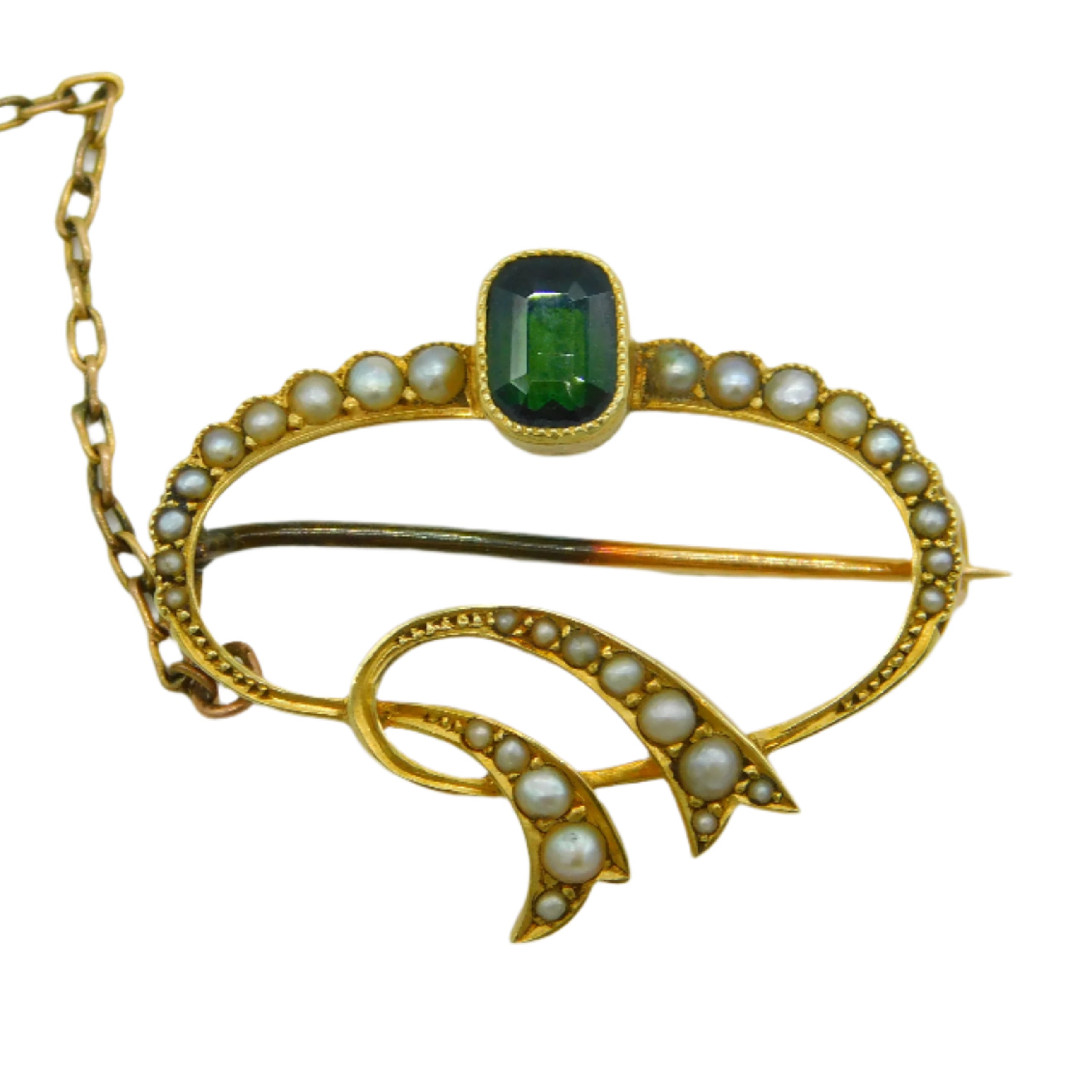 Edwardian 15ct Gold, Emerald Cut Tourmaline, Seed Pearl Spray Brooch Antique c1910