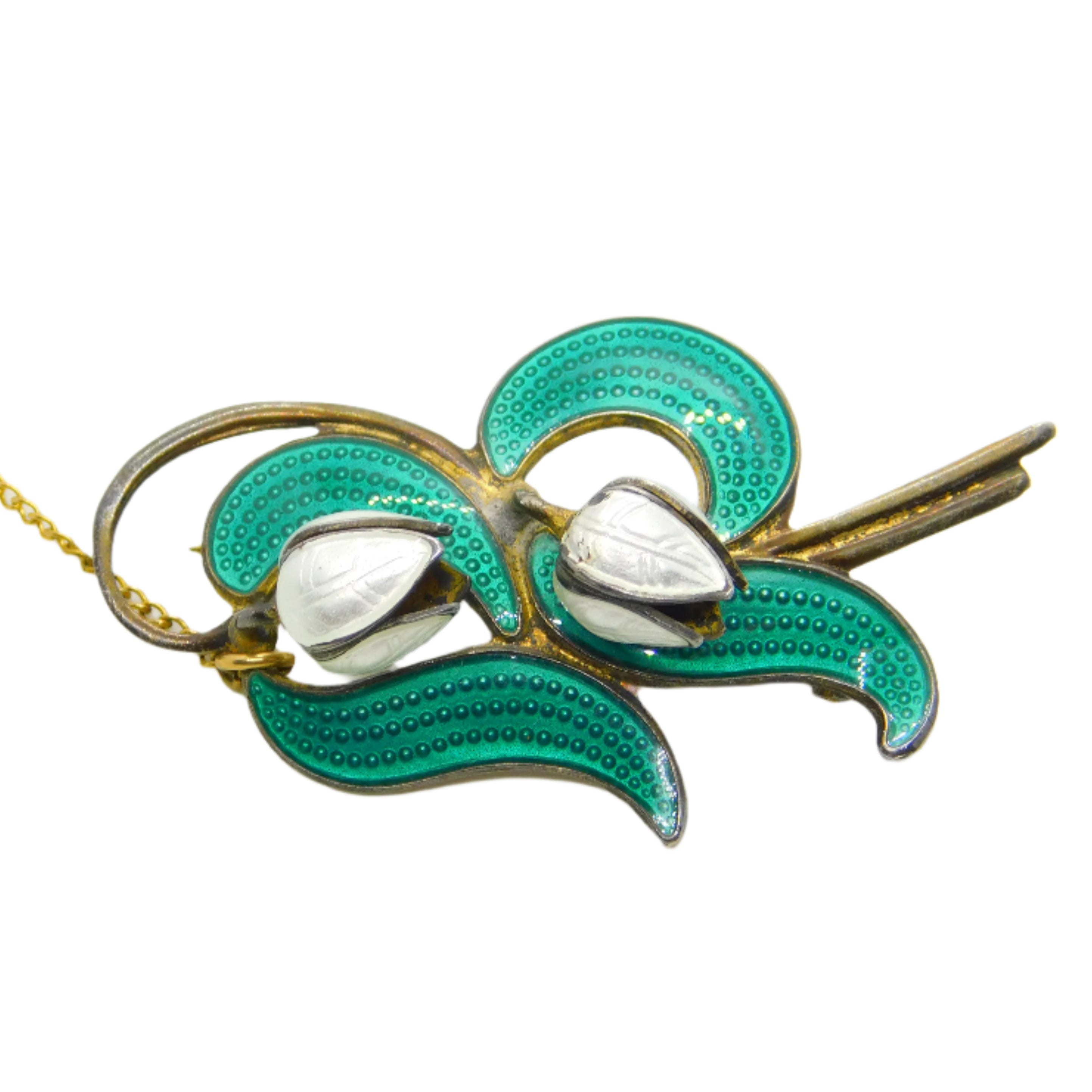 Norwegian Aksel Holmsen Sterling Silver Enamel Snowdrop Flower Brooch Antique c1940