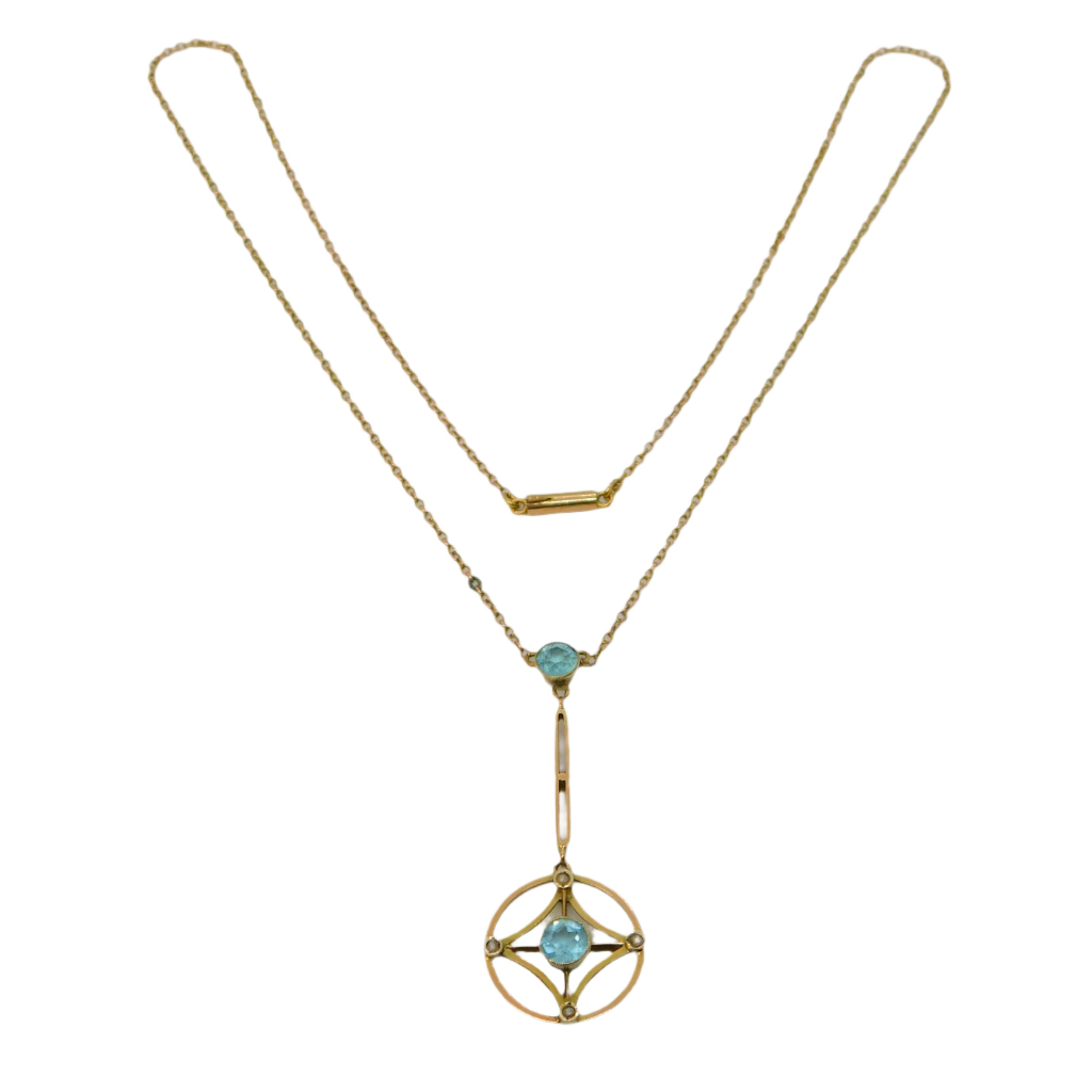 Edwardian 9ct Gold, Seed Pearl & Blue Stone Lavalier Drop Necklace Antique c1910