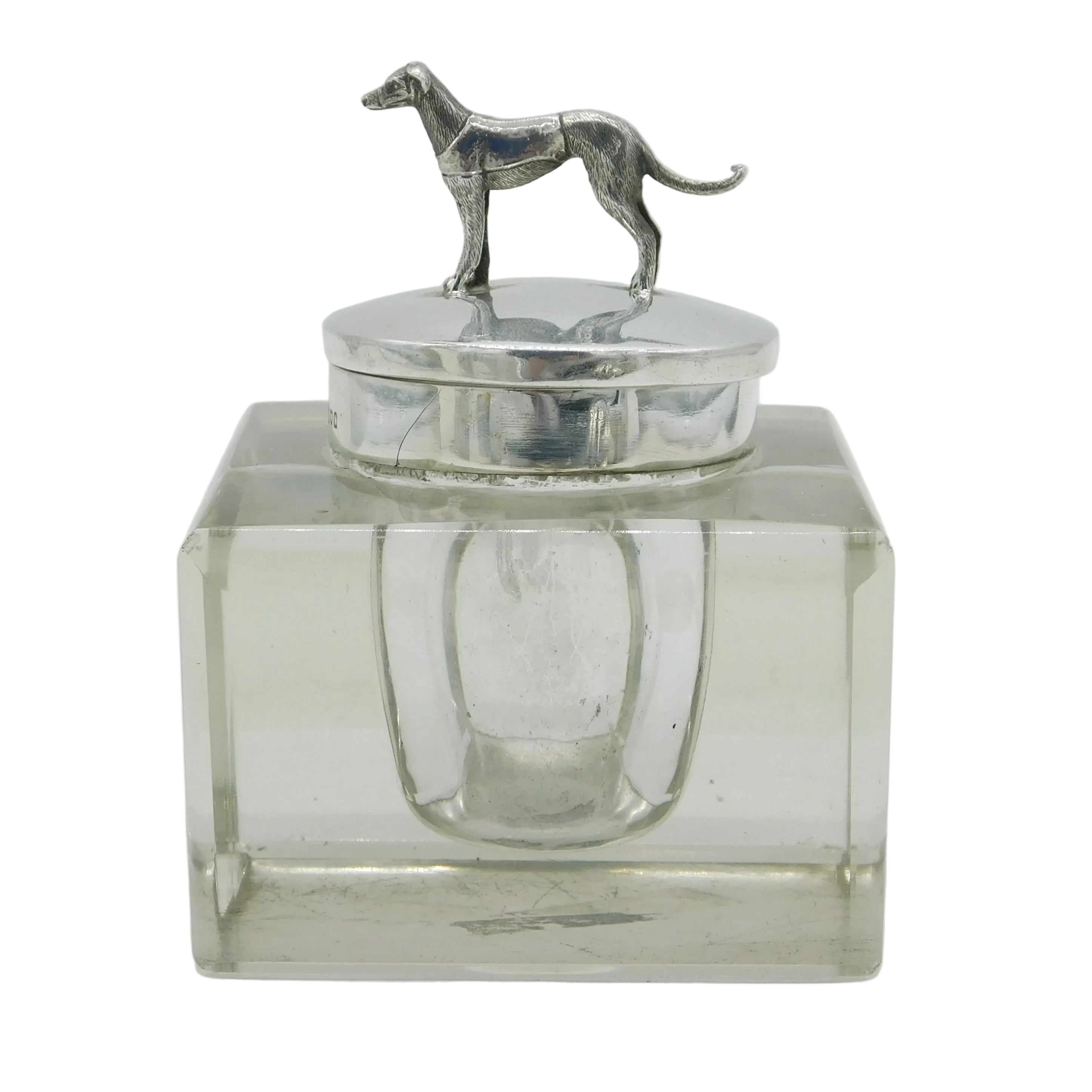 Edwardian Sterling Silver Mounted Glass Greyhound Racing Inkwell Antique 1909 Birmingham