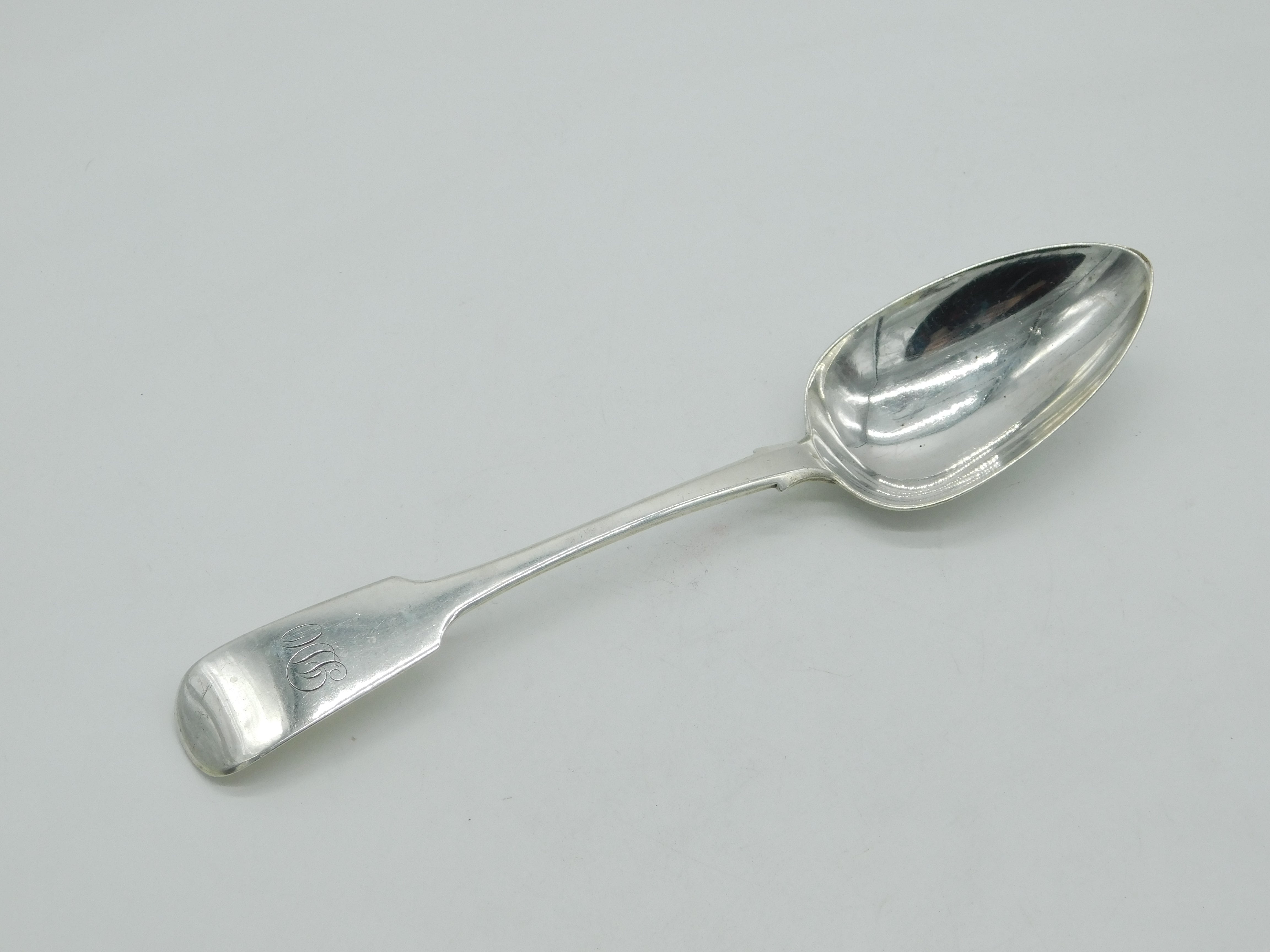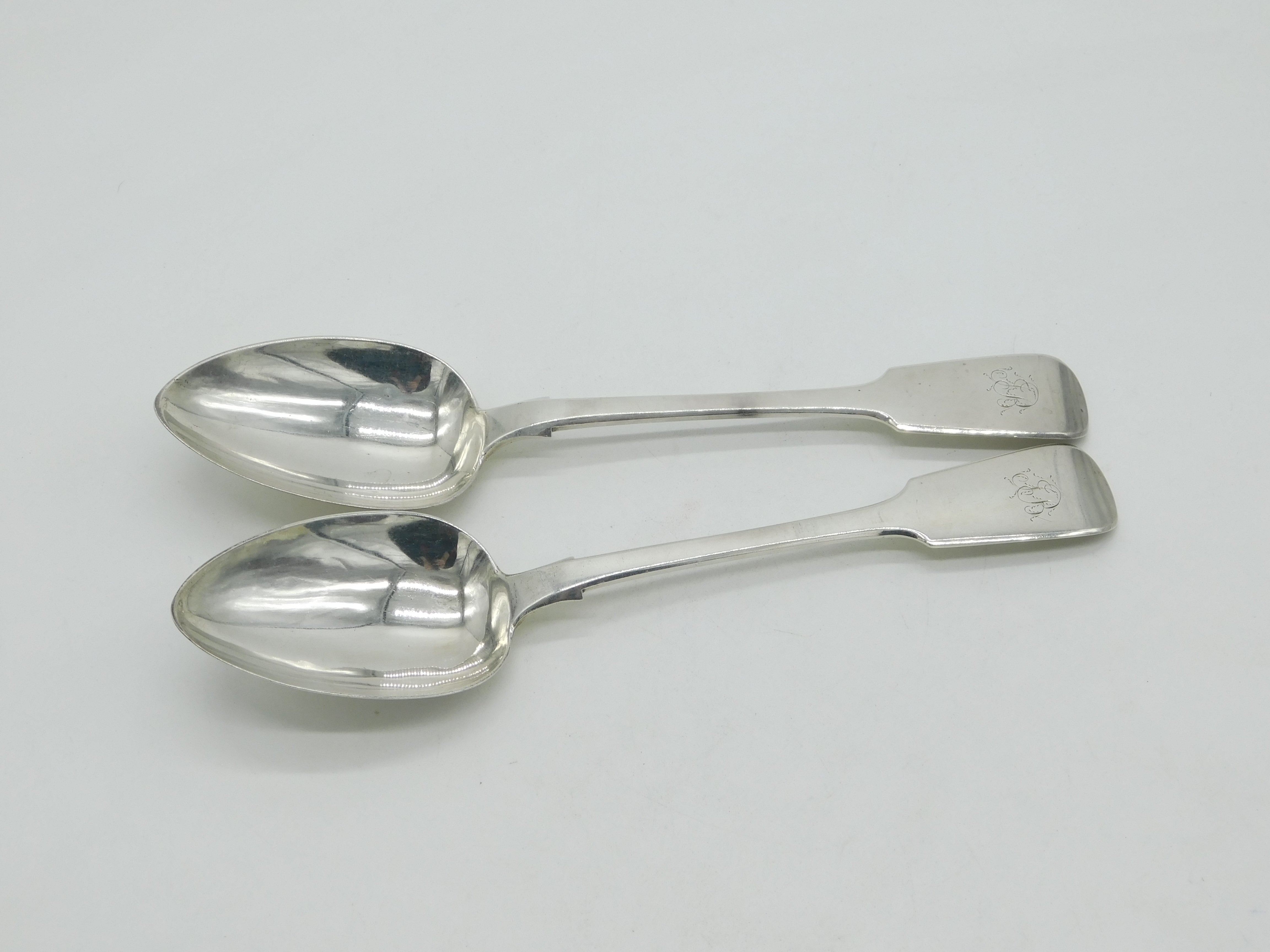 Irish Victorian Sterling Silver Fiddle Pattern Serving Spoon Pair Antique 1843 Dublin