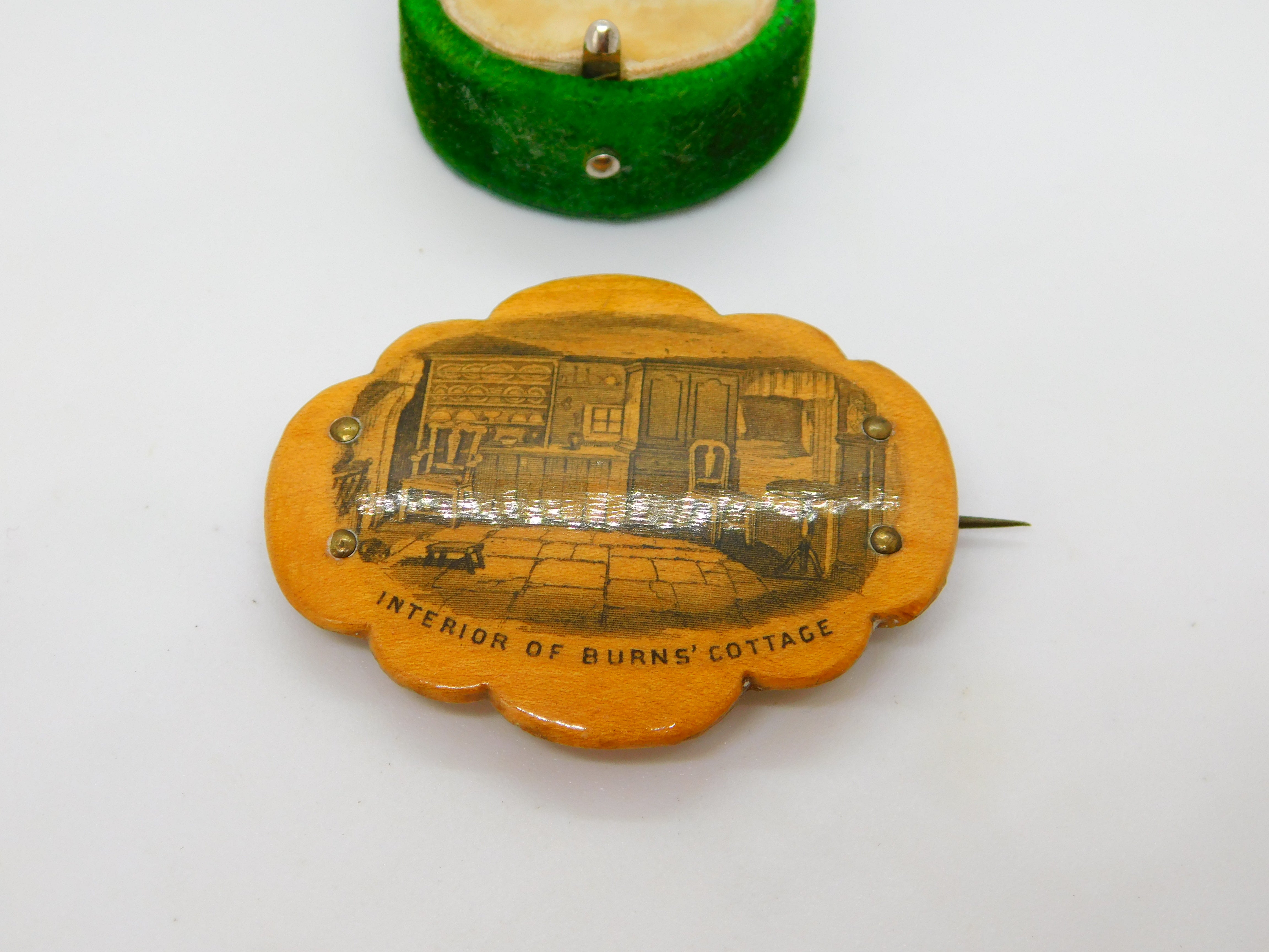Mauchline Ware 'Interior of Burns' Cottage' Brooch Pin Antique c1890 Scottish