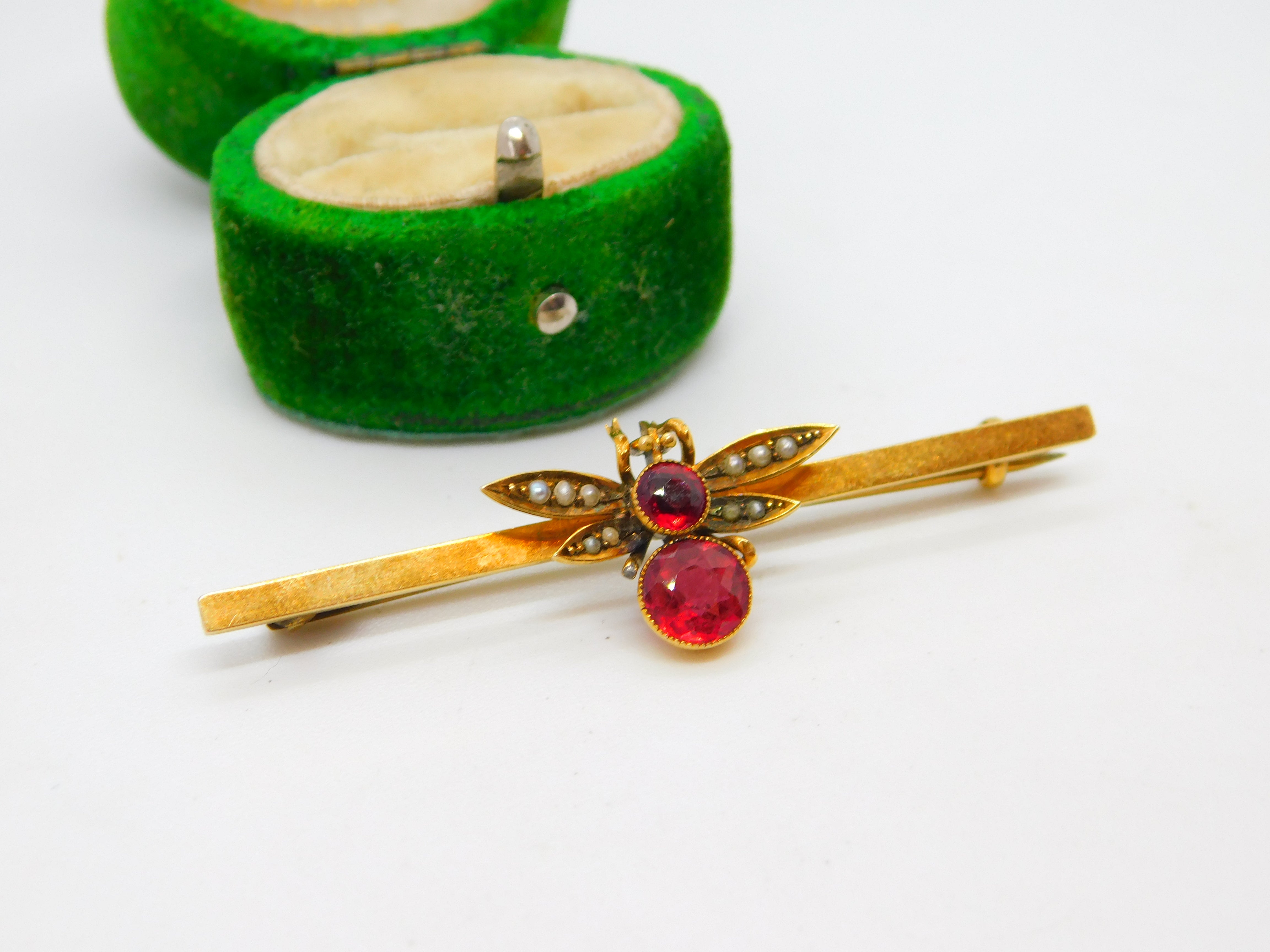 Edwardian 9ct Gold, Paste & Seed Pearl Set Insect or Bug Brooch Antique c1910